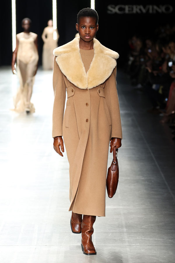 A striking interplay between softness and structure was at the heart of the collection. Chunky hand-knitted pieces were transformed into shearling jackets, layered effortlessly over delicate chiffon dresses. Shearling robe coats enveloped airy split dresses, adorned with crystal embroidery, creating a dynamic balance between intimacy and determination.