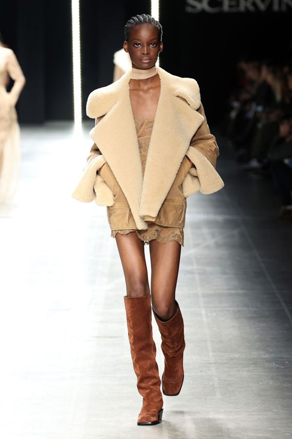 Embroideries, a pillar of Ermanno Scervino’s DNA, took center stage, not as mere embellishments but as fundamental design elements. Leather embroideries adorned shearling, suede, and nappa jackets and bags, while the petit-point technique brought intricate detailing to sheer dresses and square-toe ballerina flats.