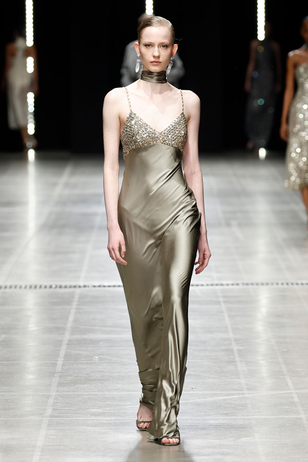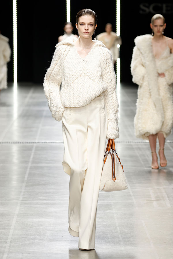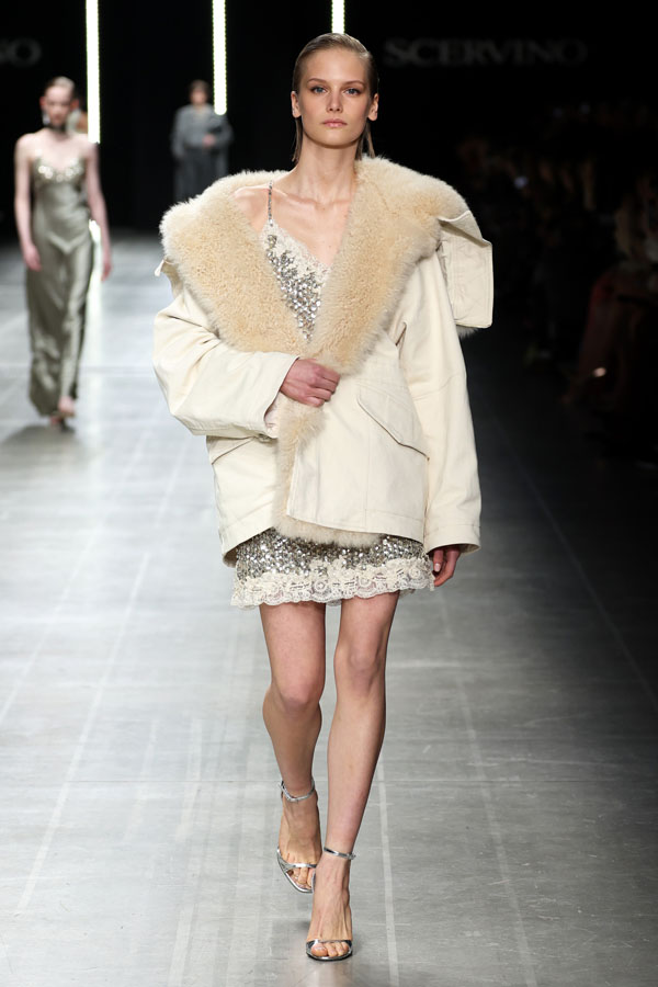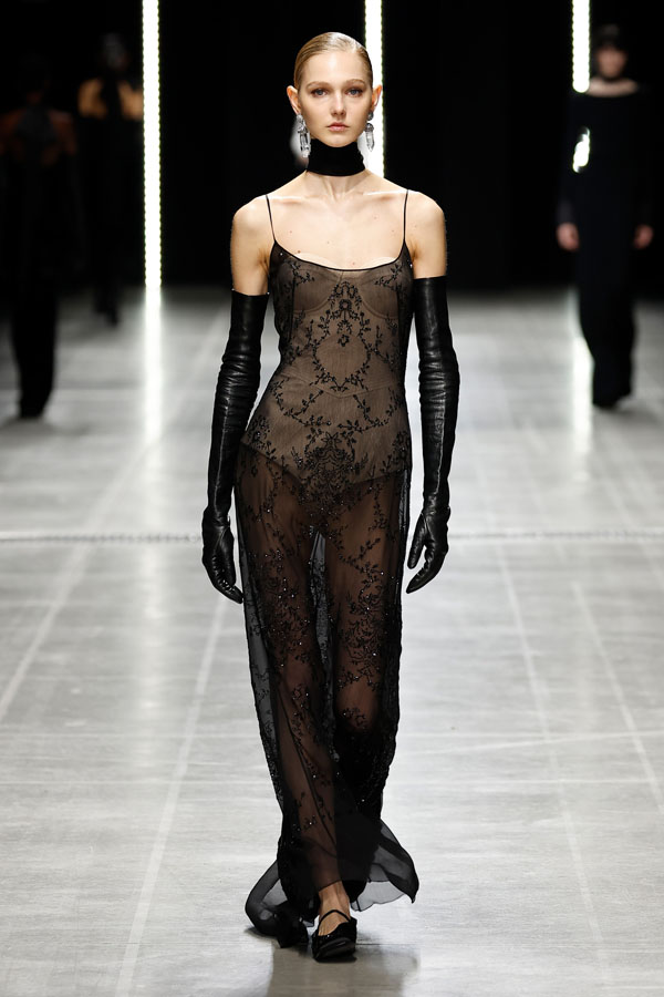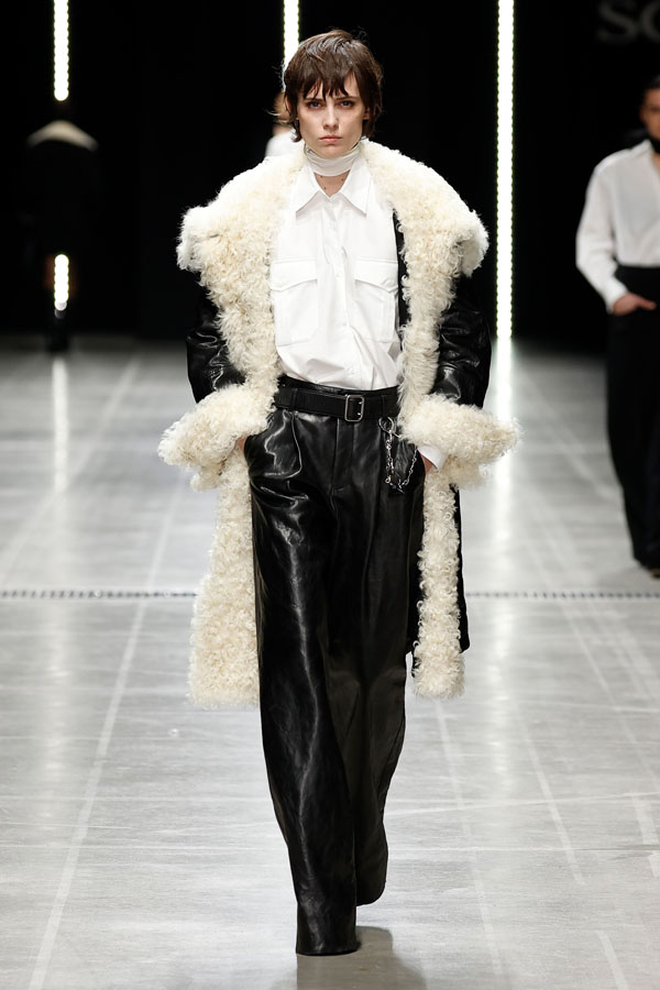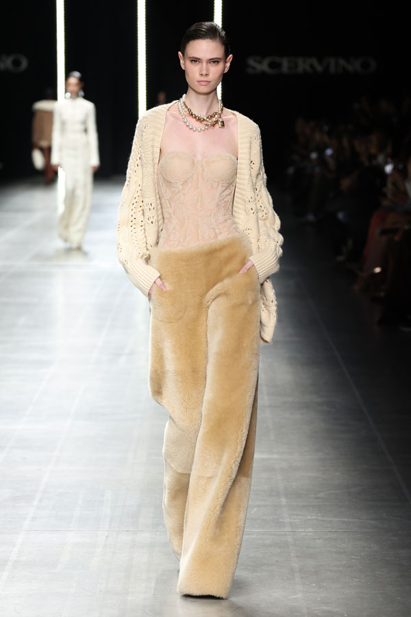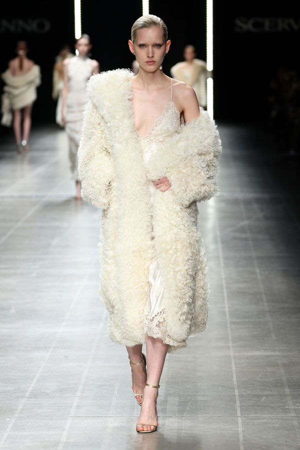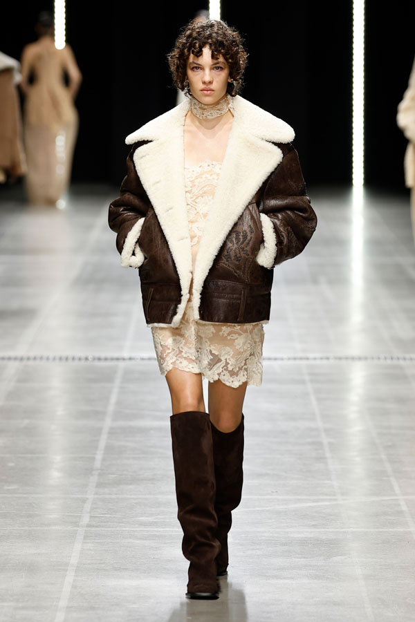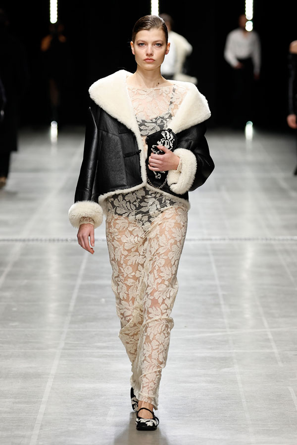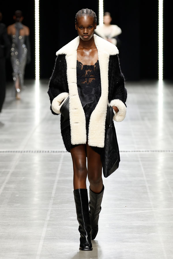 A striking interplay between softness and structure was at the heart of the collection. Chunky hand-knitted pieces were transformed into shearling jackets, layered effortlessly over delicate chiffon dresses. Shearling robe coats enveloped airy split dresses, adorned with crystal embroidery, creating a dynamic balance between intimacy and determination.