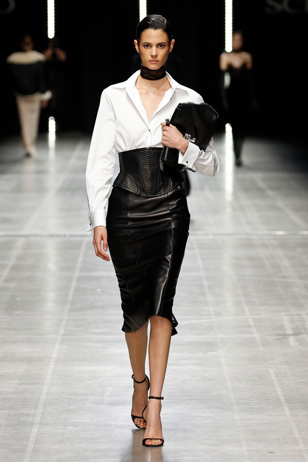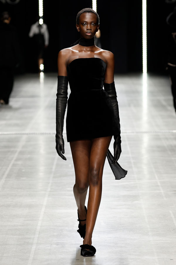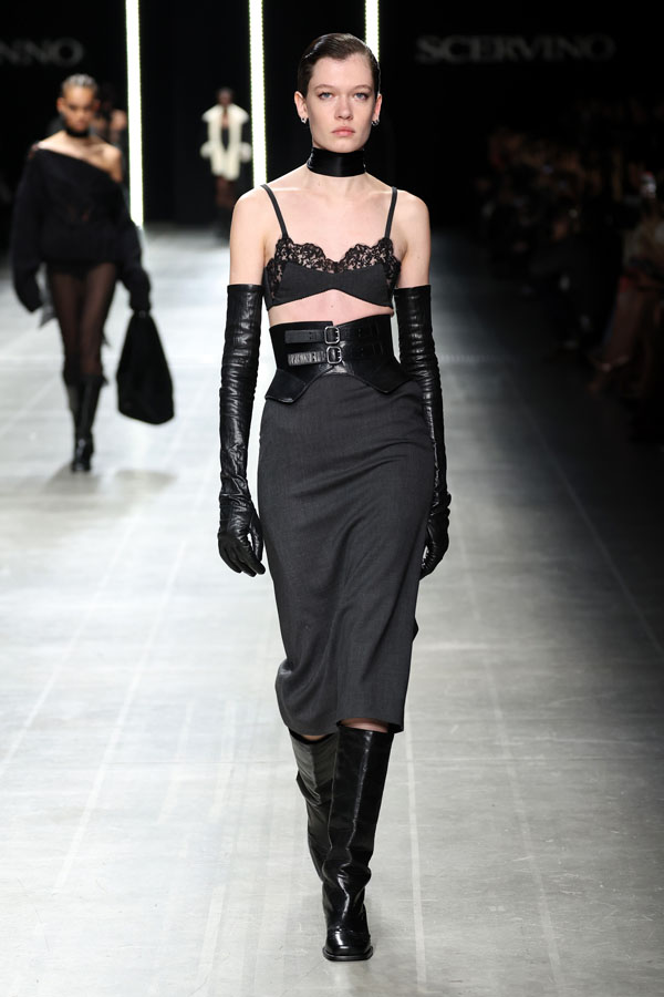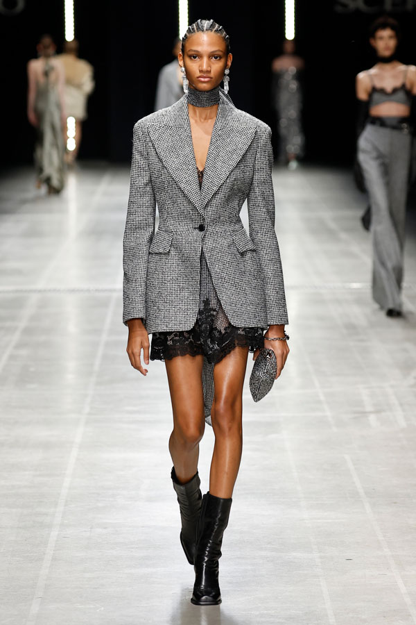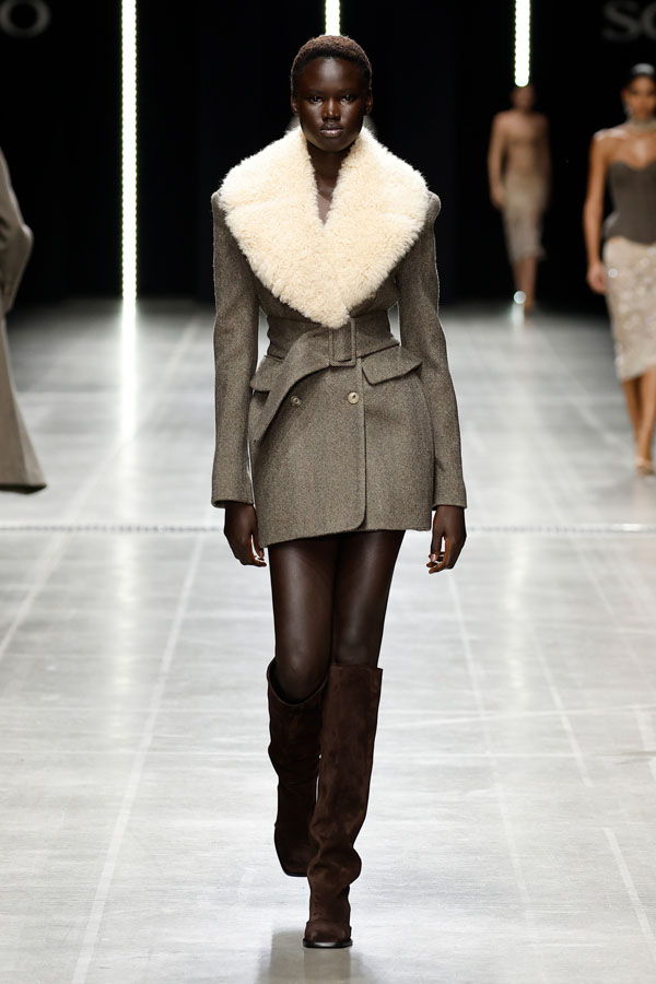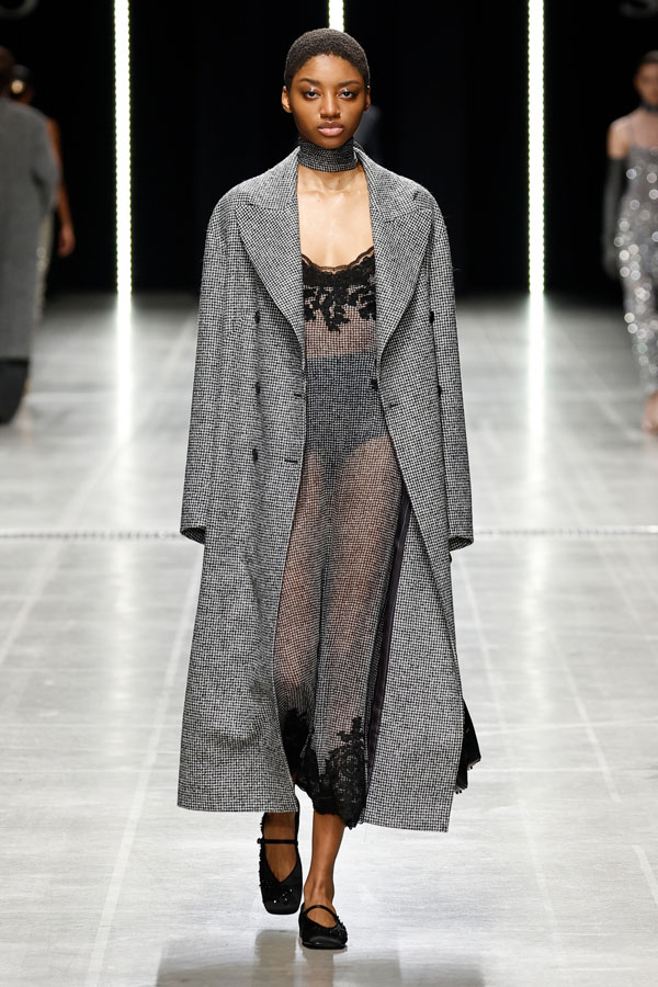 Sharp tailoring was a key theme, with structured hourglass blazers and dramatic coats crafted from sleek mannish fabrics like herringbone and houndstooth. Corsetry-inspired belts added quiet authority, cinching tube dresses embroidered with the Maison’s innovative “punto sollevato” technique, a testament to its relentless pursuit of experimental craftsmanship.