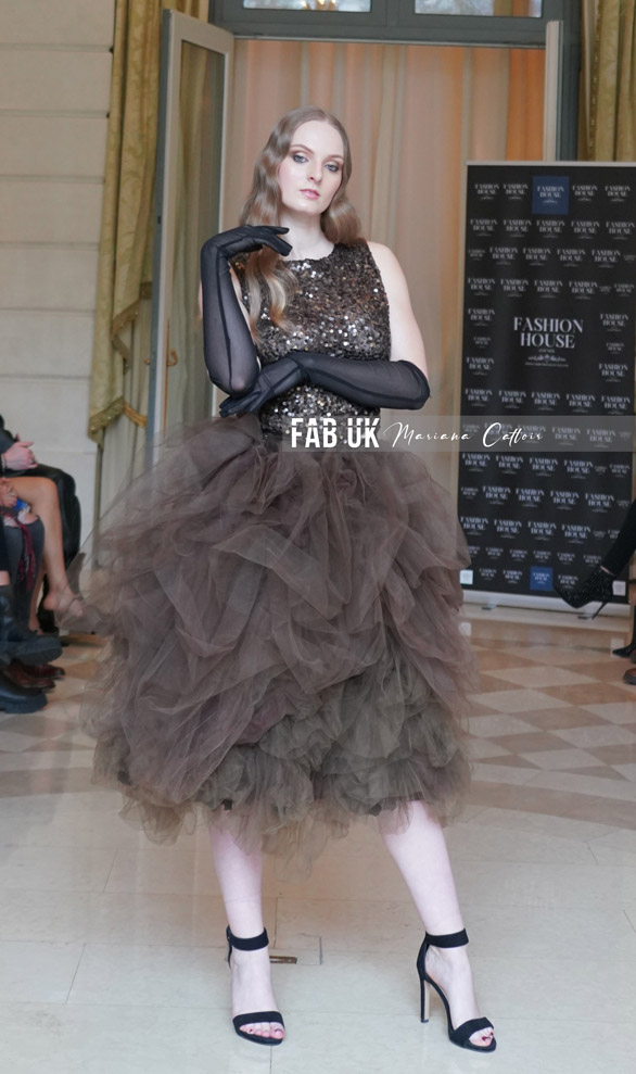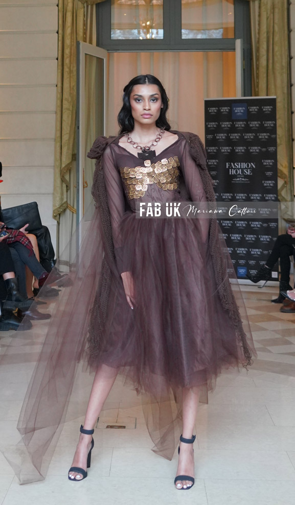 Epoka Revolution Collection Autumn/Winter “Baroque ball” presented by Fashion House Council at The Ritz Hôtel in Paris, Annette Stonnes /Mariana Cattoir presented eleven looks in a catwalk ball of ten smoky eyes models wearing transparent dresses, baroque shoes, mask, tops limited edition top mixed silk/tulle with Inka’s symbols like “Chakana”, peruvian huaylash hats, using luxury laine like Baby Alpaga in some pieces, capes and details, golden pearls broderie and applications with the brand’s logo spiral, Handmade leathers necklaces and pieces with the logo of Epoka Revolution.