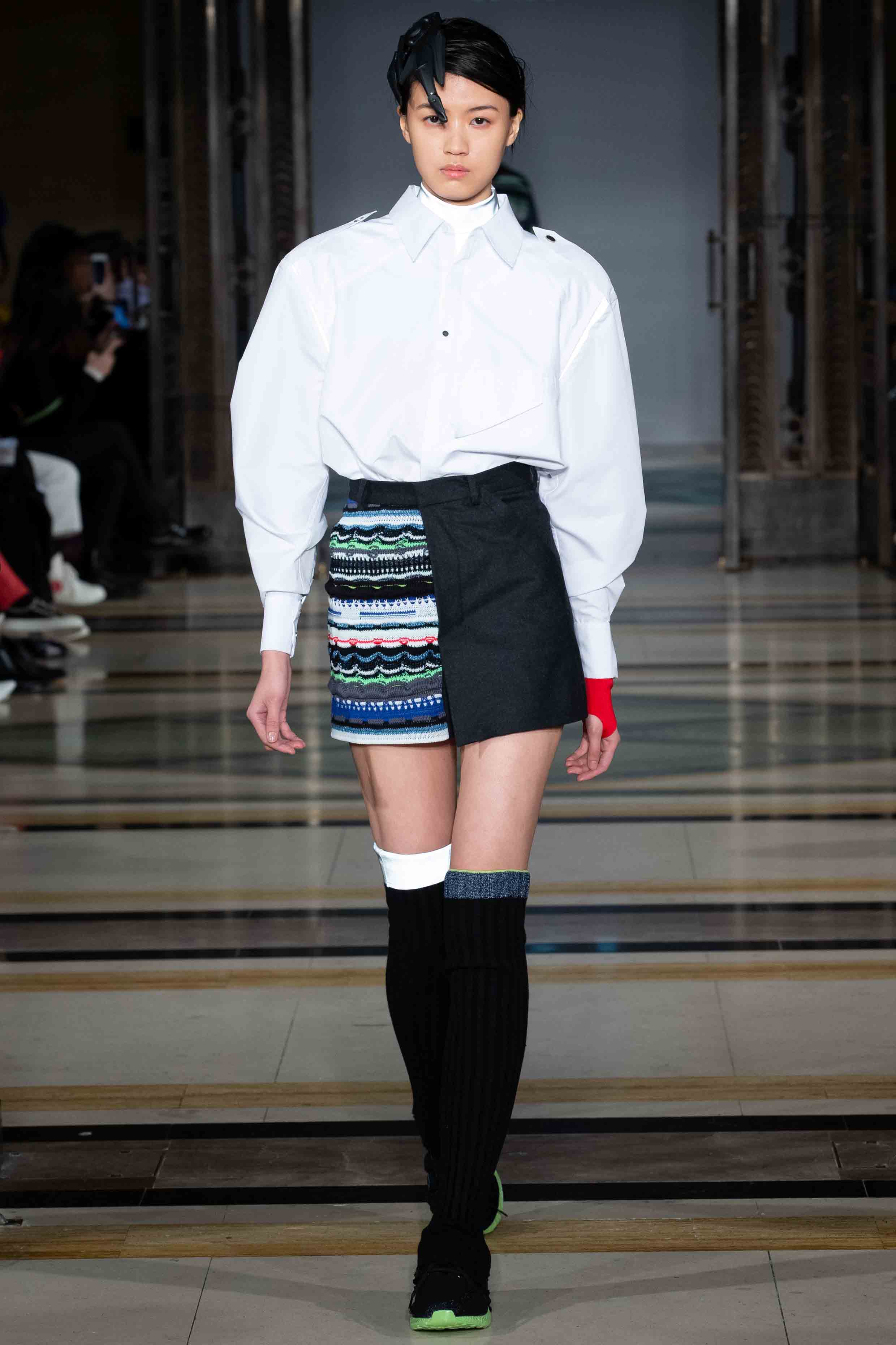 Originating from China and having lived in Sydney, Tokyo, New York and London, Shie’s eponymous label, personal identity and design aesthetic has been formed and inspired by traveling the world for over 12 years. With a background in finance and accounting, Shie has a passion for meticulous construction and sculptural silhouettes which remind her of composite index curves and cubes in financial charts and mathematical models. The label is known for its intricate use of unusual industrial materials like molded Perspex, rubber, and heat shrink industrial tubing to create its textiles and contrasting colourful embroidery and beading by haute couture techniques.