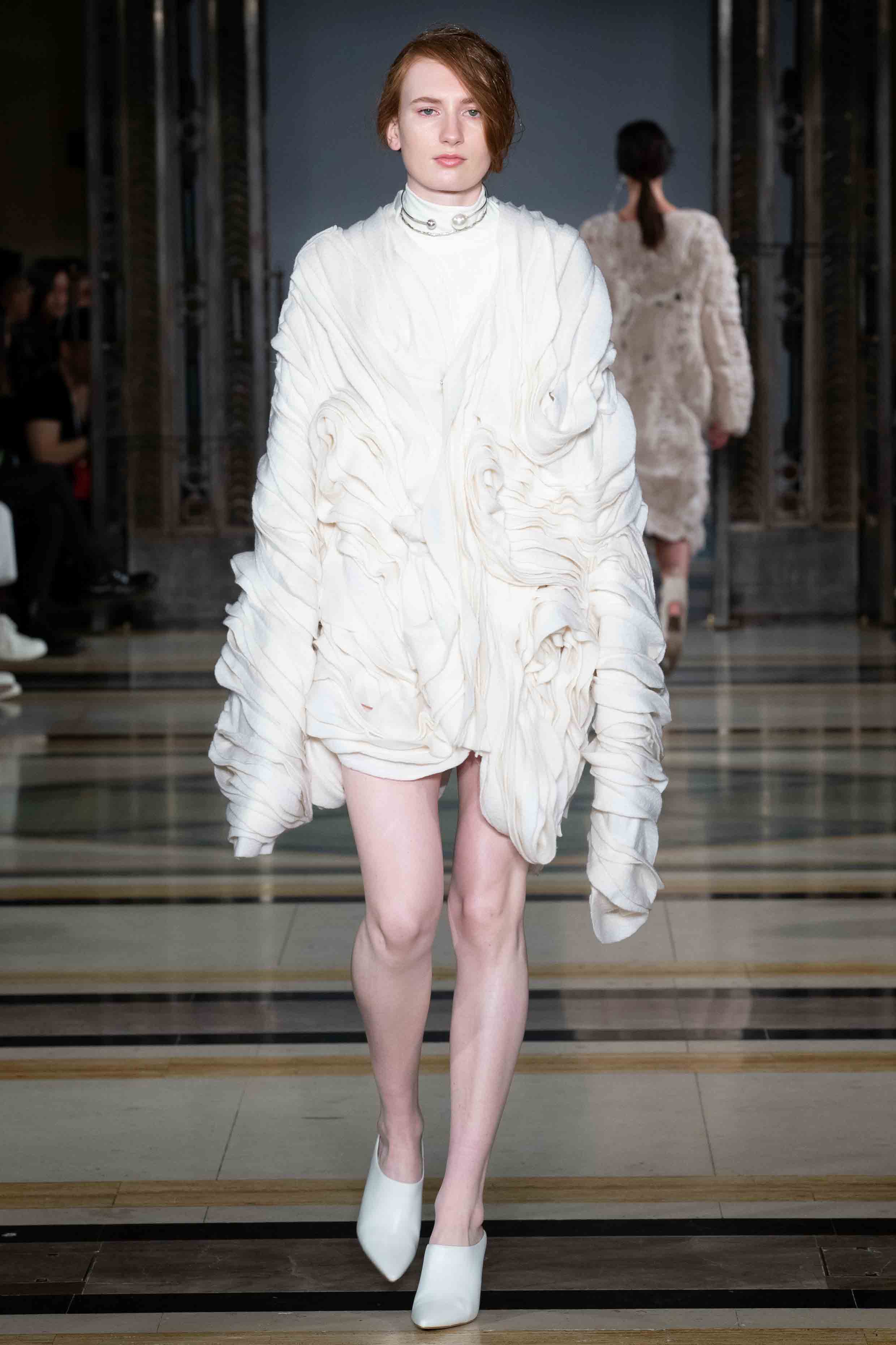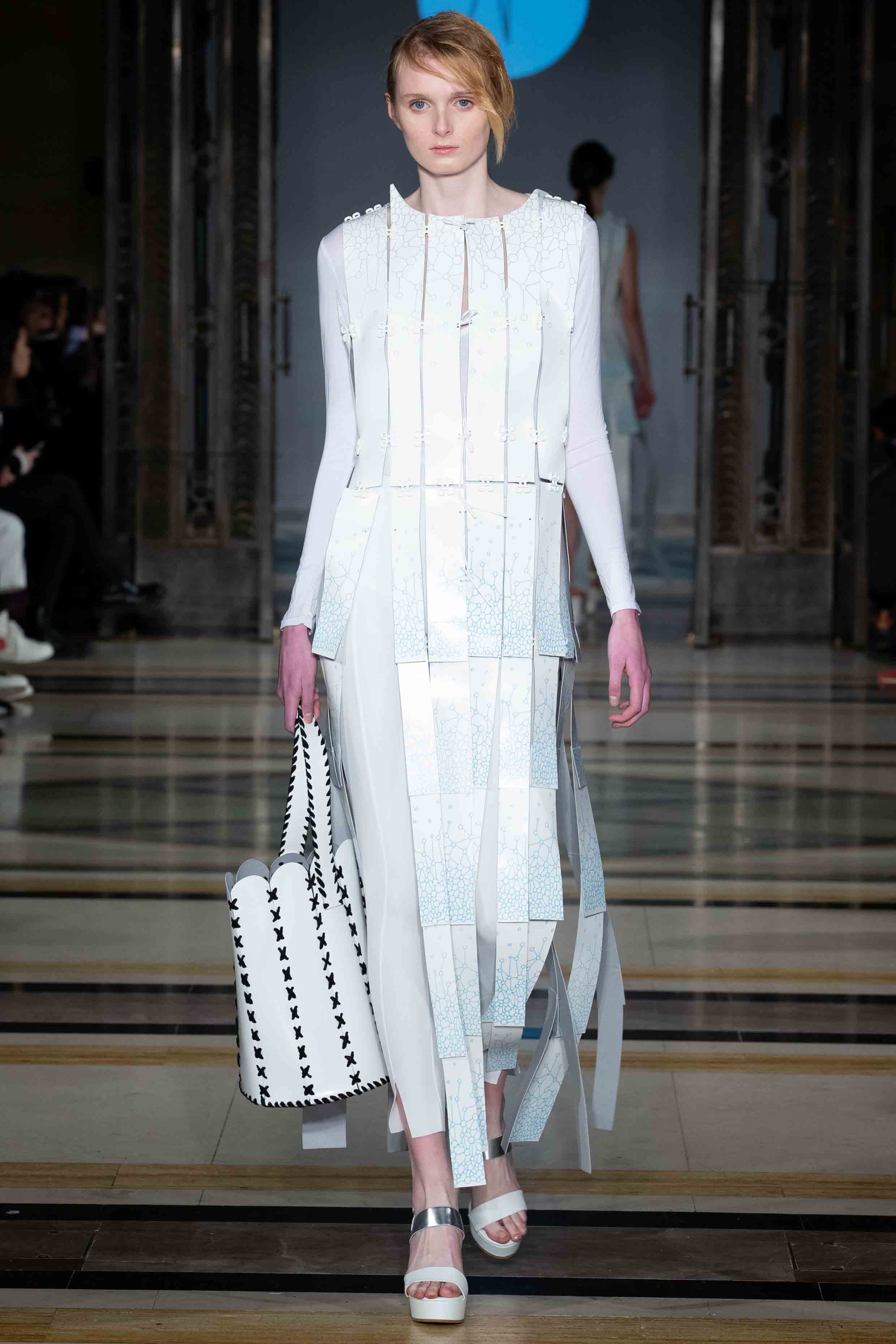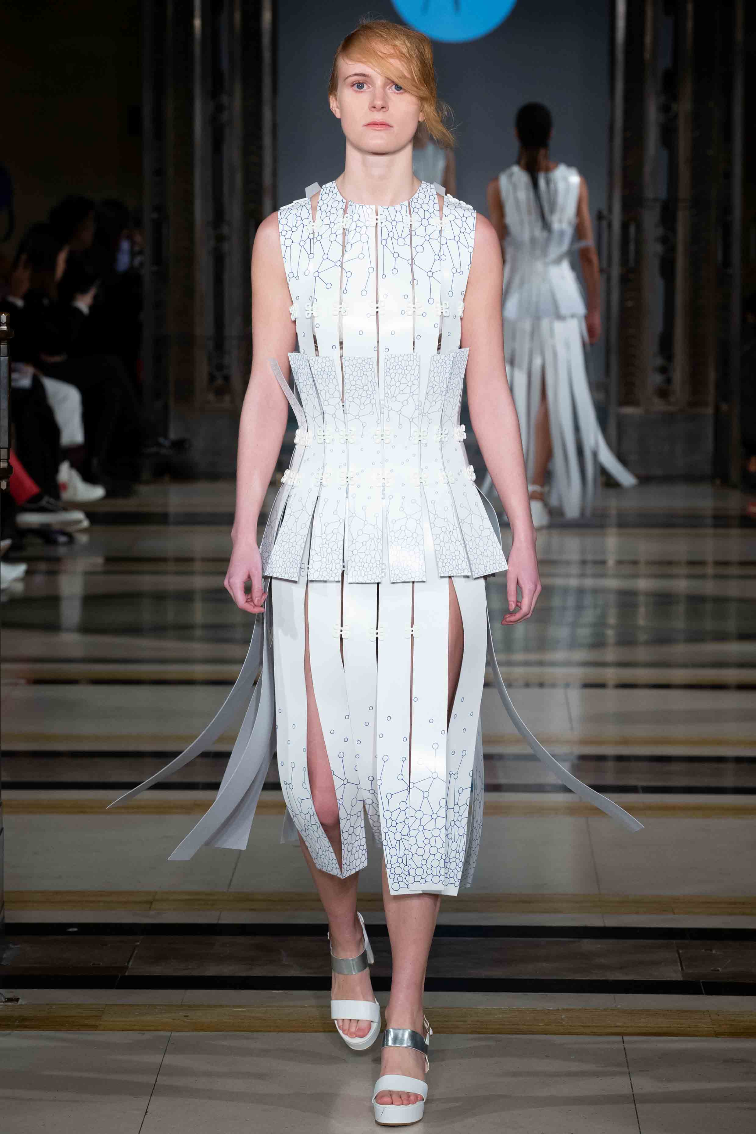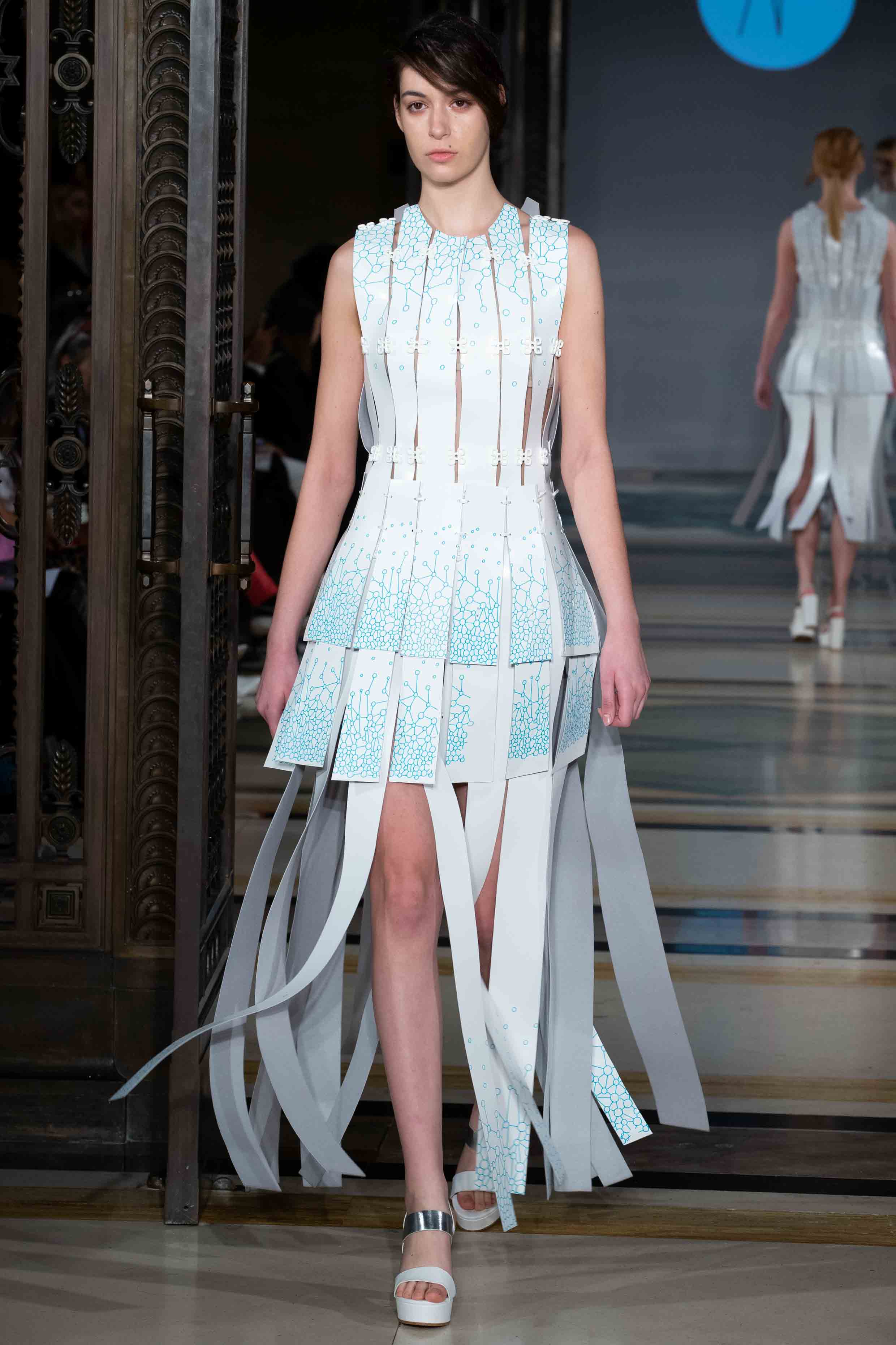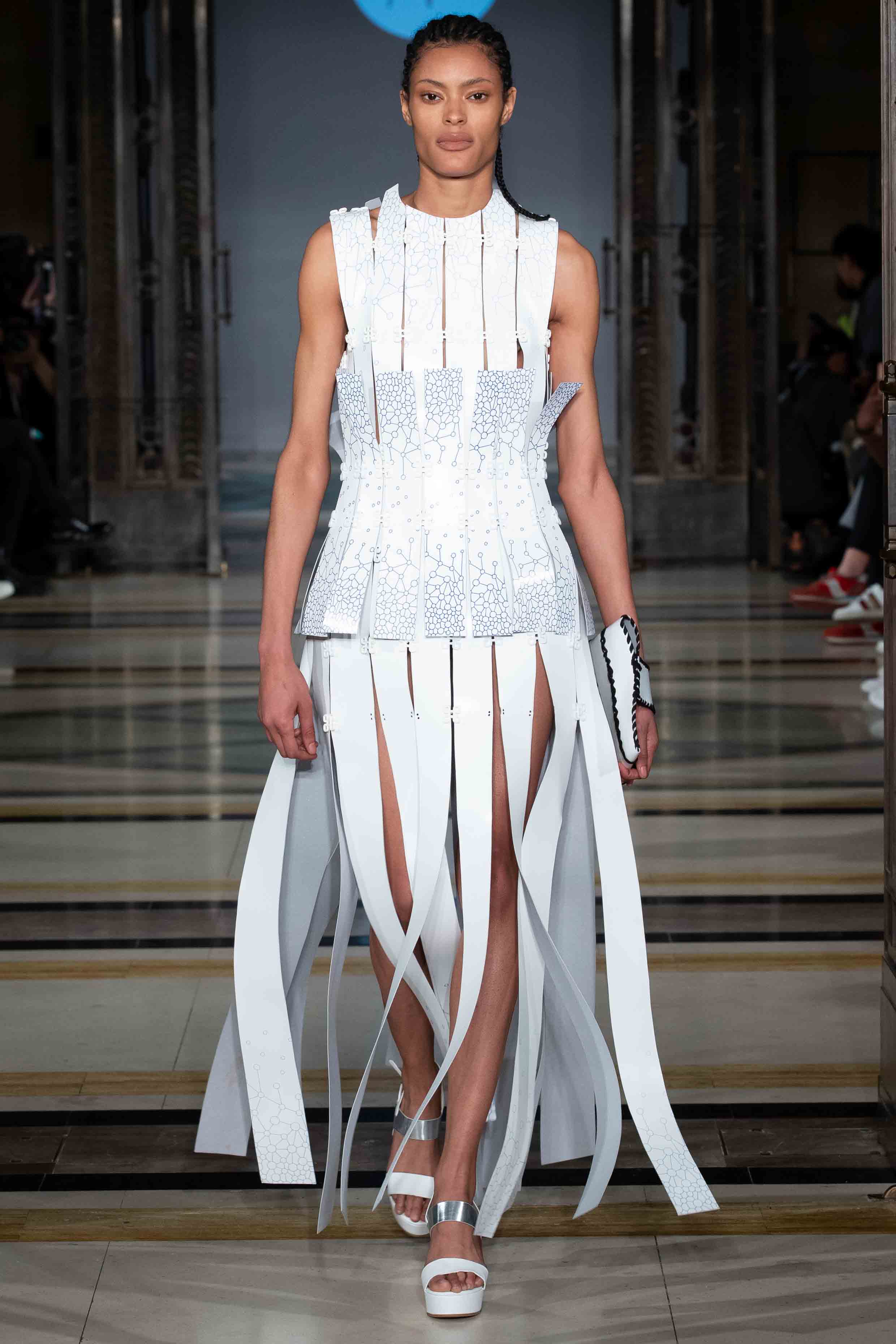 The A/W19 collection stands as utopia for the fashion of the future. A fashion that builds on technology and craft to reach sustainably and ethically produced luxury clothing. From living organism creating textiles to drawing robots, these highly feminine and textured silhouettes demonstrate how circular economy and innovation can be combined in luxury RTW and couture. The collection includes a bio-designed dress from bacteria, recycled materials and four fully recycled leather outfits, none of them being sewn together but rather linked through innovative re-usable elements that allow complete disassembly and recycling. Part II of the collection has entirely been produced through a smartphone, as a challenge to push technology boundaries in the service of sustainability.