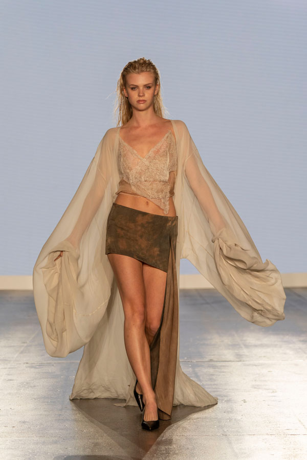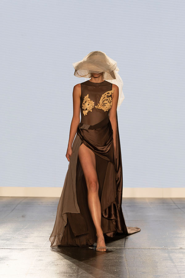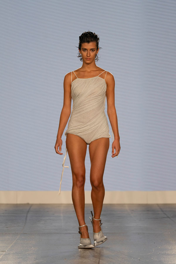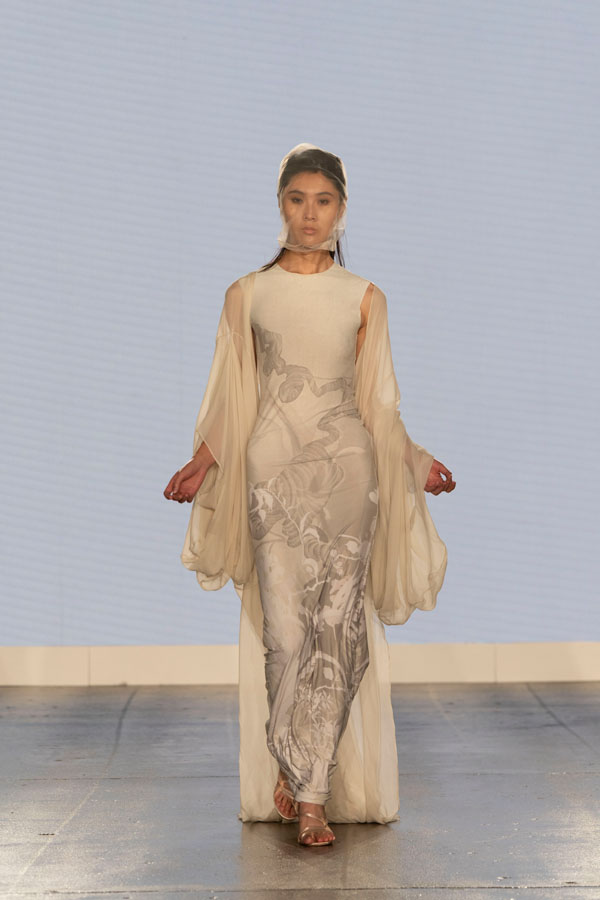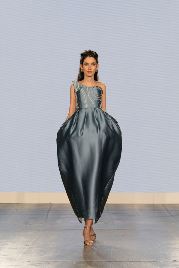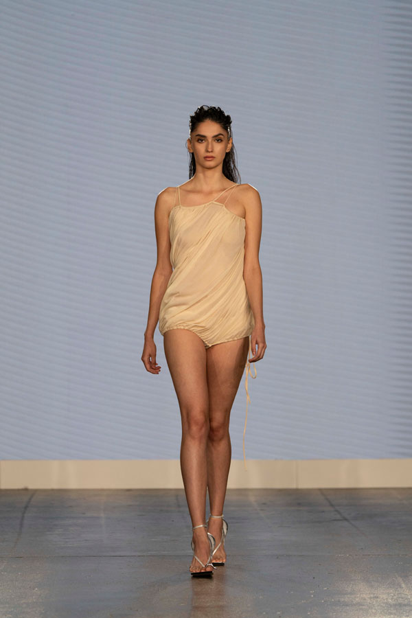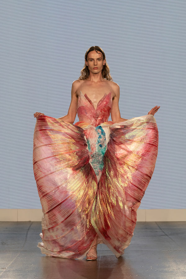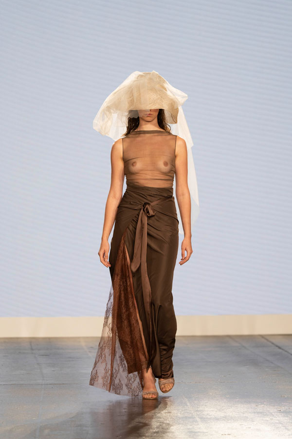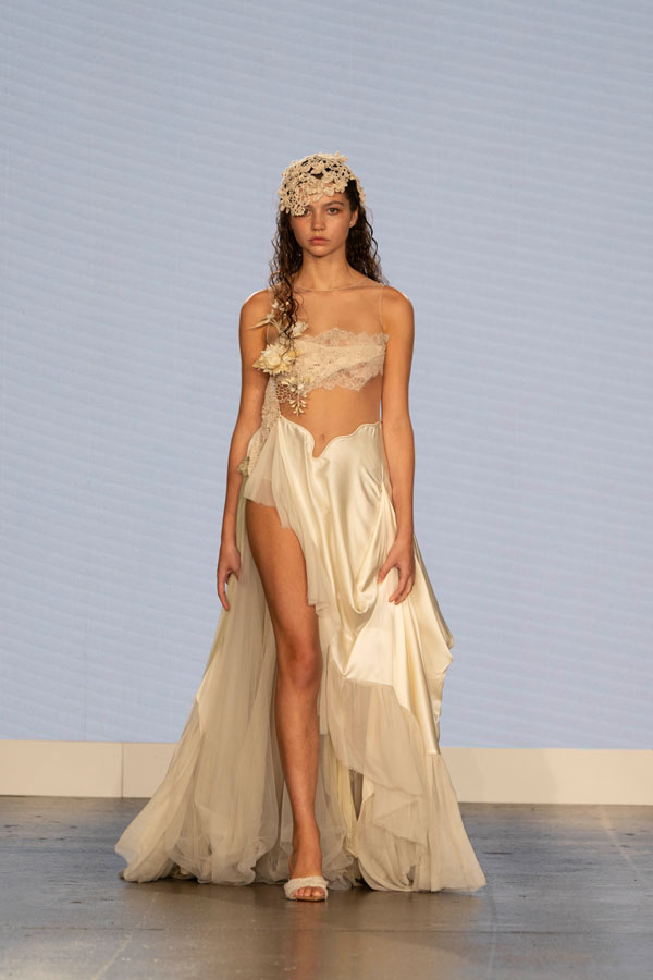 witHemera wardrobe’s collection showcases wearable garments and soft sculptures, interacting with one another, captivating audiences with a sensory experience. Inspired by the performance art sirenomelia found on Sicily’s rocky coast, Hemera was touched by the art’s swing between human and non-human beings. The designer sees sirenomelia as a metaphor for the human subconscious – swinging between what we are defined as by society and what we are defined as by ourselves.