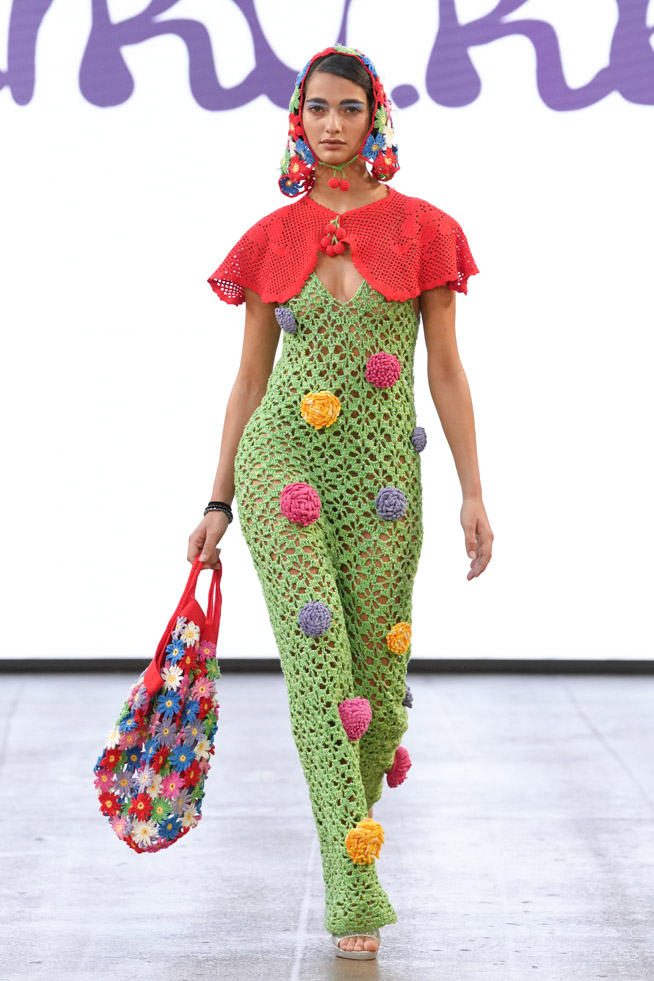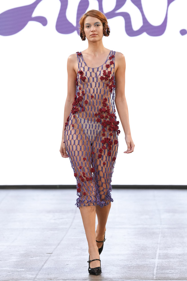 Dairu Ren’s “Midnight Garden” collection is a poetic reverie, a tribute to cherished childhood memories. Inspired by the ethereal garden of Dairu’s grandmother, the collection captures the enchanting transformation at twilight. The key lies in the intricate crocheting technique, mirroring the delicate blossoms that adorn the nocturnal garden.