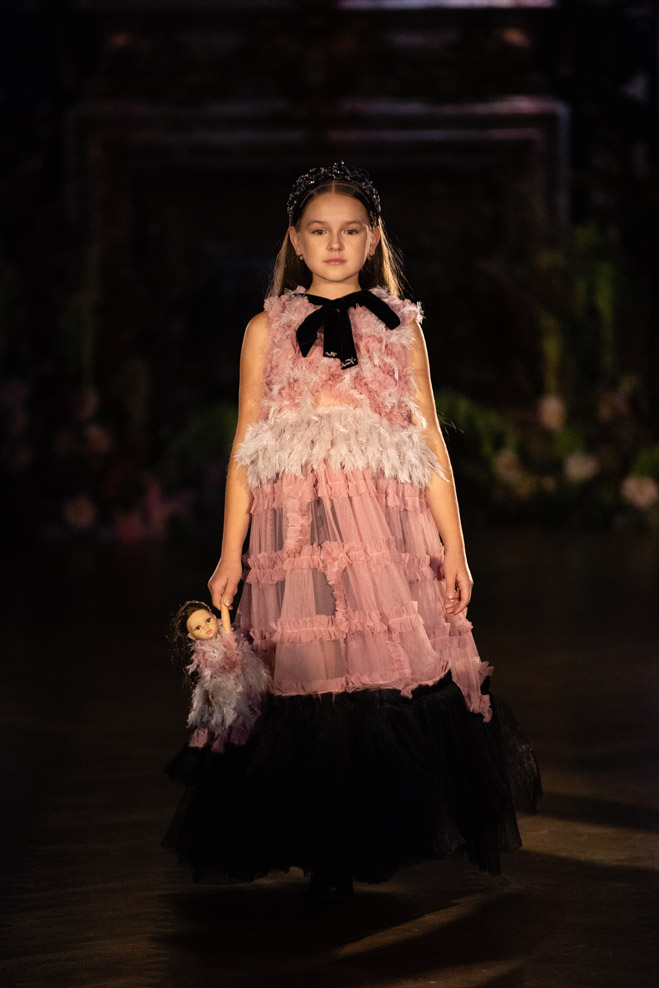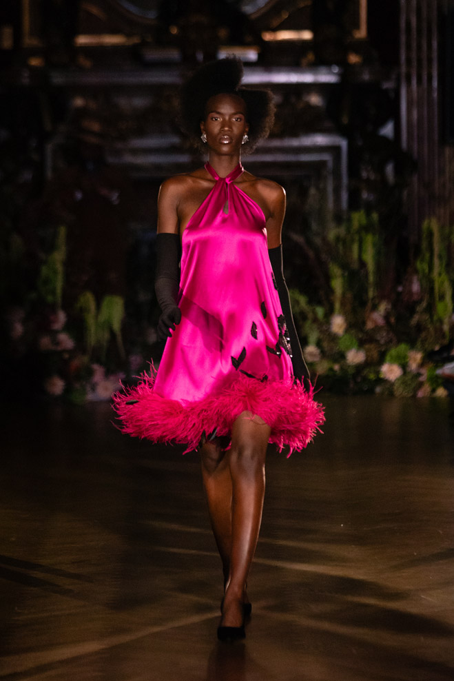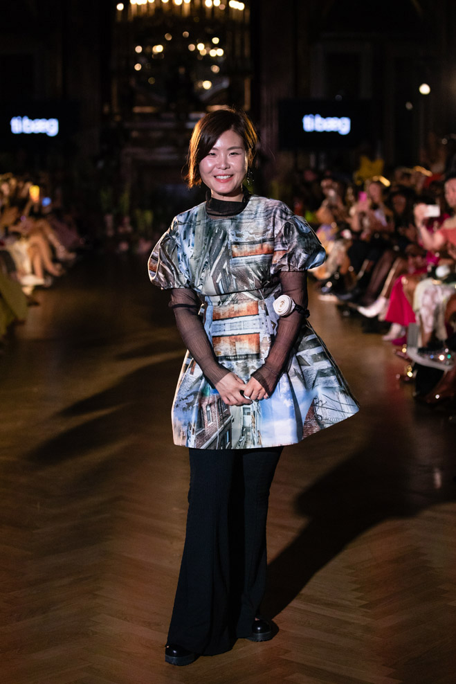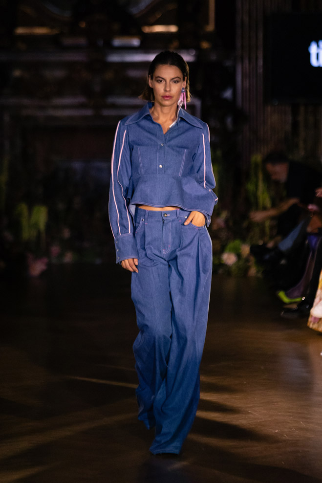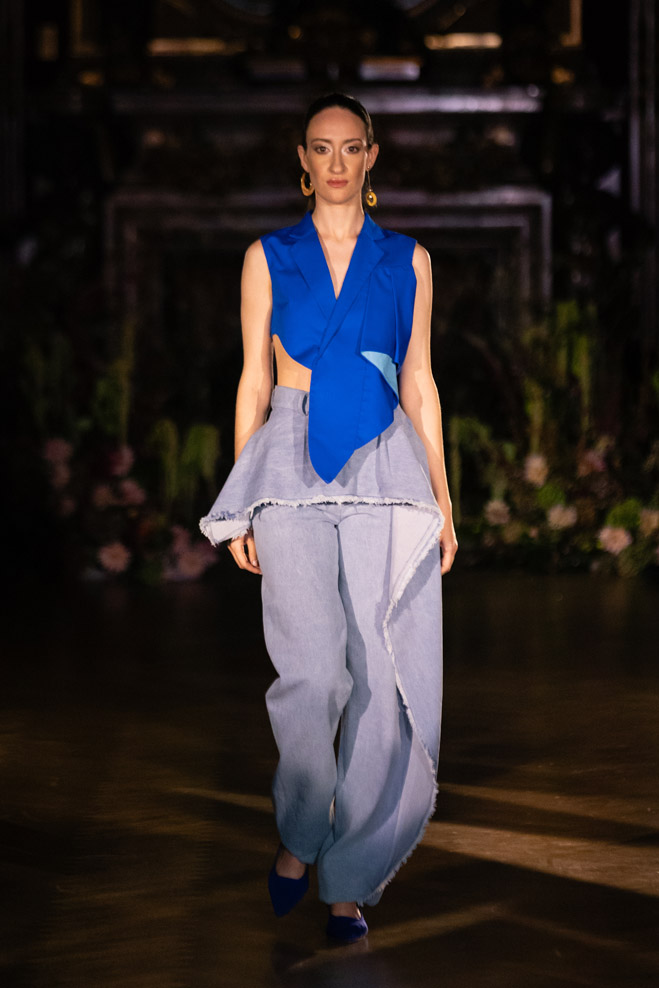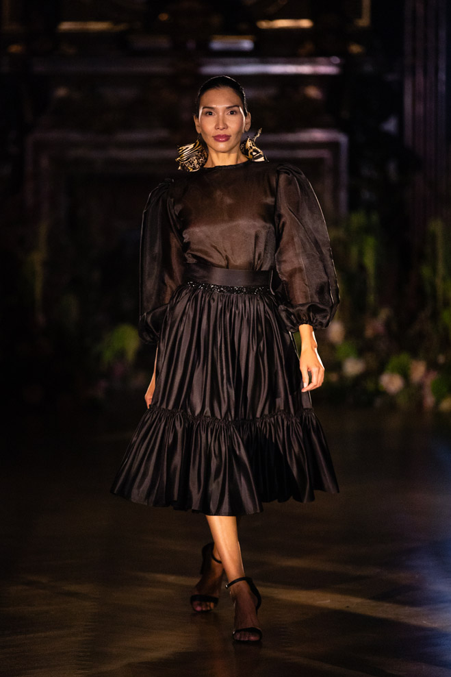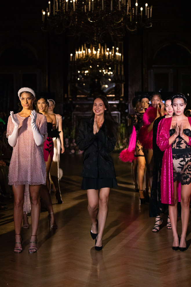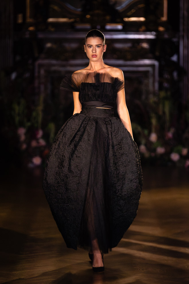 Carmen Klooren’s designs epitomized sustainable luxury. Hand-crafted in an Estonian Atelier, Carmen Klooren’s collection embraced classic silhouettes with a sensual touch, emphasizing the brand’s commitment to sustainability by using deadstock textiles and handmade garments. The designs radiated glamor with alluring opera gloves and striking pink pieces, capturing the essence of femininity with impeccable detailing and craftsmanship.