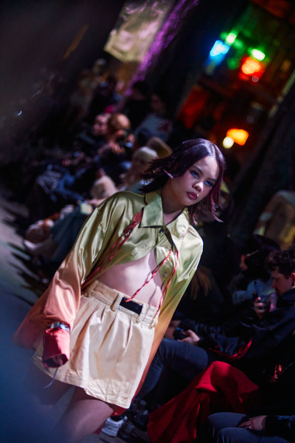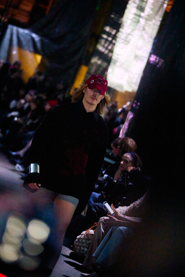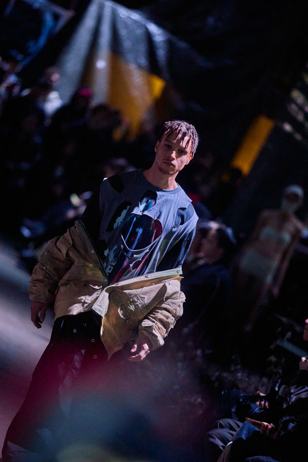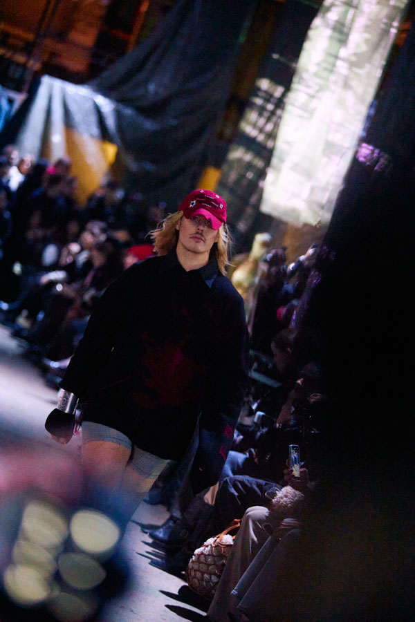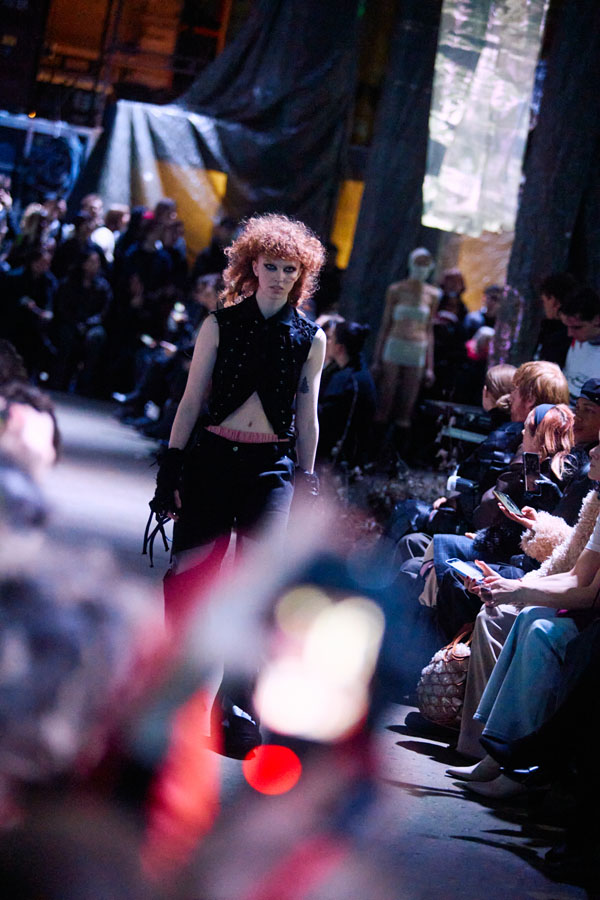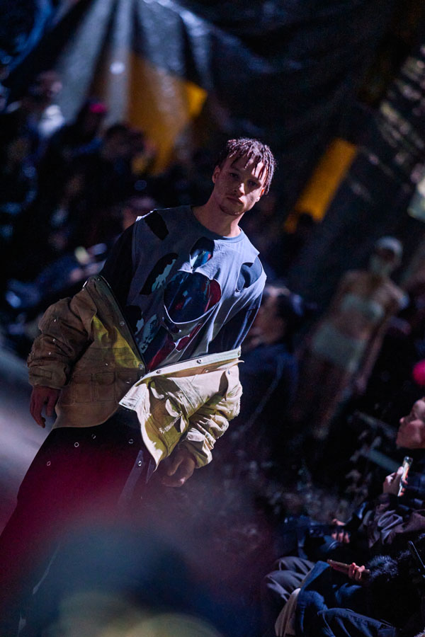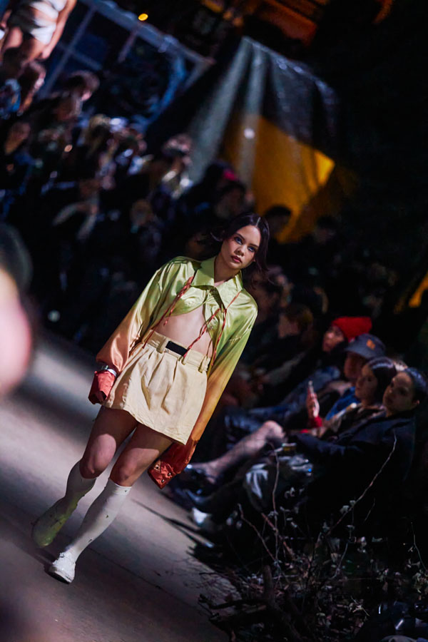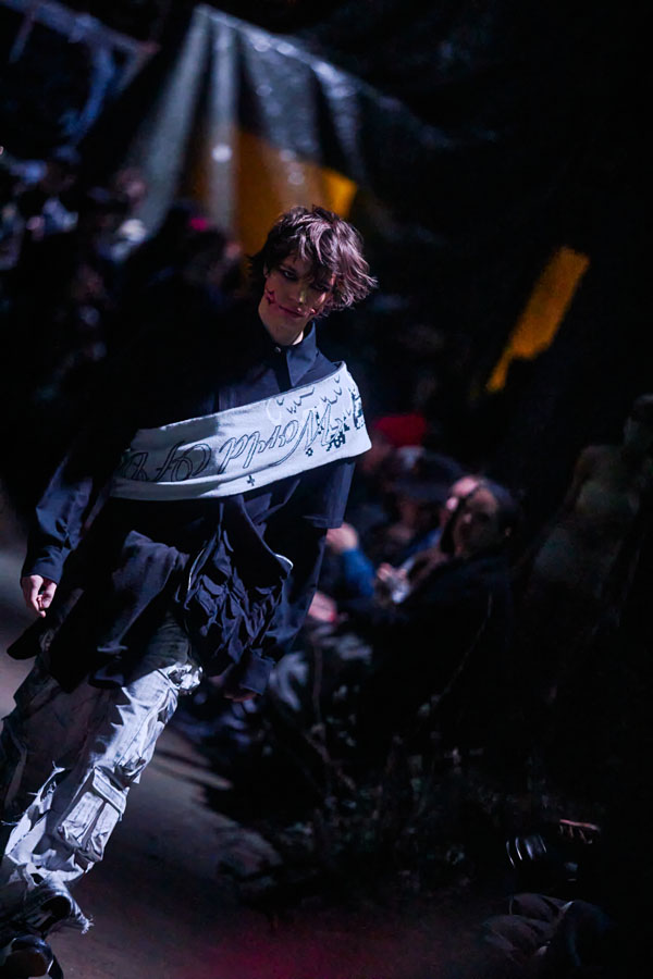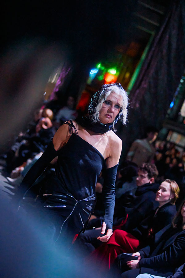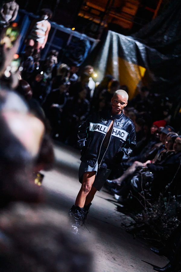 The FW25 collection’s color palette juxtaposes washed-out, steampunk-inspired tones with vibrant, almost sarcastic hues. Rich textures such as canvas, satin, and stiff PVC reflect the tension between fragility and strength, chaos and serenity.
