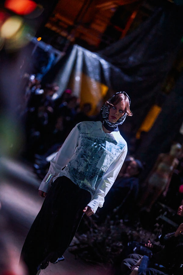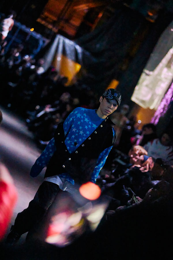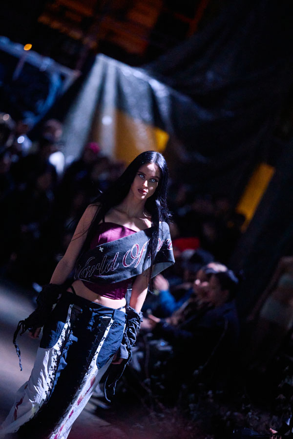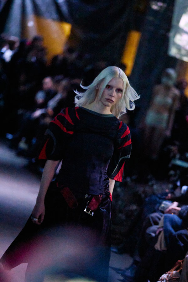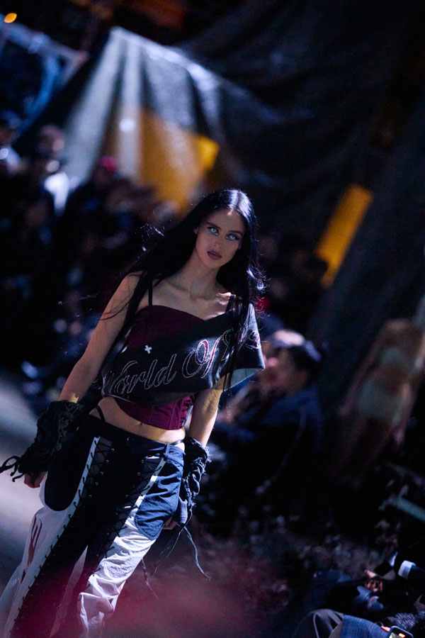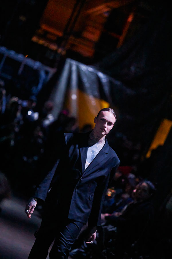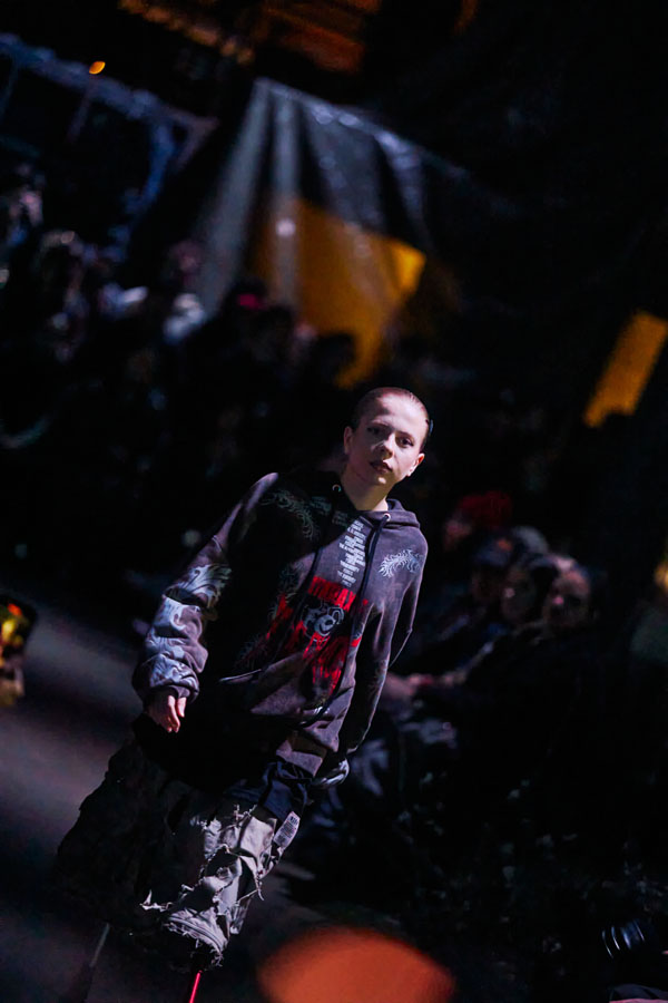 The collection’s vision of a butterfly’s journey through hell is brought to life with powerful music and theatrical staging, symbolizing a fragile beauty found in the darkest corners.