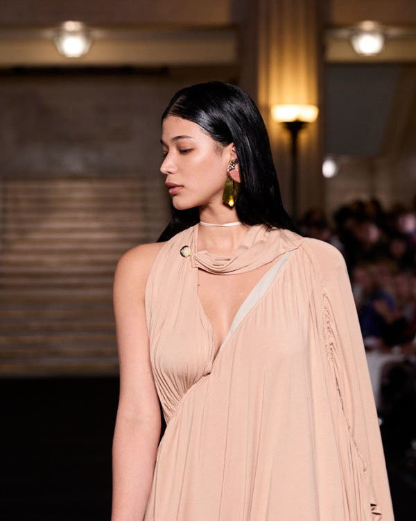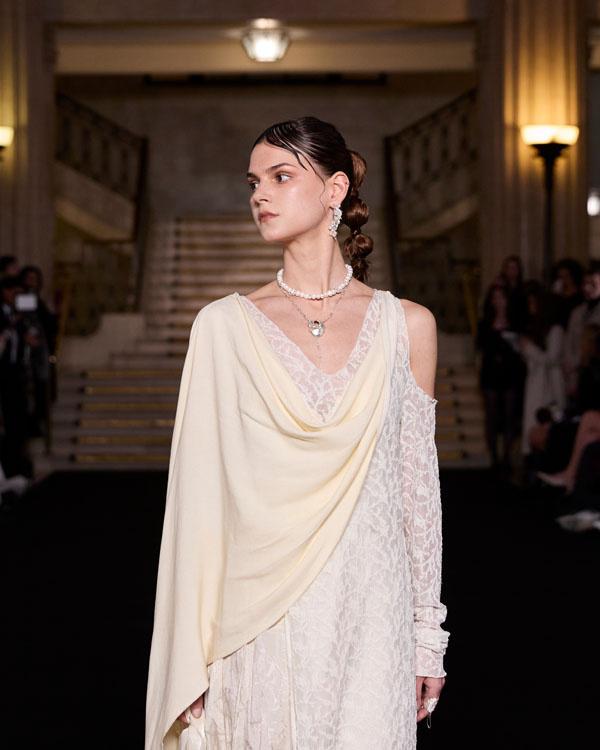 Taking the spiritual conflict between religious sacrifice and the poeticization of the flesh in the 1969 Soviet film “The Color of Pomegranates” as its core inspiration, this collection reimagines the divine silhouettes and patterns of 17th-century Baroque comedy costumes. It transforms the physical properties of theatre curtains (drapery, tearing, pleating, suspension) into the dynamic structural language of clothing, exploring the eternal “control and resistance” relationship between the body and fabric. Influenced by theatrical elements, the 2025 S/S series breaks the power dynamic of “viewer and viewed,” allowing the garments themselves to become the narrative protagonists. Simultaneously, the curtain knots are reinterpreted as adjustable strap systems, enabling wearers to alter necklines and sleeve styles, which has become a defining design language and the highlight of the collection. The 2025 spring-summer collection will transport audiences between the theatrical cultures of the 17th and 21st centuries—the show is about to begin.
