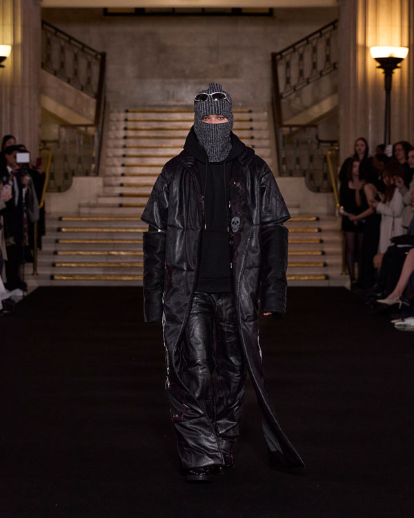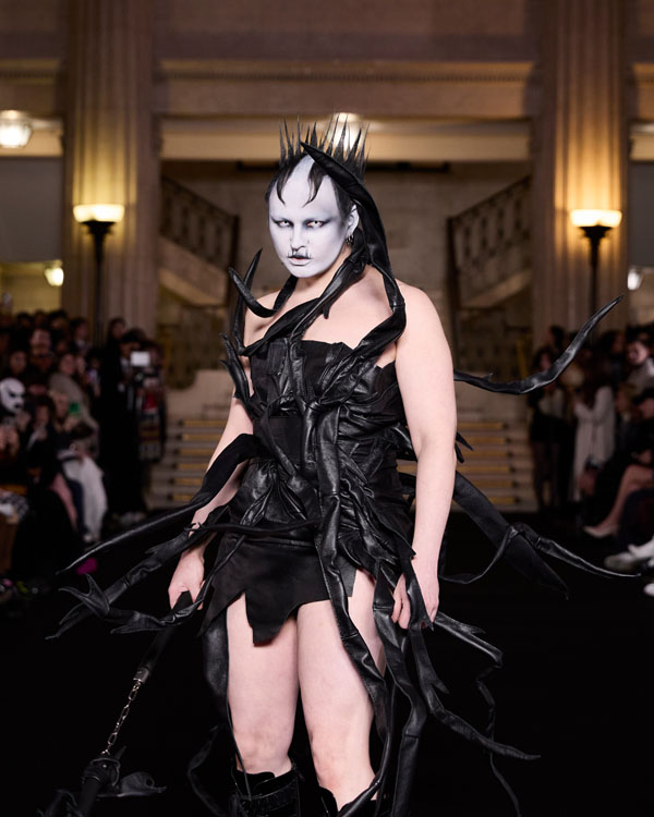 Shades of grey and black dominate, evoking mourning cloth draped over something once cherished. Flowing silhouettes mirror the heaviness of sorrow, while sharp, structured elements reflect the restraint of emotions left unspoken. Spiked embellishments emerge like fractured bones, serving as jagged reminders of love’s cruelty and the piercing ache of loss. Delicate lace frays at the edges, unravelling with time, while heavy fabrics ground the collection in the weight of memory.