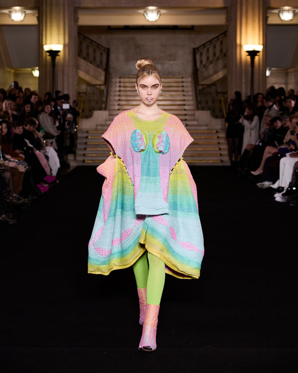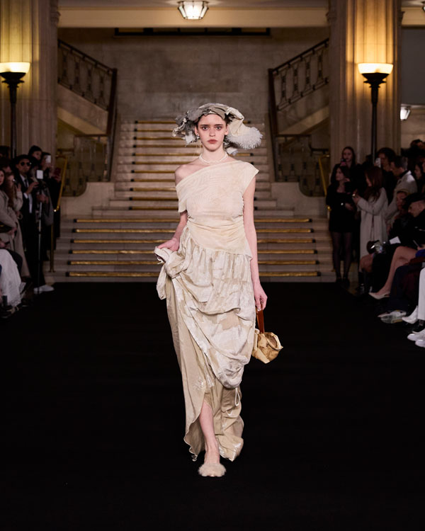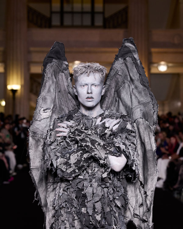 Yuyao Zhuo’s graduate collection, Another Possibility, exemplifies her ethos of sustainability and reinvention. In a world oversaturated with excessive packaging, everyday remnants – bubble wrap, luxury shopping bags, and plastic packaging – accumulate endlessly, posing irreversible harm to the environment. Through meticulous re-cutting, trimming, and masterful craftsmanship, Zhuo transforms these discarded materials into wearable works of art, urging individuals to rethink consumption and embrace sustainability in their way.