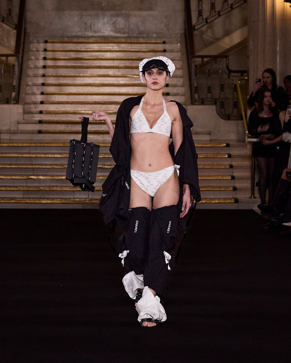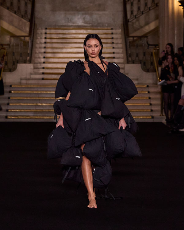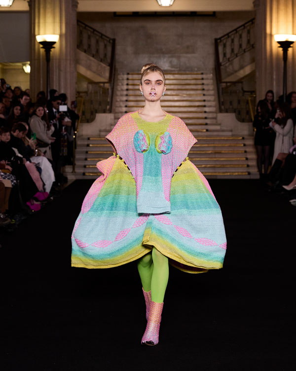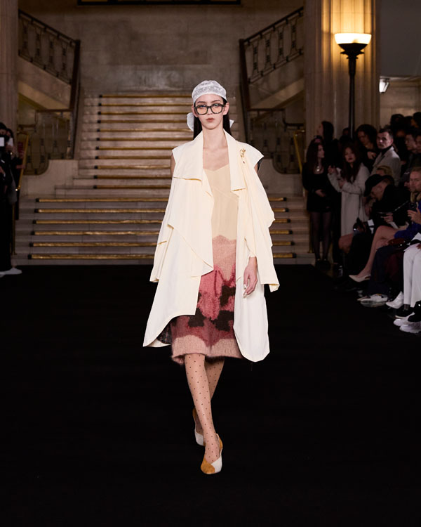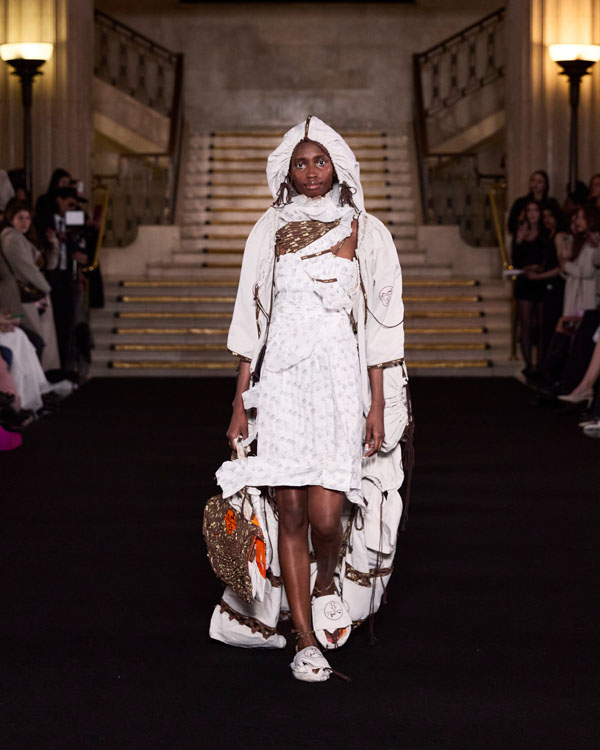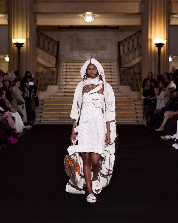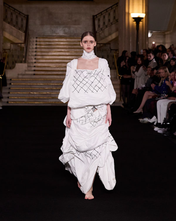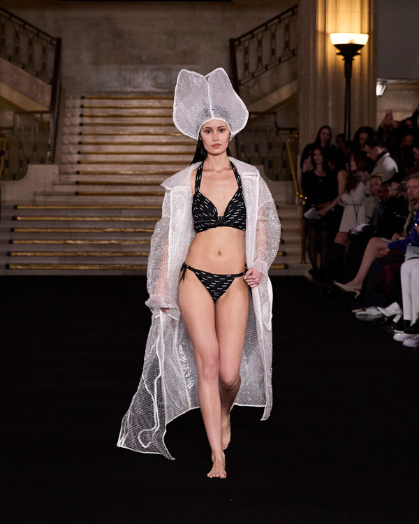 Yuyao Zhuo’s graduate collection, Another Possibility, exemplifies her ethos of sustainability and reinvention. In a world oversaturated with excessive packaging, everyday remnants – bubble wrap, luxury shopping bags, and plastic packaging – accumulate endlessly, posing irreversible harm to the environment. Through meticulous re-cutting, trimming, and masterful craftsmanship, Zhuo transforms these discarded materials into wearable works of art, urging individuals to rethink consumption and embrace sustainability in their way.