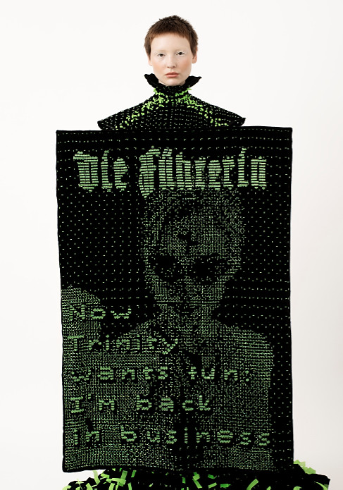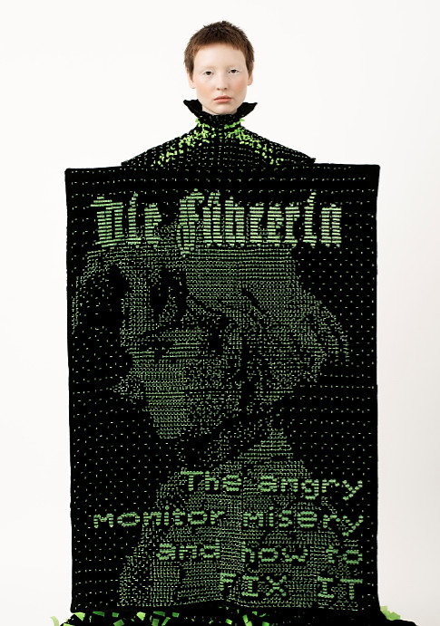 The dress is made to carry cover dummies of a fake tech-magazine called “Die Führerin”. The magazine covers are headlined with mash-ups of programming language and “real” newspaper titles, such as ‘BASH she did it again’ or ‘Becca stuck in while loop’. Just like the headlines, the cover faces feature women online – the tech-executives in ‘Die Führerin’ are female. Playing with the german translation of ‘leadress’, the magazine’s name is a conscious reference to the paradox of power, as well as symbol for female leadership. The covers itself reference the Ascii code aesthetic of computer screens in the 1980s, green pixels on black screen, each of the 6 covers was created manually as a vector file by Flora Miranda.