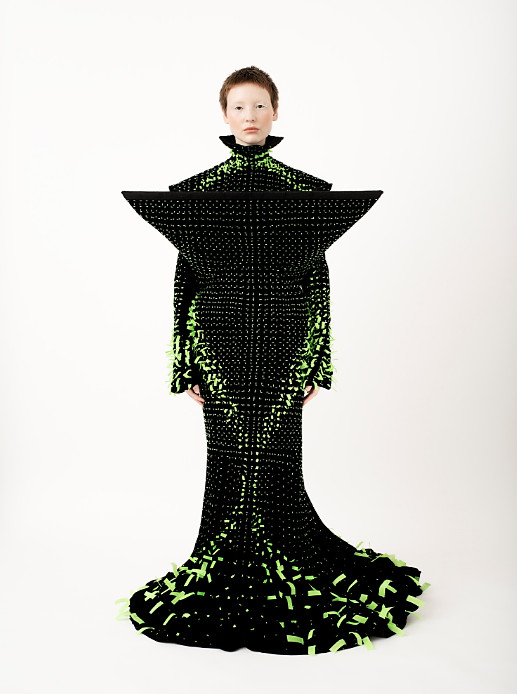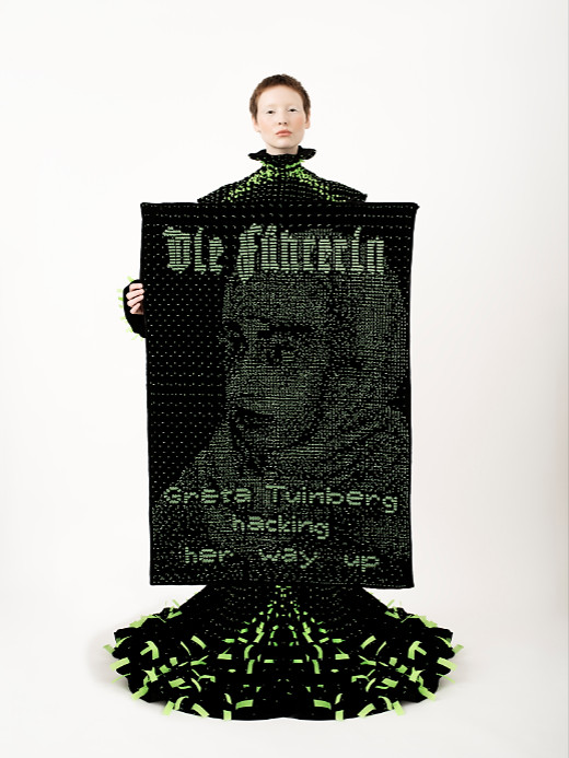 The basic structure of the dress is a classical, body-fitted couture silhouette, made of hand-sewn black silk velvet. It exemplifies the beauty of the manually made couture dress, it represents the pure beauty of handcrafted fashion garments. While being imminently beautiful, it is tailored to hold the graphical panels, which float in front of the dress like a veil. The panels themselves are manually embroidered with green glass bead, creating the look of green particles on the black panel. Singular beads seem to grow from the underground, due to an embellishment of neon green silk particles. There are 15 ‘news cover’ panels in total, from which 6 were selected to be shown on the silhouette. The whole dress is an illustration of excellent manual craftsmanship, making the garment an artisanal masterpiece. Charged with the power of 650 hours human handwork.