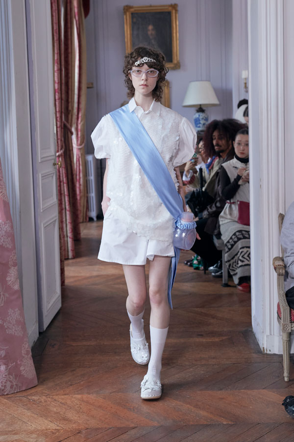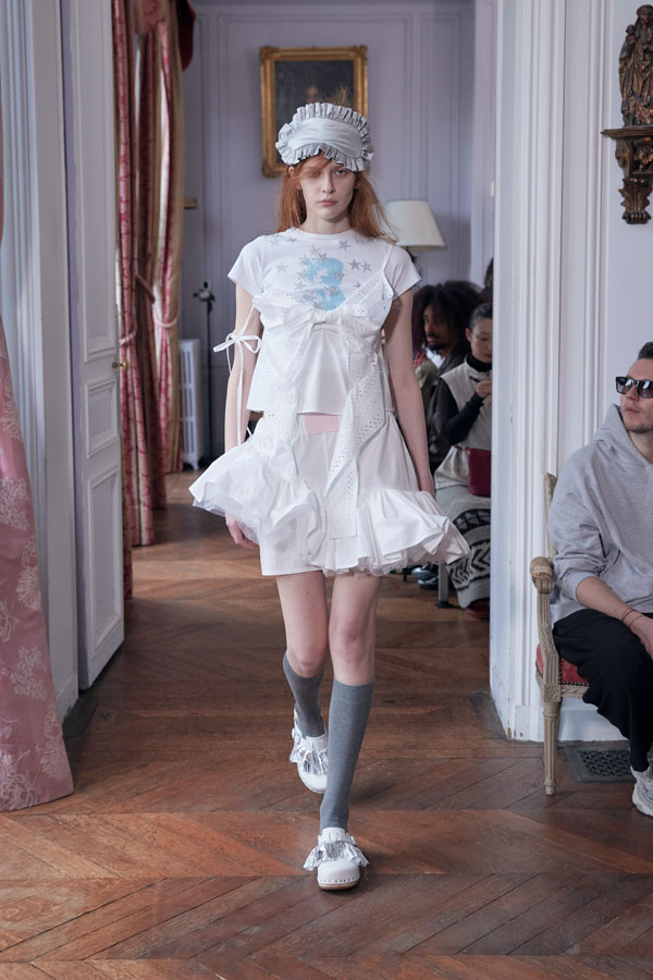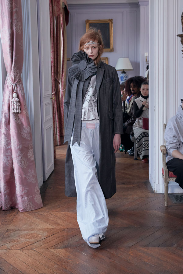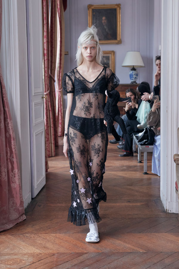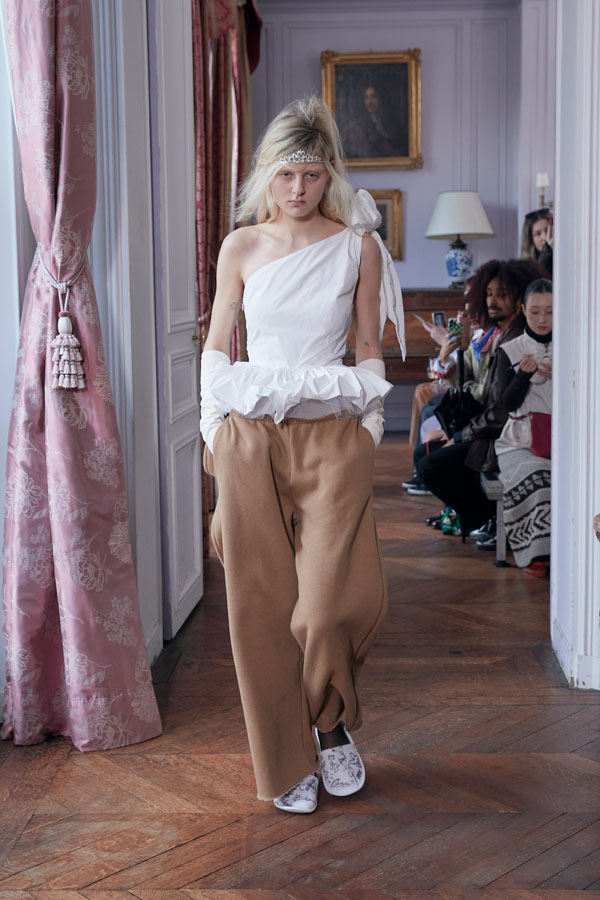 The collection reflects the idea that transformation is not instant but earned. Leitner explores this theme through garments that balance intimacy and public expression—such as nightwear-inspired looks featuring boxer shorts, sheer layers over pink lingerie, and relaxed silhouettes topped with crowns. The concept of “private dressing made public” plays a central role in the FW26 aesthetic.