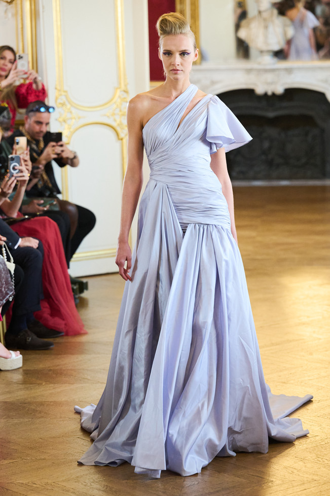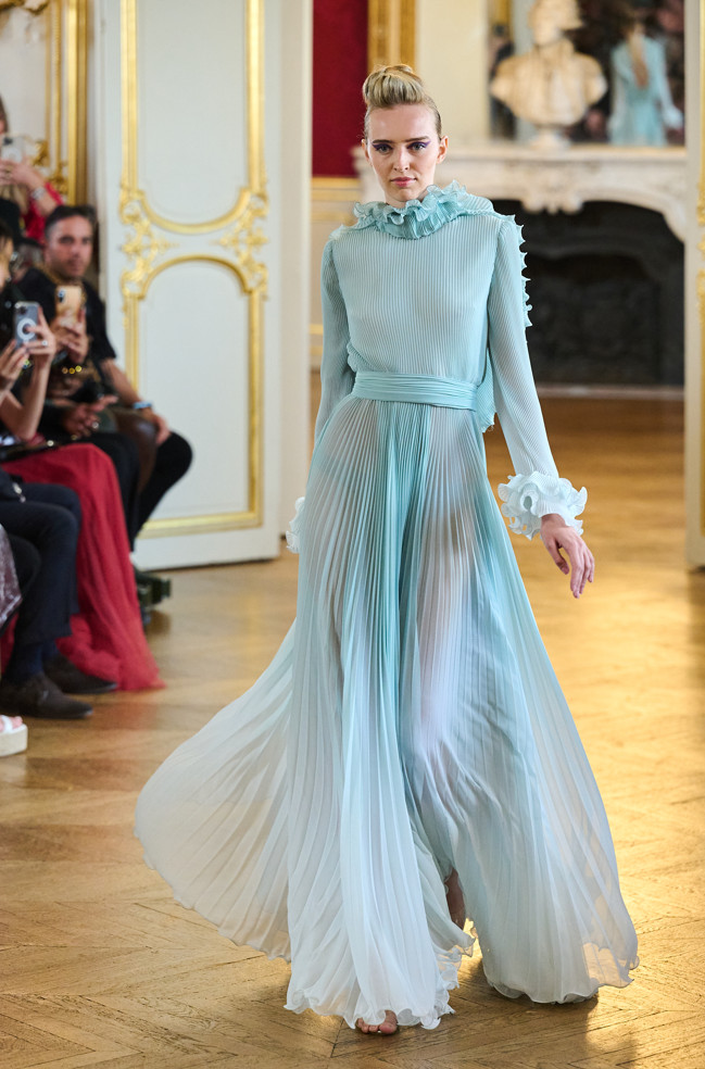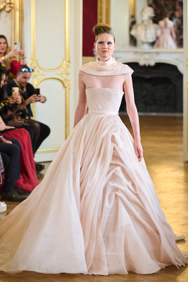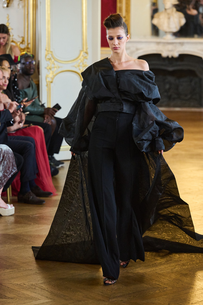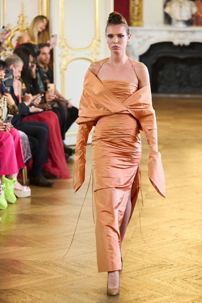 Architecture is the red thread of the wardrobe: vaporous cloud sleeves in taffeta, airy skirts in silk and organza, high-waisted satin pants, crepe tops.