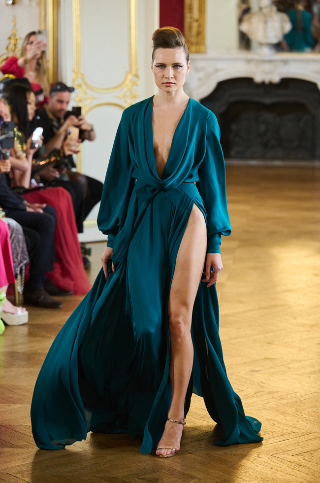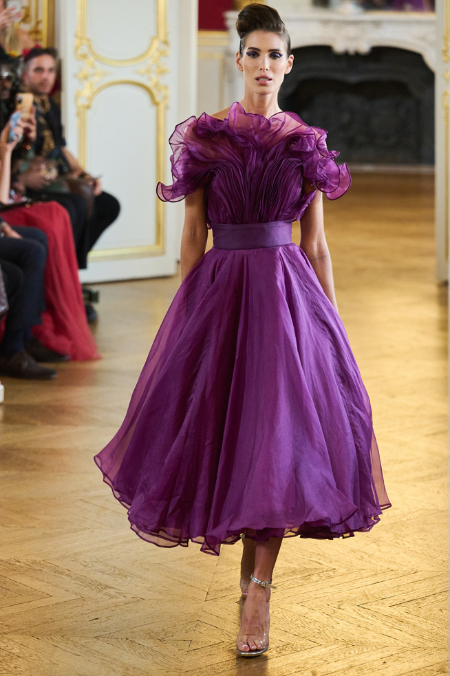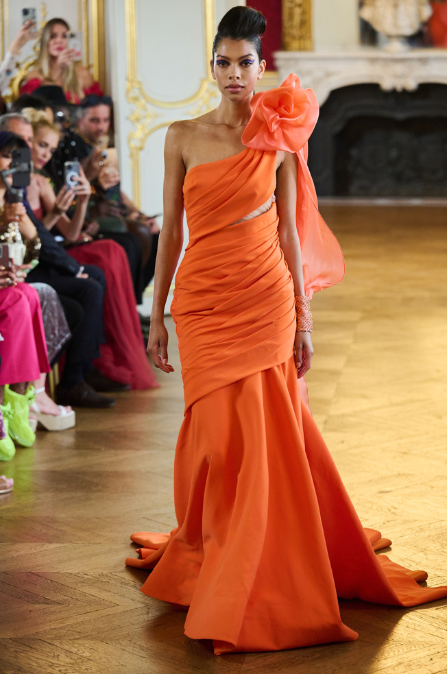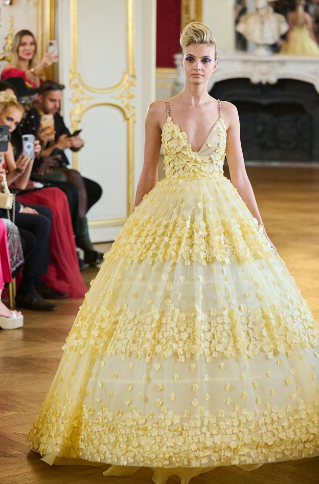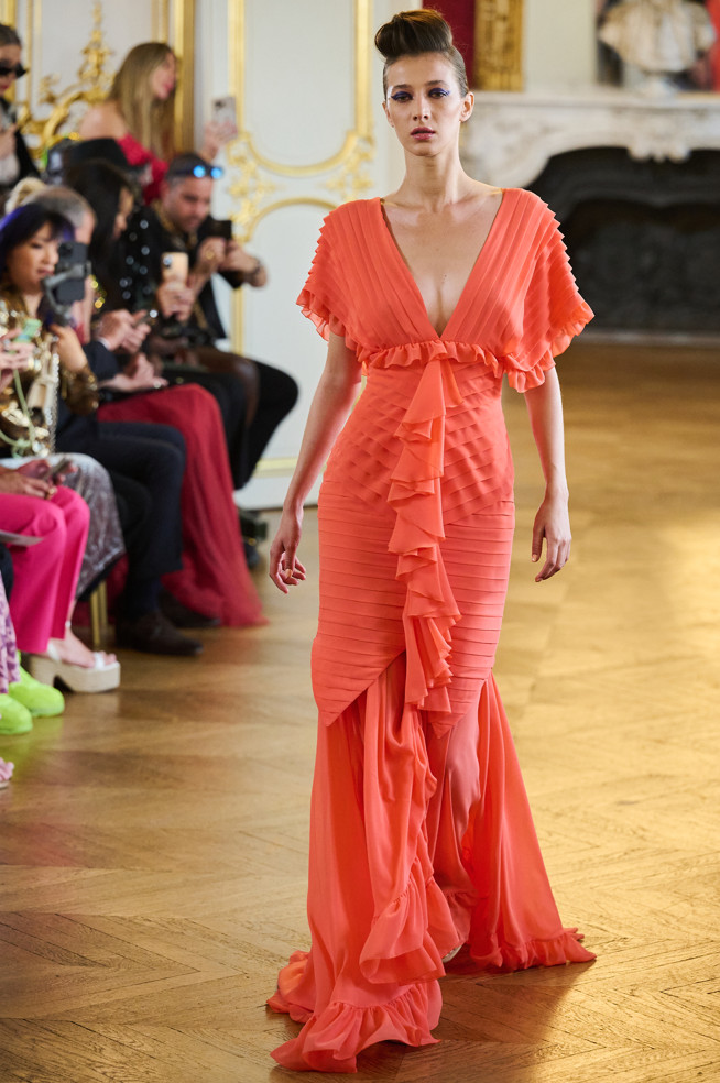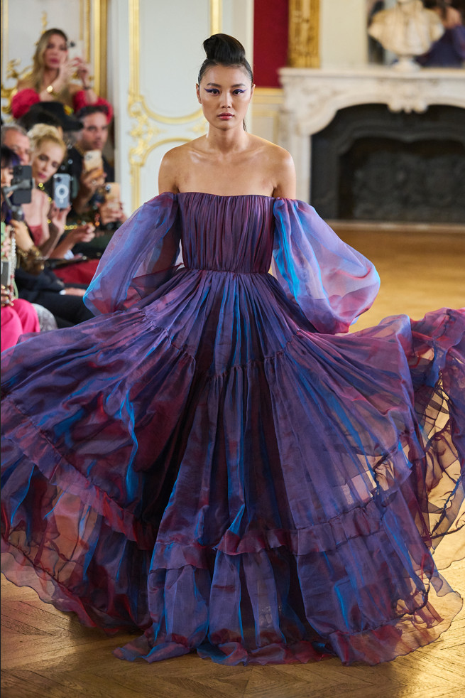 Architecture is the red thread of the wardrobe: vaporous cloud sleeves in taffeta, airy skirts in silk and organza, high-waisted satin pants, crepe tops.
