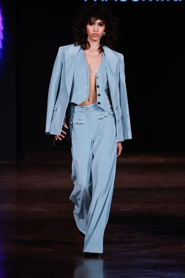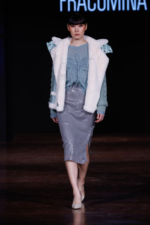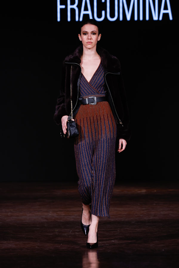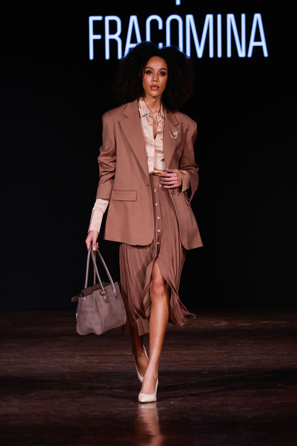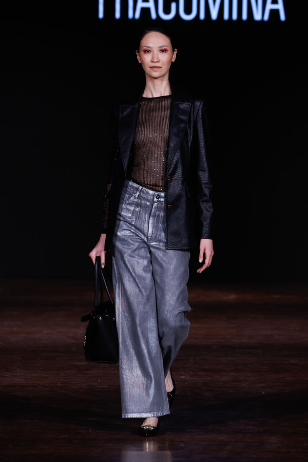 Fracomina also embraced chic comfort, presenting deconstructed jackets over raw-edged denim and statement-making outerwear like crackle fabric bomber jackets and faux fur coats in warm camel and mocha mousse tones. The brand’s signature femininity extended into menswear-inspired styles, with pinstripe and houndstooth designs, Swarovski-embellished coats, and iridescent gray denim pieces.
