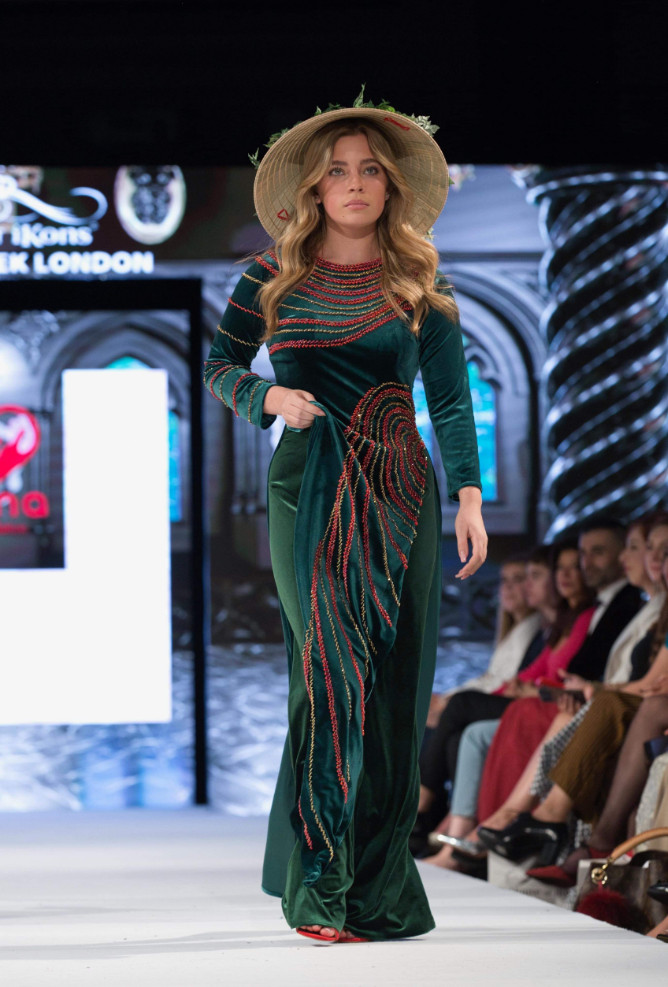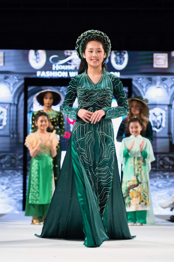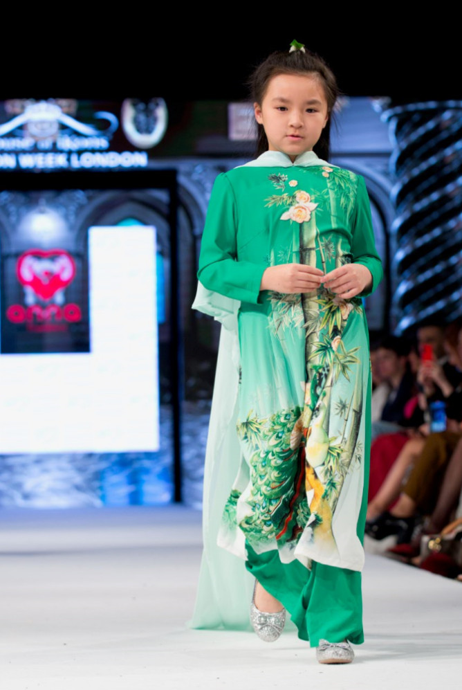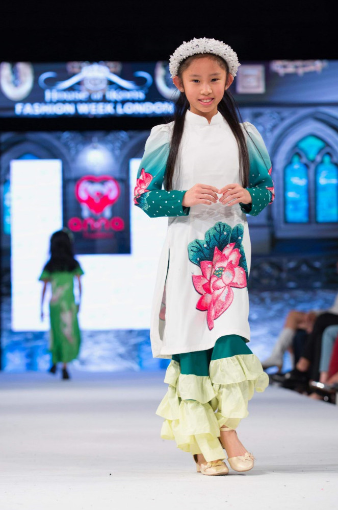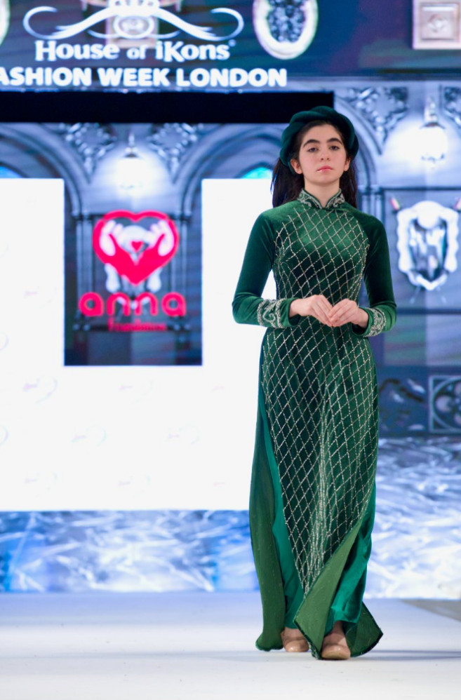 At the House of iKons Fashion Week London runway on February 19, 12-year-old British-Vietnamese designer Anna Hoang (Brand Love Collection) introduced a new collection called “Green Dream” including more than 20 designs with green tones.