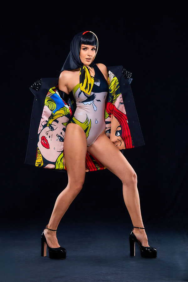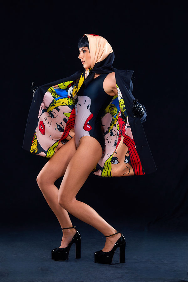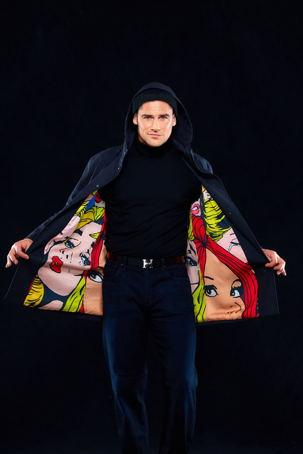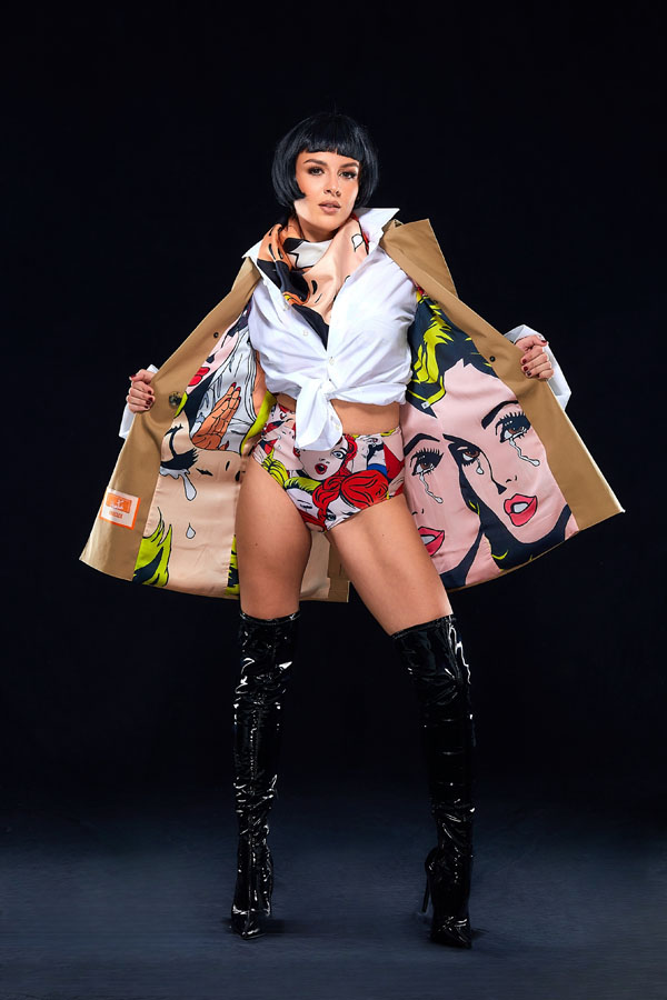 “We have a veritable treasure trove of Sascha’s original paintings – more than we know what to do with. But for me, it’s not just about hoarding art; it’s about making it wearable, turning it into something you can live with, carry with you, and perhaps even get caught in the rain wearing. I’ve always been taken with the audacity of 90s Moschino – those cheeky, irreverent collections that made fashion feel like an act of defiance. And now, here we are, living the dream in a riot of bold, statement pop art that makes you feel alive. Honestly, I can’t quite believe how many of these coats we’ve sold – people are snapping them up faster than we can post them on Instagram. There’s something wonderfully mad about that.”