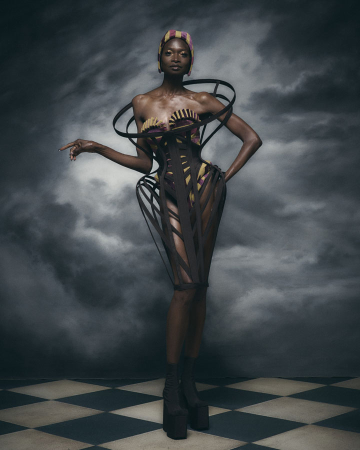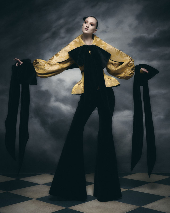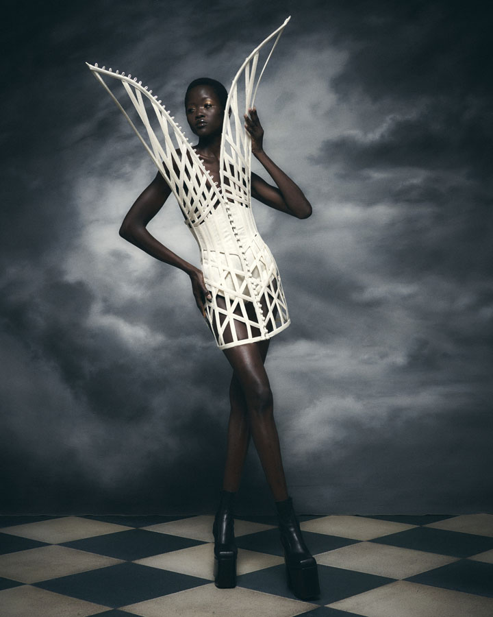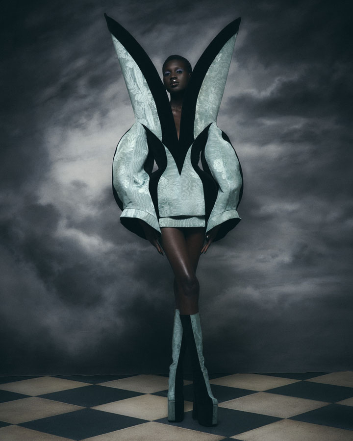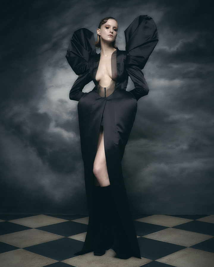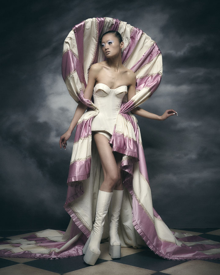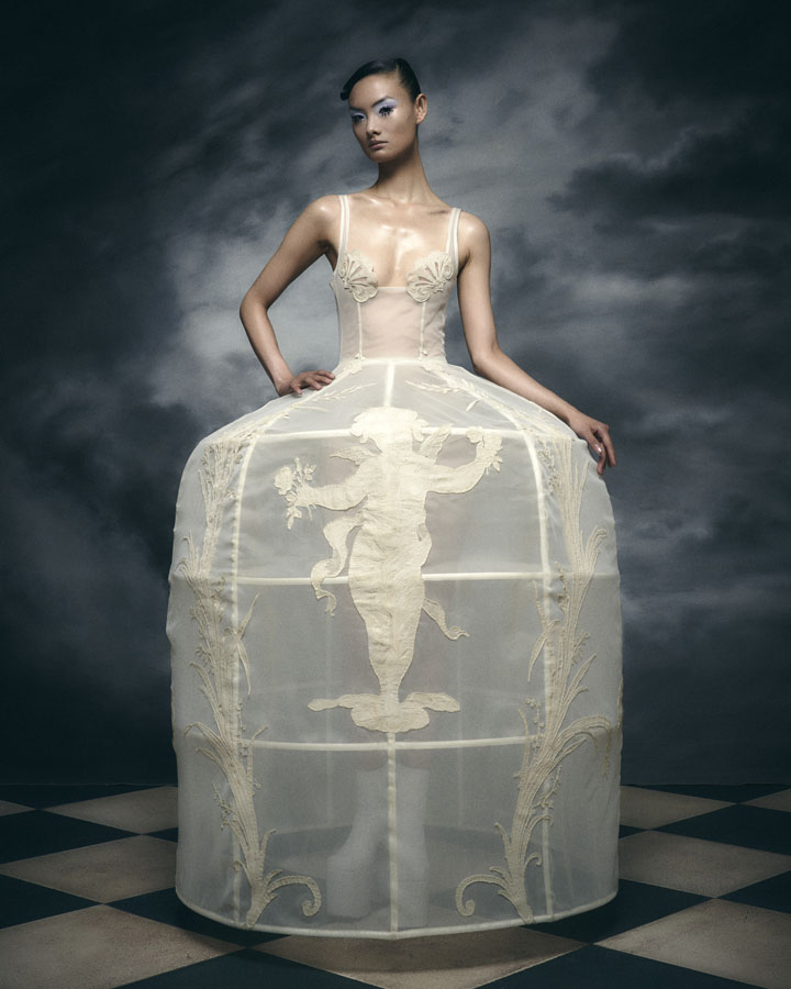 Silhouettes feature exaggerated hips and nipped in waists through corsetry, oversized structured lapels, sculptural collars and crinolines, to create architectural shapes that are contrasted with the fluidity of generous drapery, flowing skirts and delicate fabrics. Reed’s signature corsets and crinolines take centre stage, the craftsmanship that usually sits below the garments is exposed and celebrated – a sheer dress with hand appliquéd flowers displays the crinoline beneath, a winged corset exhibits its boning and channels, and a crinoline cage dress showcases the beauty of the structure that is integral to the brands’ silhouette driven designs.