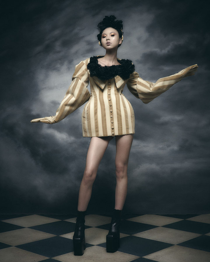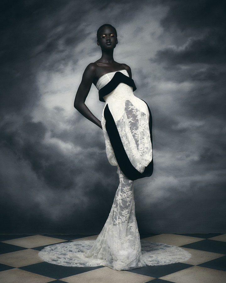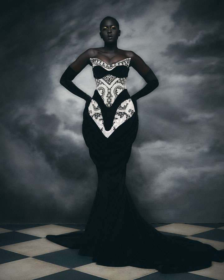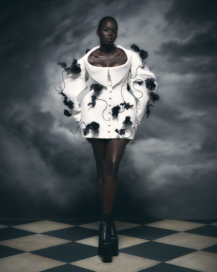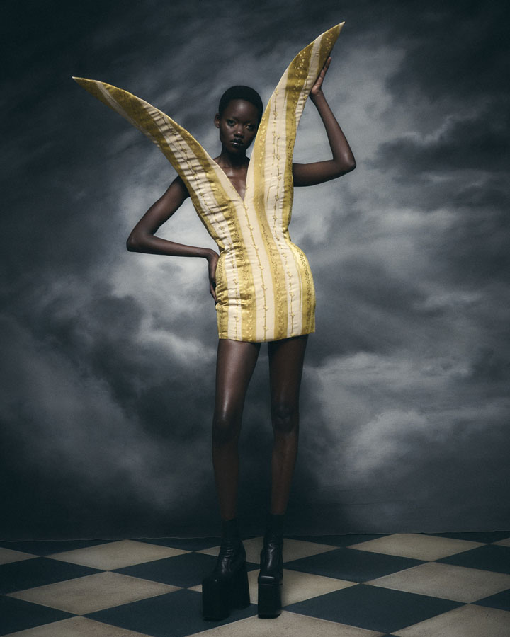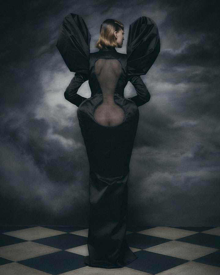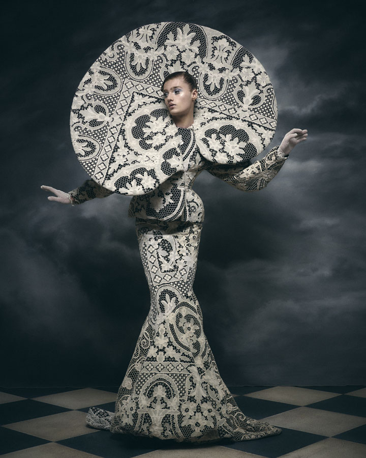 Silhouettes feature exaggerated hips and nipped in waists through corsetry, oversized structured lapels, sculptural collars and crinolines, to create architectural shapes that are contrasted with the fluidity of generous drapery, flowing skirts and delicate fabrics. Reed’s signature corsets and crinolines take centre stage, the craftsmanship that usually sits below the garments is exposed and celebrated – a sheer dress with hand appliquéd flowers displays the crinoline beneath, a winged corset exhibits its boning and channels, and a crinoline cage dress showcases the beauty of the structure that is integral to the brands’ silhouette driven designs.