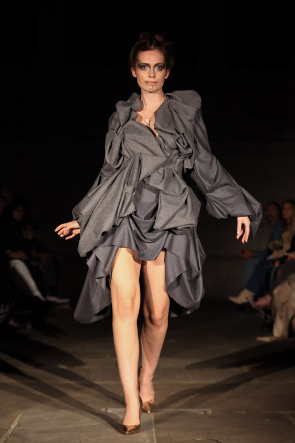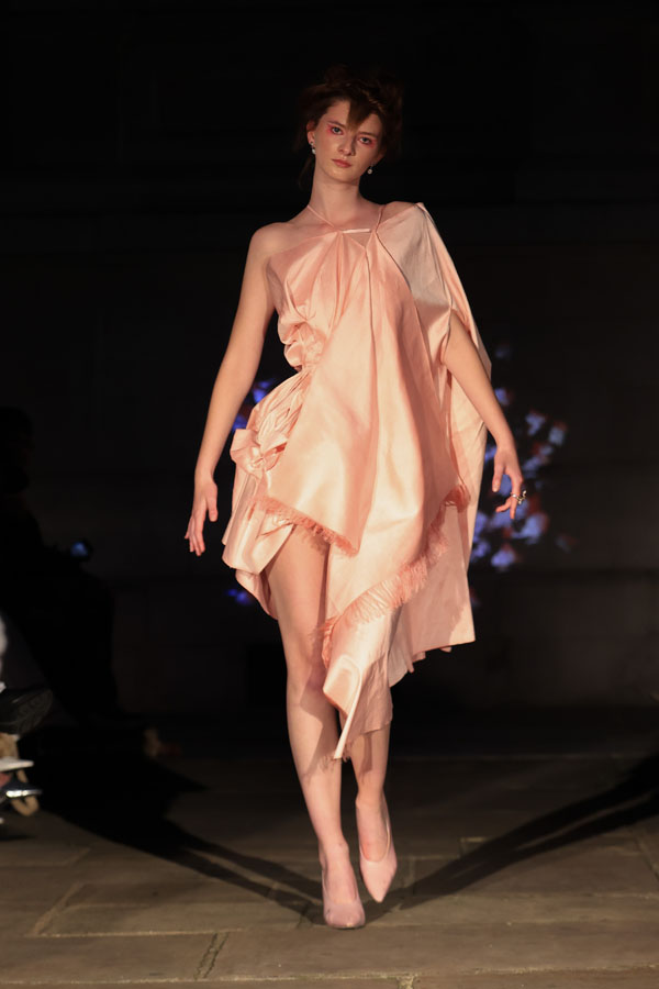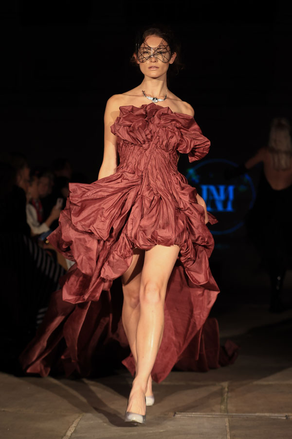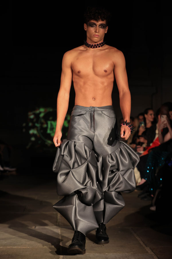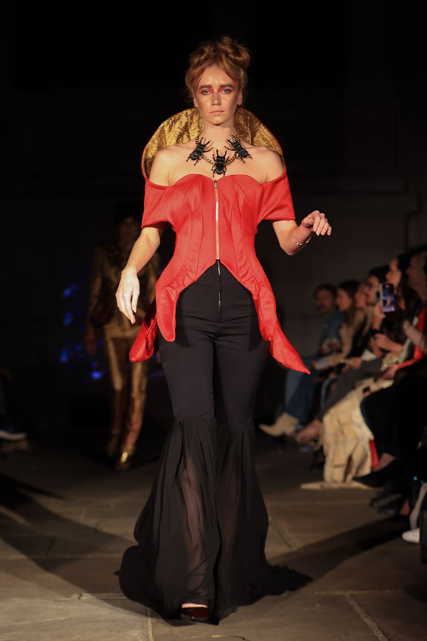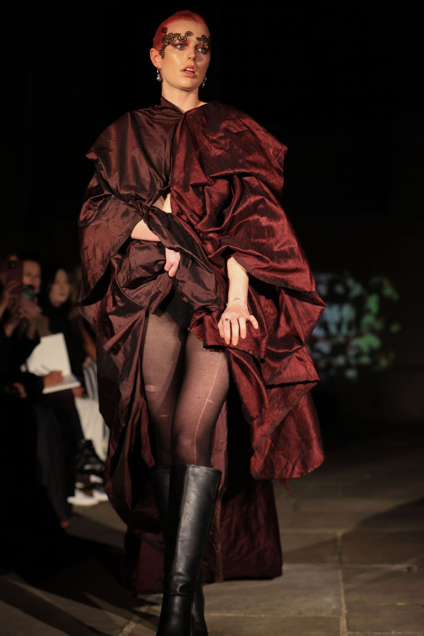 In ‘Into The Gloaming’, Maclean weaves these elements into a dramatic fashion narrative, where the models, like the sisters in RosseG’s poem, undergo a stunning transformation. As the show progresses, the collec5on takes the audience on a visual journey from innocence to darkness. The garments, which ini5ally feature soN pastel tones, evolve into more vibrant hues, and finally into deep, drama5c shades – mirroring the emo5onal arc of the sisters and their encounters with the goblins.
