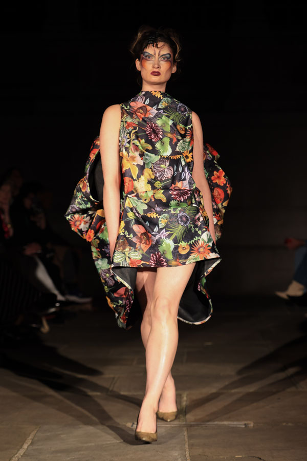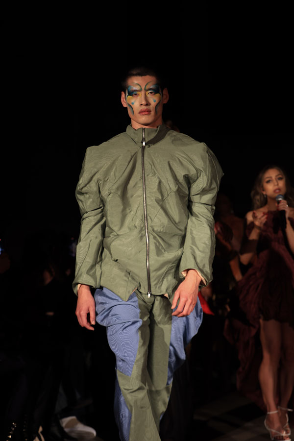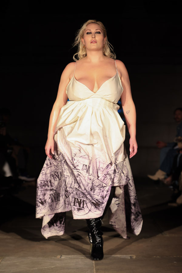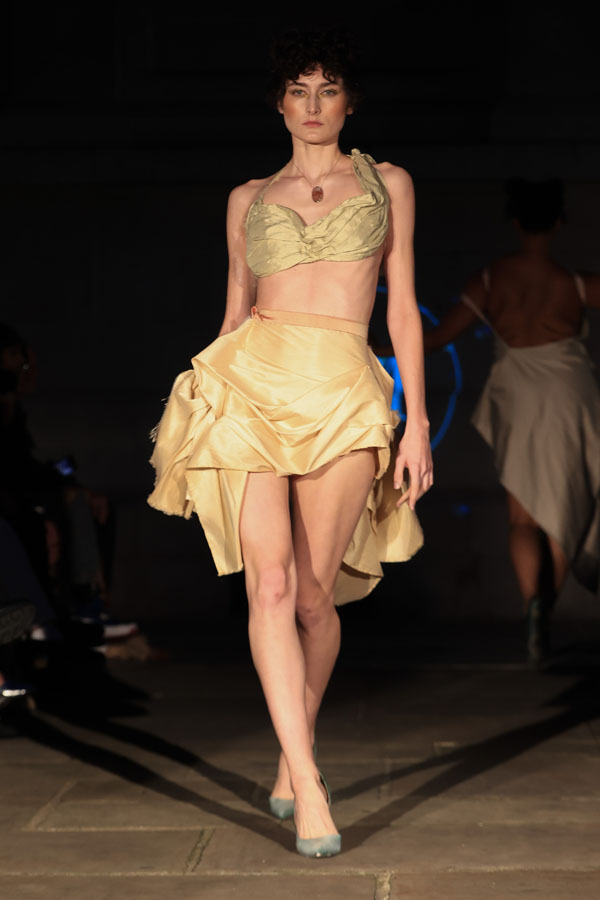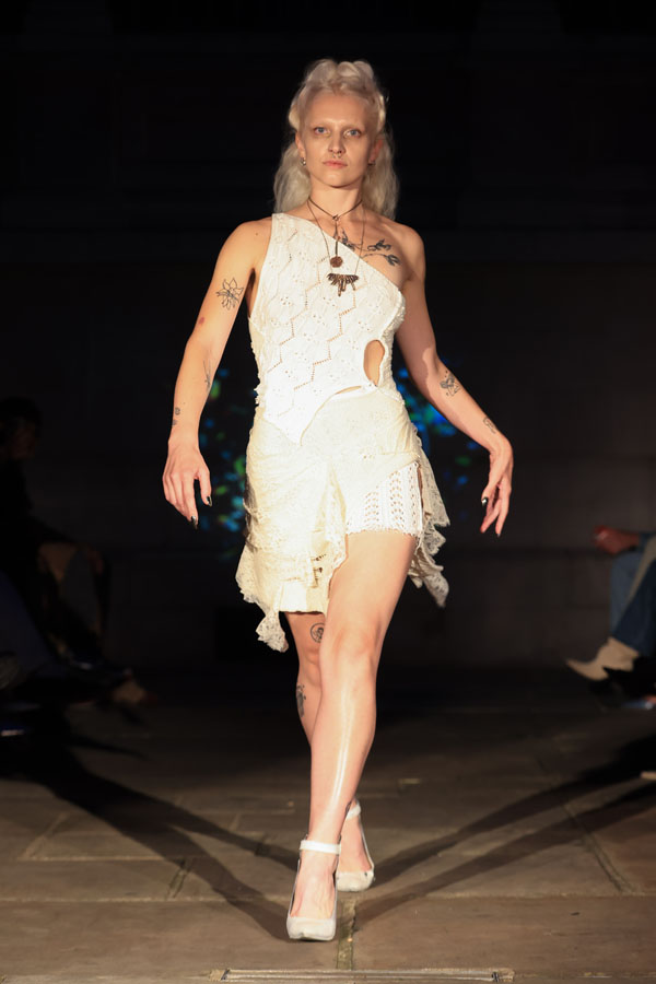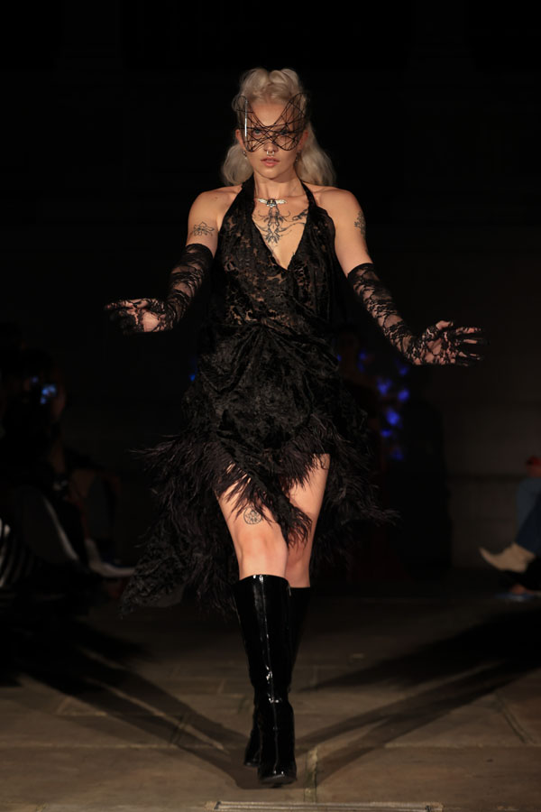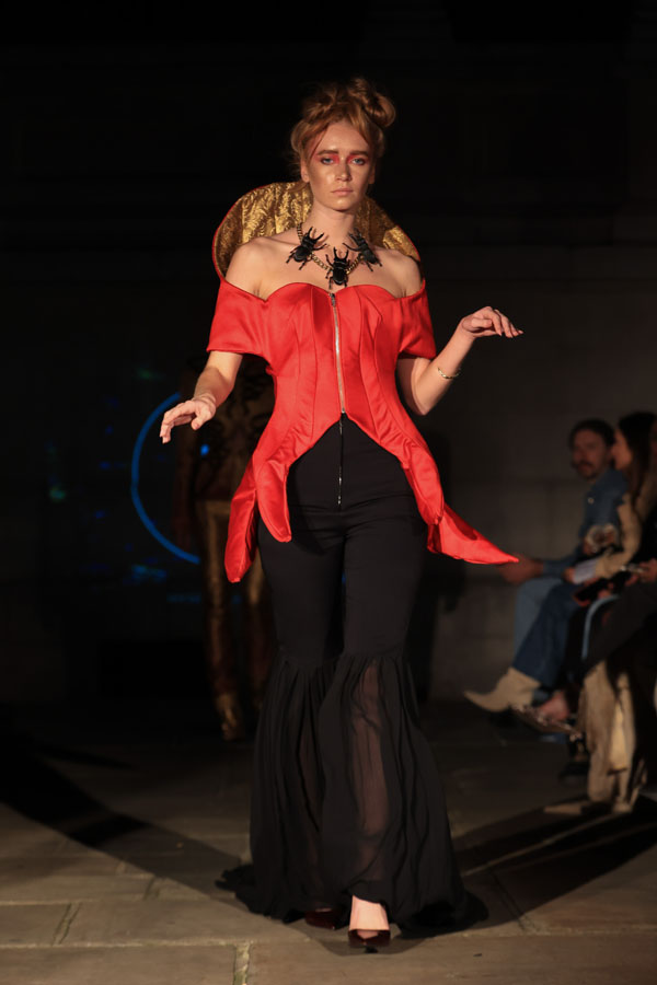 In ‘Into The Gloaming’, Maclean weaves these elements into a dramatic fashion narrative, where the models, like the sisters in RosseG’s poem, undergo a stunning transformation. As the show progresses, the collec5on takes the audience on a visual journey from innocence to darkness. The garments, which ini5ally feature soN pastel tones, evolve into more vibrant hues, and finally into deep, drama5c shades – mirroring the emo5onal arc of the sisters and their encounters with the goblins.
