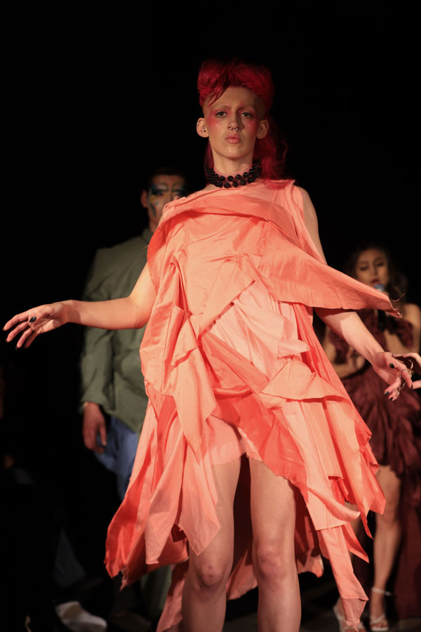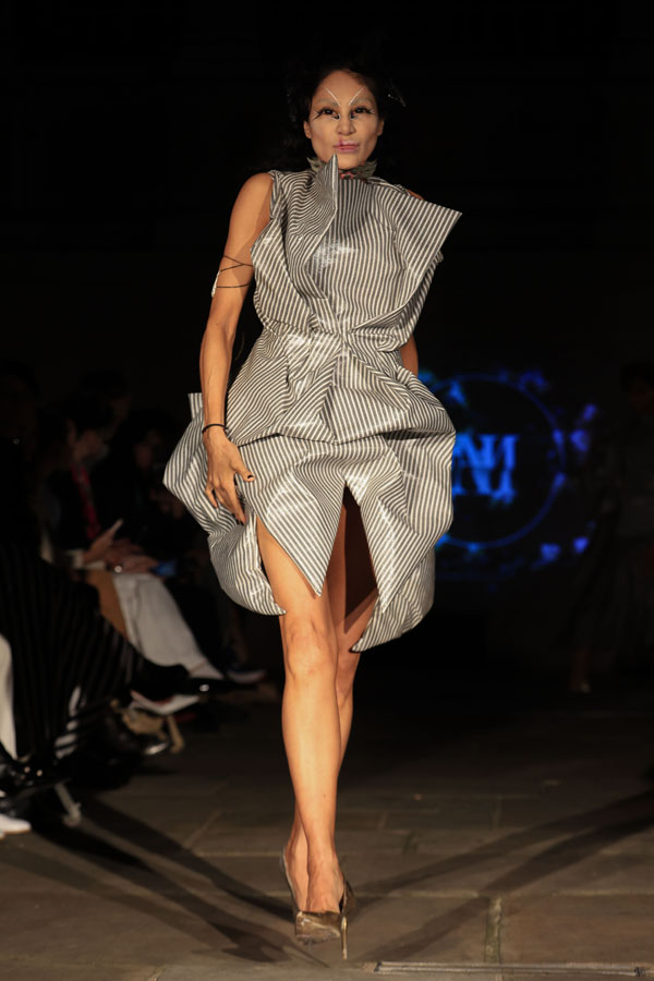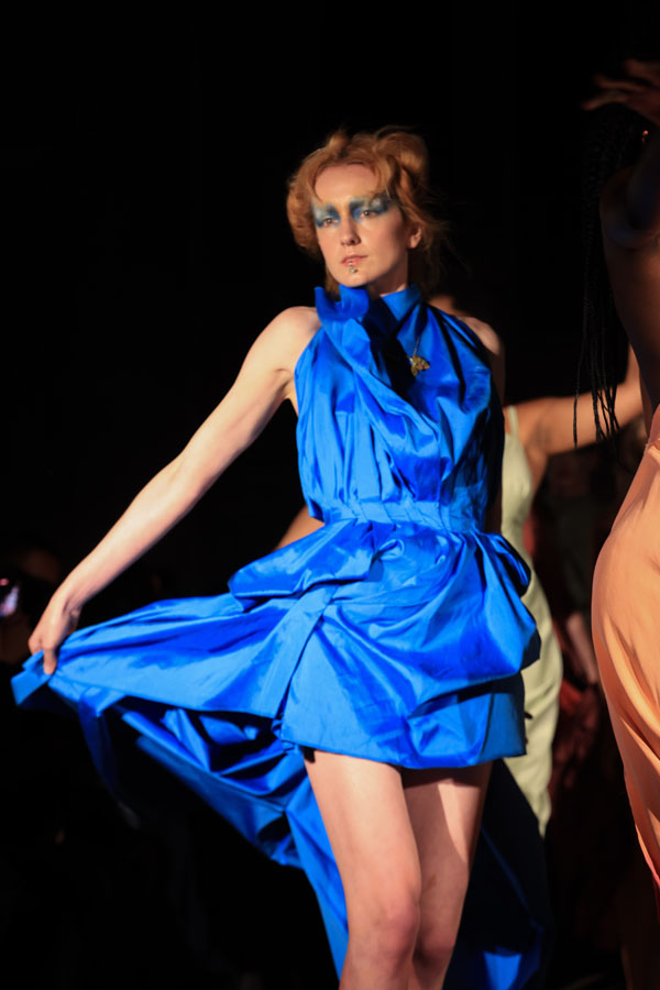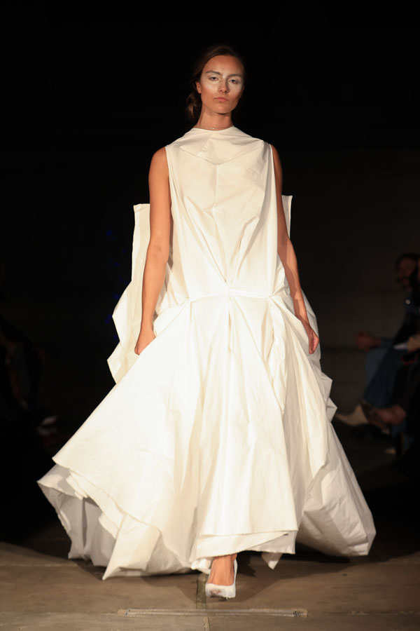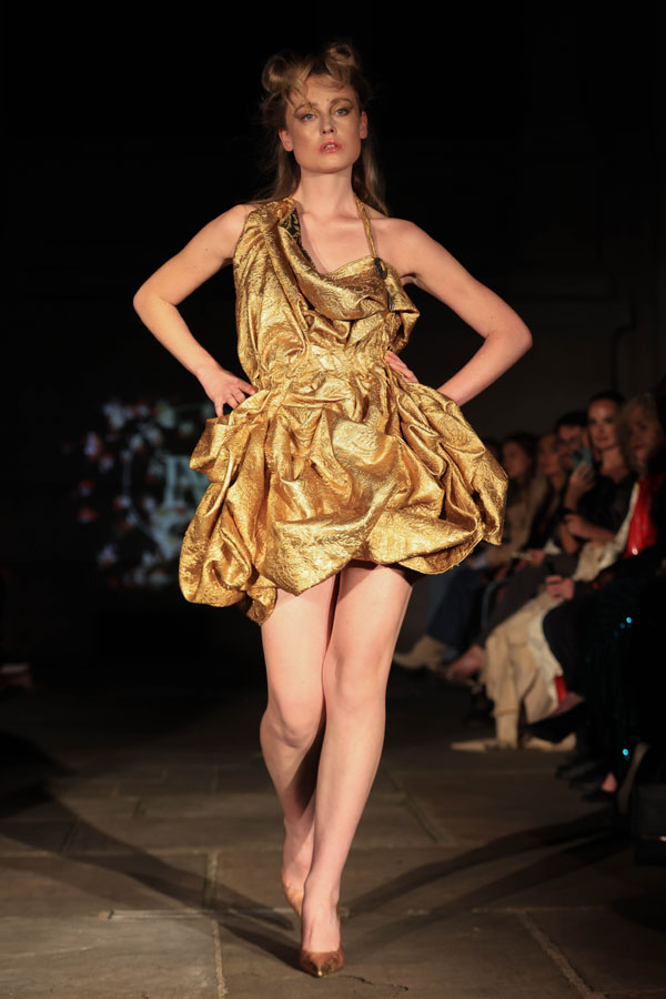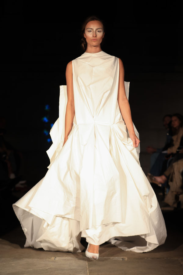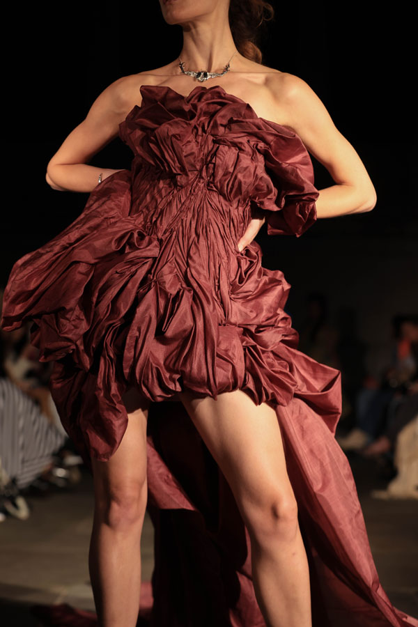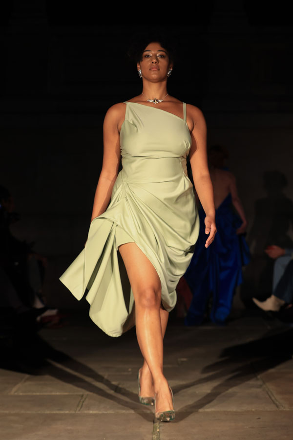 The collection also highlights Maclean’s commitment to inclusivity and sustainability. A maroon gown with gathered fabric and a dramatic silhoueRe leads the transition from soNness to strength, while the electric blue mini dress features bold, architectural folds. A blush pink oneshoulder dress and a gold sculptural mini dress stand out as statements of empowerment, blending striking textures with fluid designs.