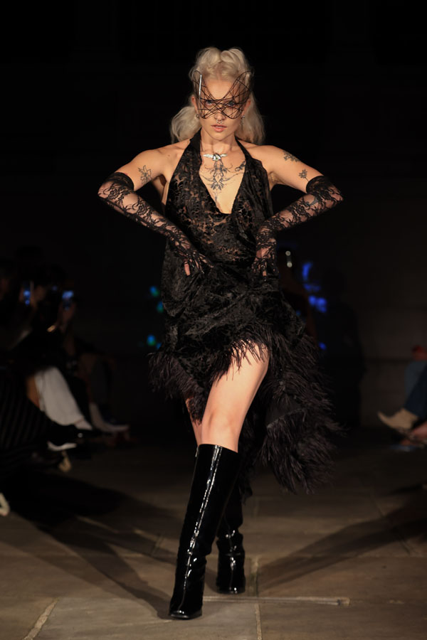 In ‘Into The Gloaming’, Maclean weaves these elements into a dramatic fashion narrative, where the models, like the sisters in RosseG’s poem, undergo a stunning transformation. As the show progresses, the collec5on takes the audience on a visual journey from innocence to darkness. The garments, which ini5ally feature soN pastel tones, evolve into more vibrant hues, and finally into deep, drama5c shades – mirroring the emo5onal arc of the sisters and their encounters with the goblins.
