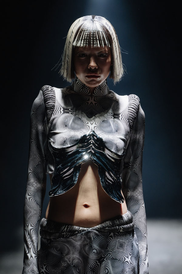 Through 3D-printed textiles and metals inscribed with sacred geometry and nebula imagery, the collection reconstructs bones, scales, and mechanical exoskeletons into new forms that imagine resilience and fragility as one. Traditional embroidery and jacquard are recast as vessels of information, intertwining with digital algorithms, creating an organic aesthetic that lives simultaneously in the past and the future.