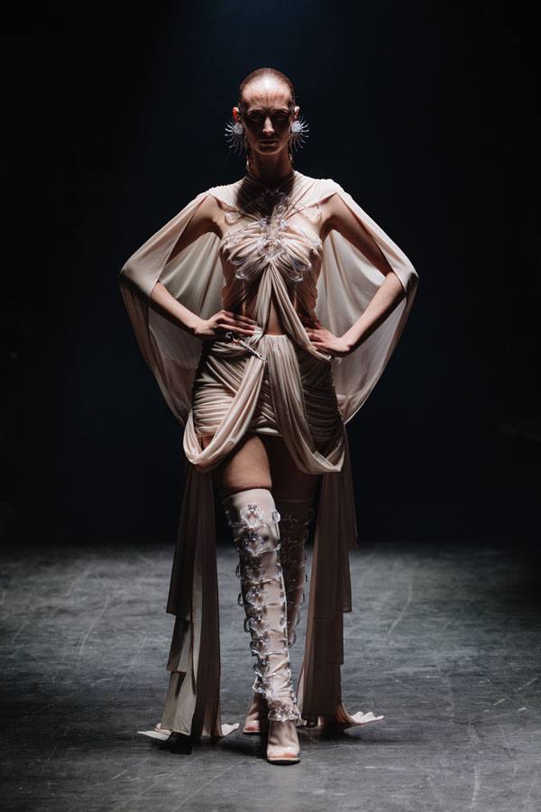 For SS26, HENGDI WANG presents EXOGENESIS. This collection is a meditation on the exogenous origins of life, where Eastern mythology converges with post-human biological constructs, digital craftsmanship, and futuristic materials. EXOGENESIS envisions clothing as more than ornament, more than protection. It is a vessel of memory, a code of survival, and a bridge between the cosmic and the human.