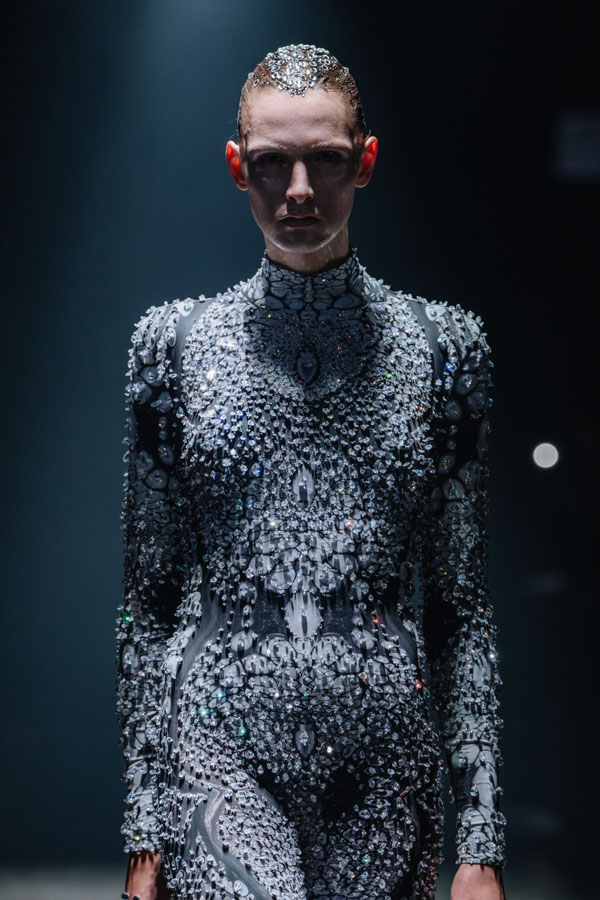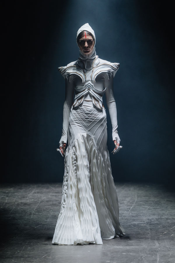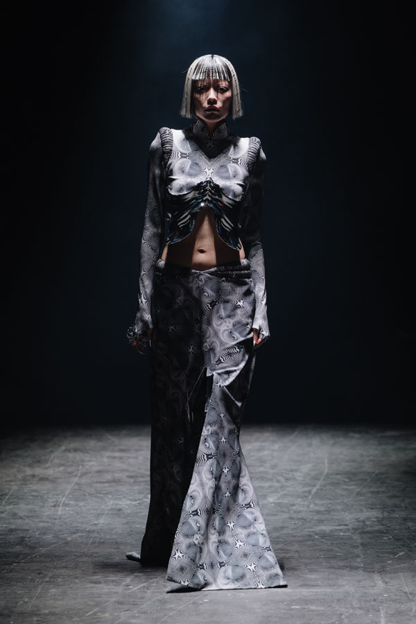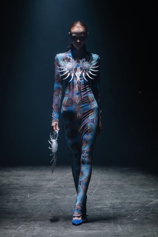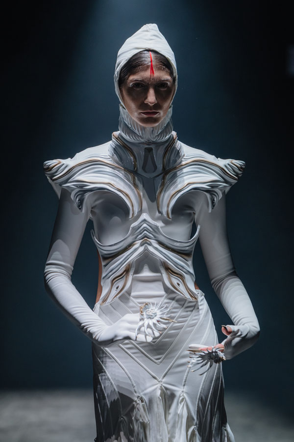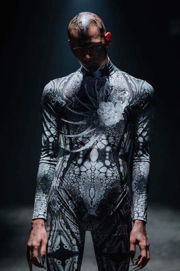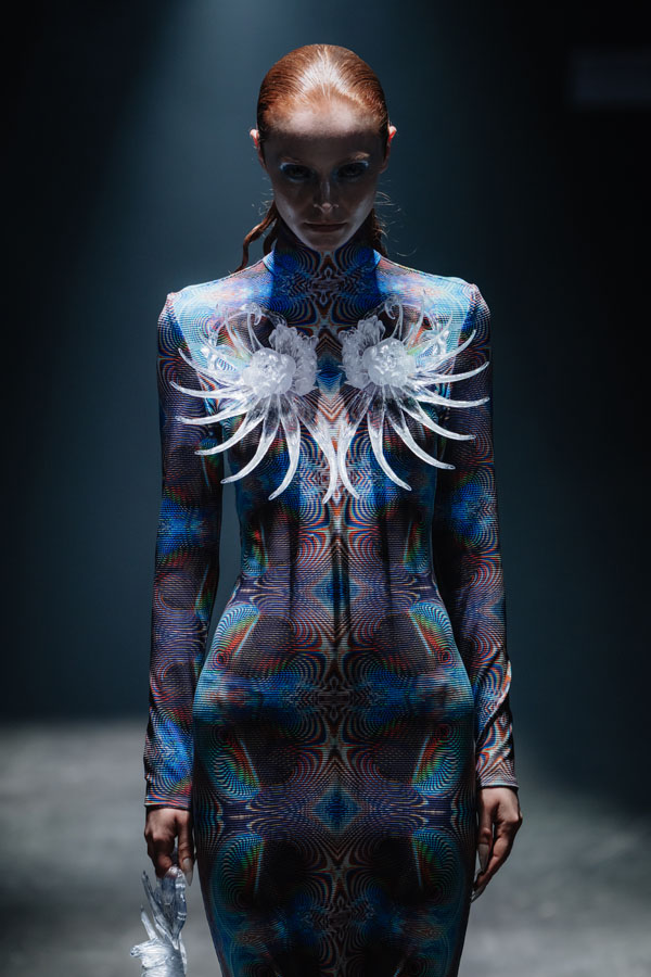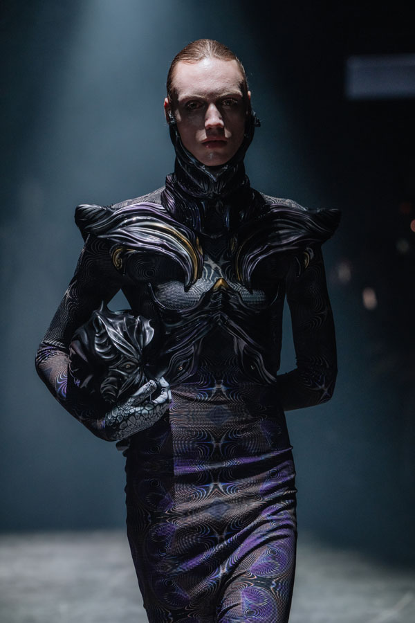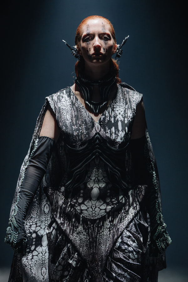 Through 3D-printed textiles and metals inscribed with sacred geometry and nebula imagery, the collection reconstructs bones, scales, and mechanical exoskeletons into new forms that imagine resilience and fragility as one. Traditional embroidery and jacquard are recast as vessels of information, intertwining with digital algorithms, creating an organic aesthetic that lives simultaneously in the past and the future.