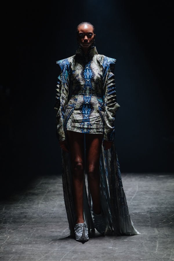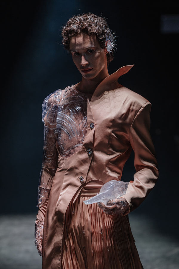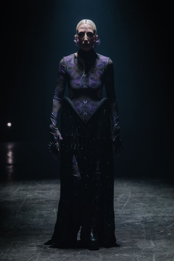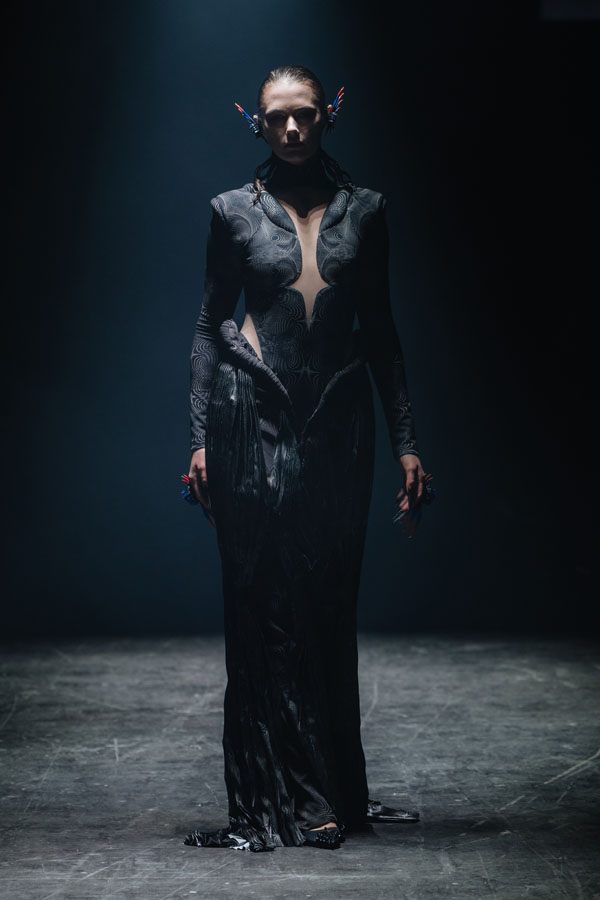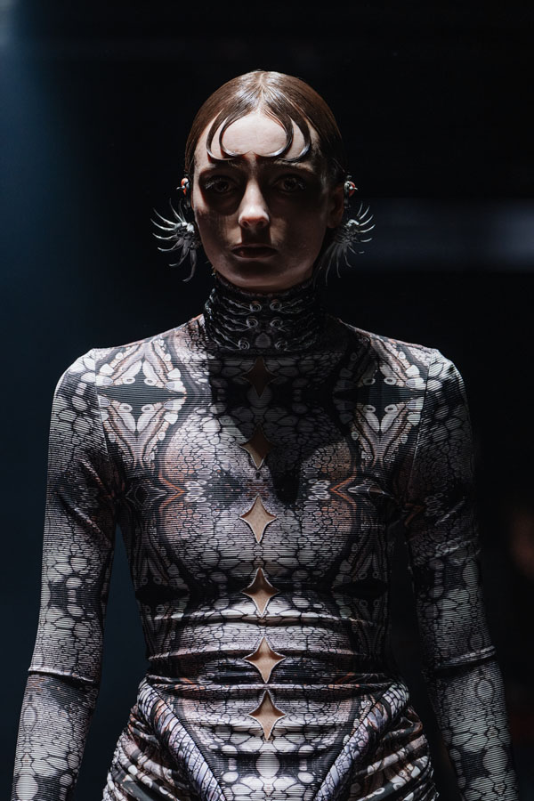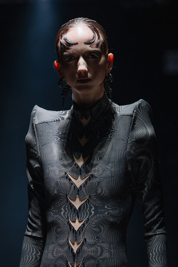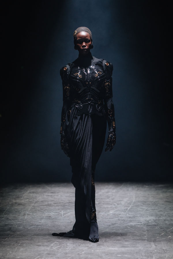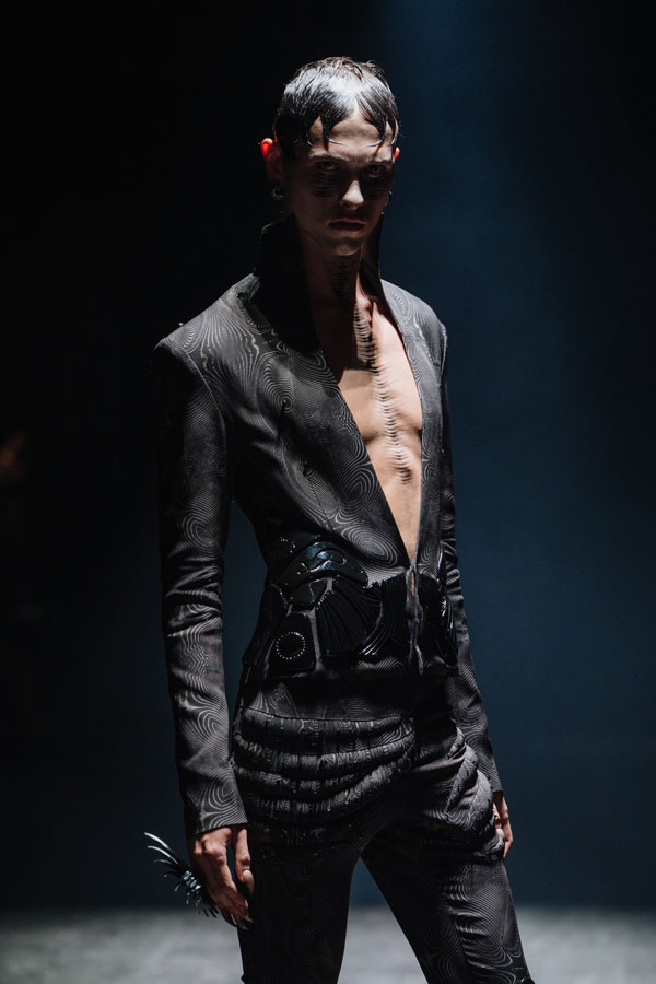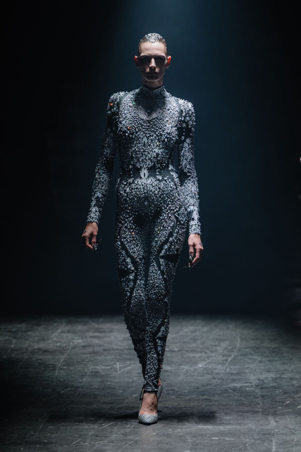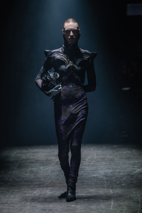 Through 3D-printed textiles and metals inscribed with sacred geometry and nebula imagery, the collection reconstructs bones, scales, and mechanical exoskeletons into new forms that imagine resilience and fragility as one. Traditional embroidery and jacquard are recast as vessels of information, intertwining with digital algorithms, creating an organic aesthetic that lives simultaneously in the past and the future.