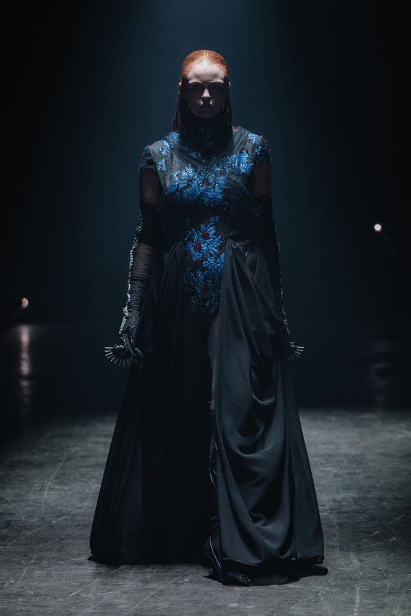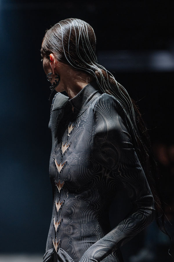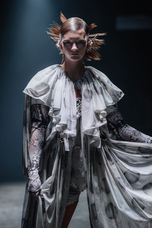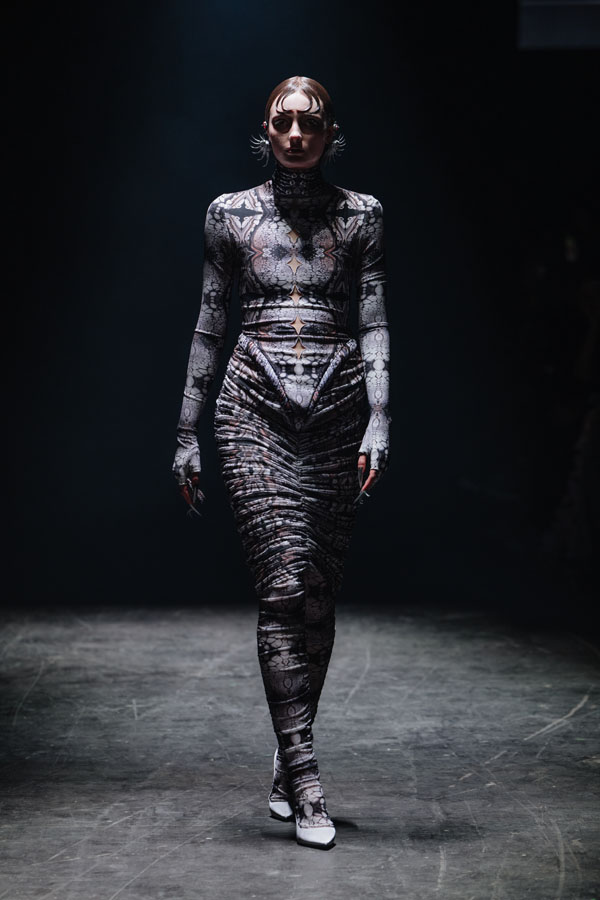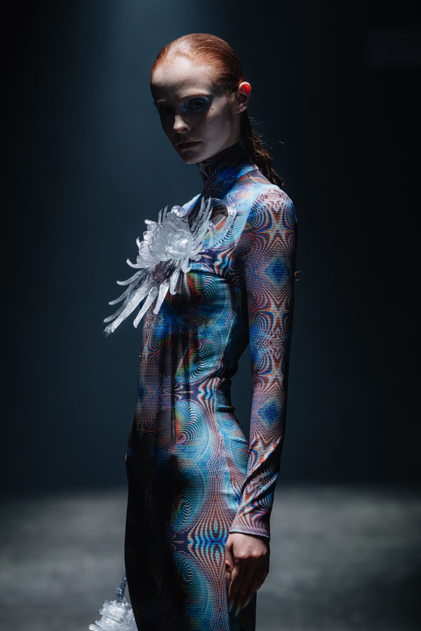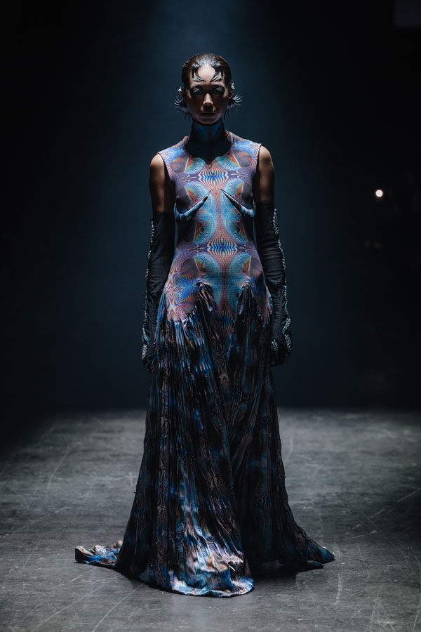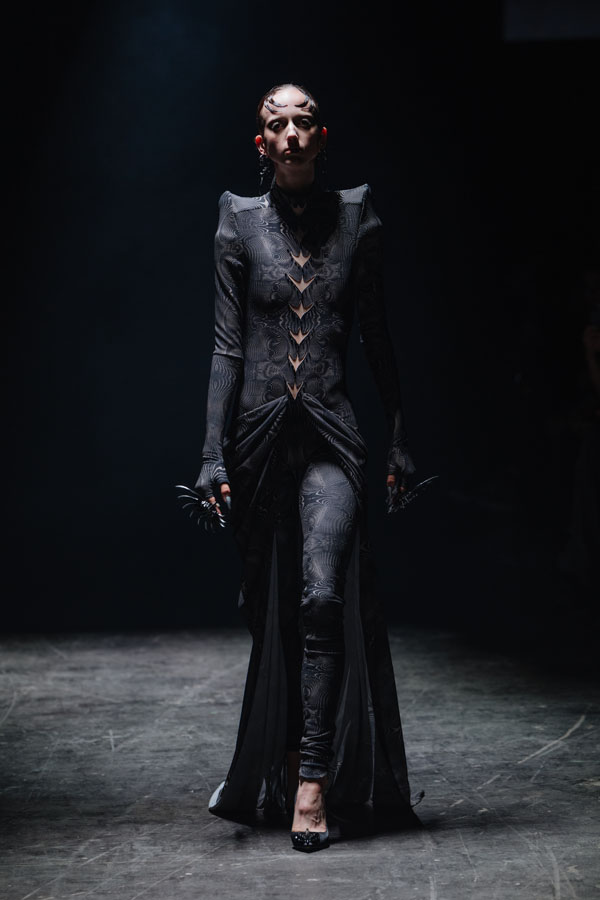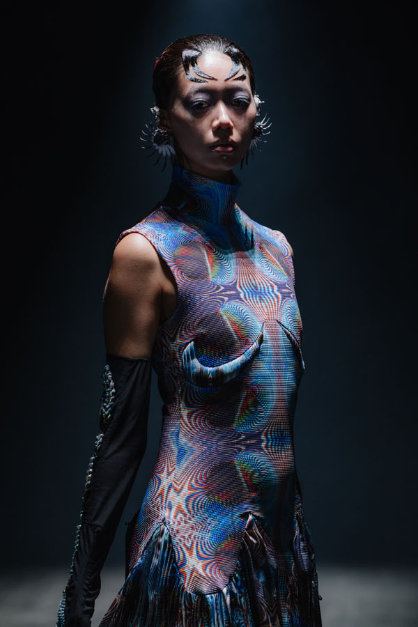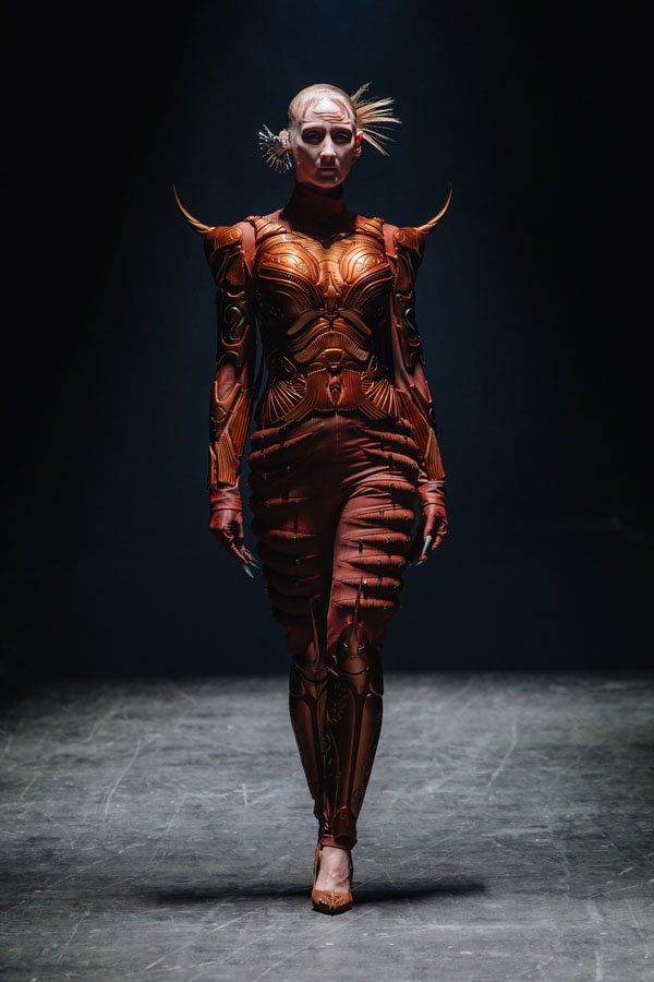 Through 3D-printed textiles and metals inscribed with sacred geometry and nebula imagery, the collection reconstructs bones, scales, and mechanical exoskeletons into new forms that imagine resilience and fragility as one. Traditional embroidery and jacquard are recast as vessels of information, intertwining with digital algorithms, creating an organic aesthetic that lives simultaneously in the past and the future.