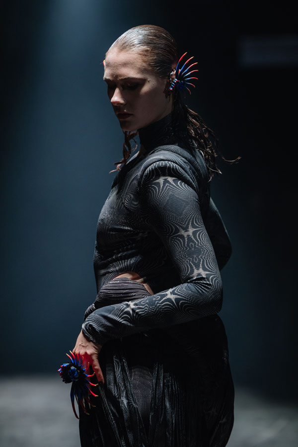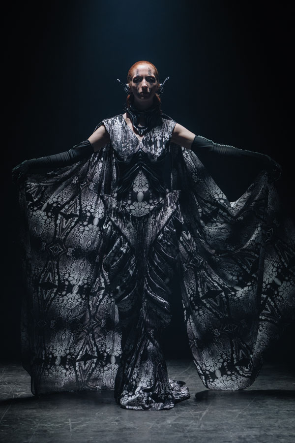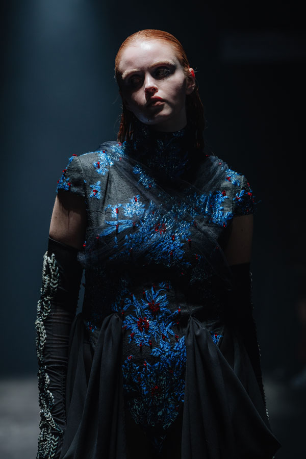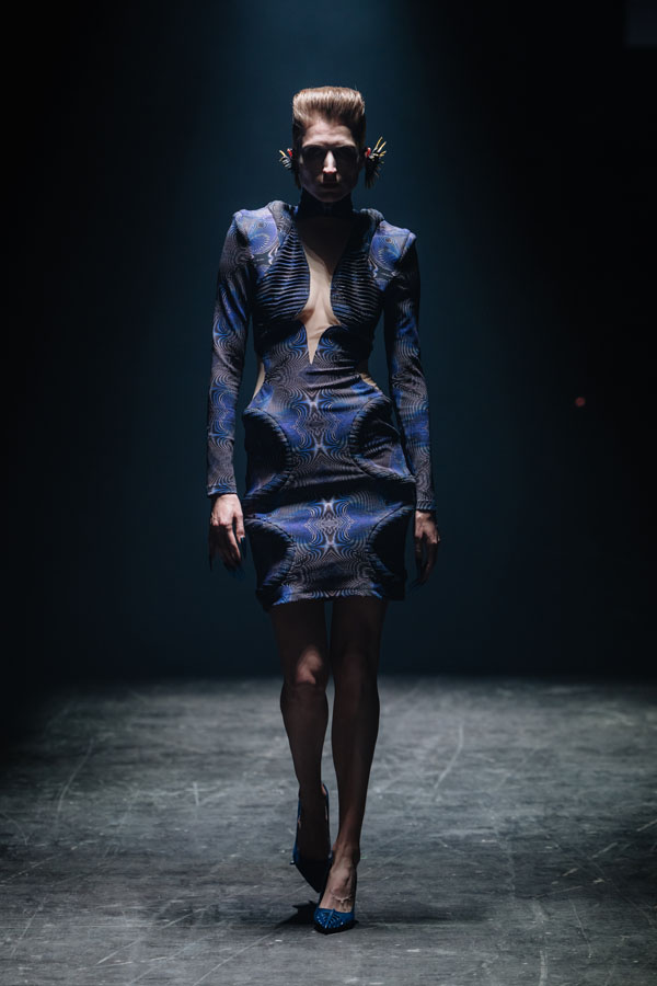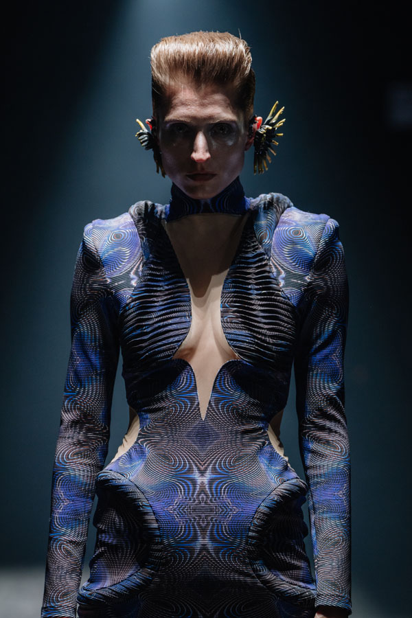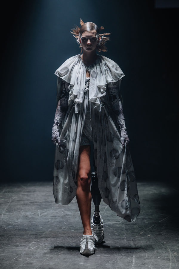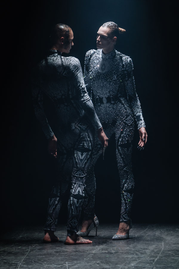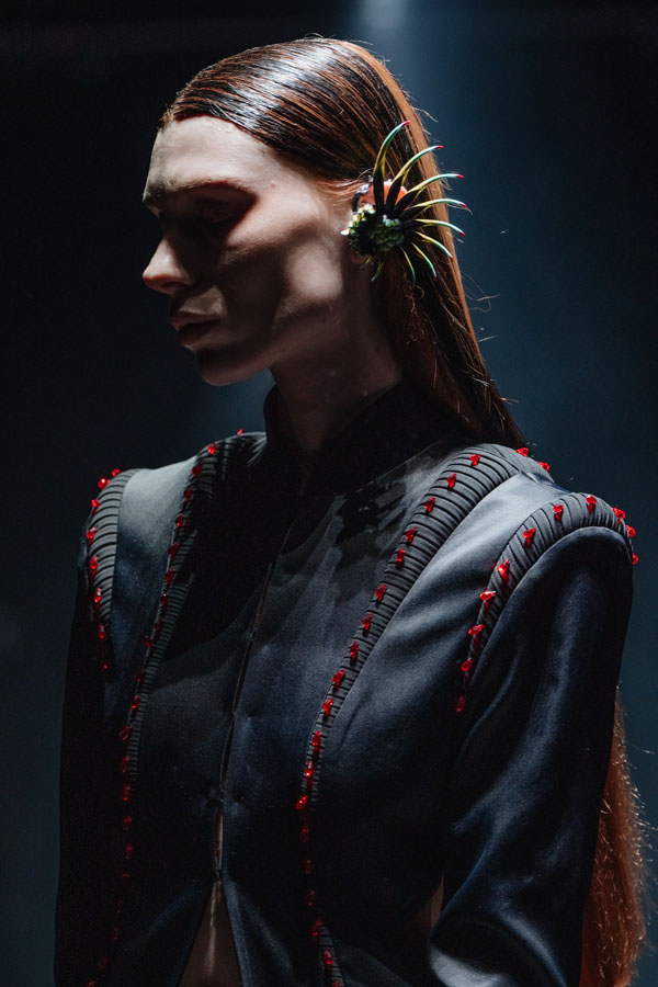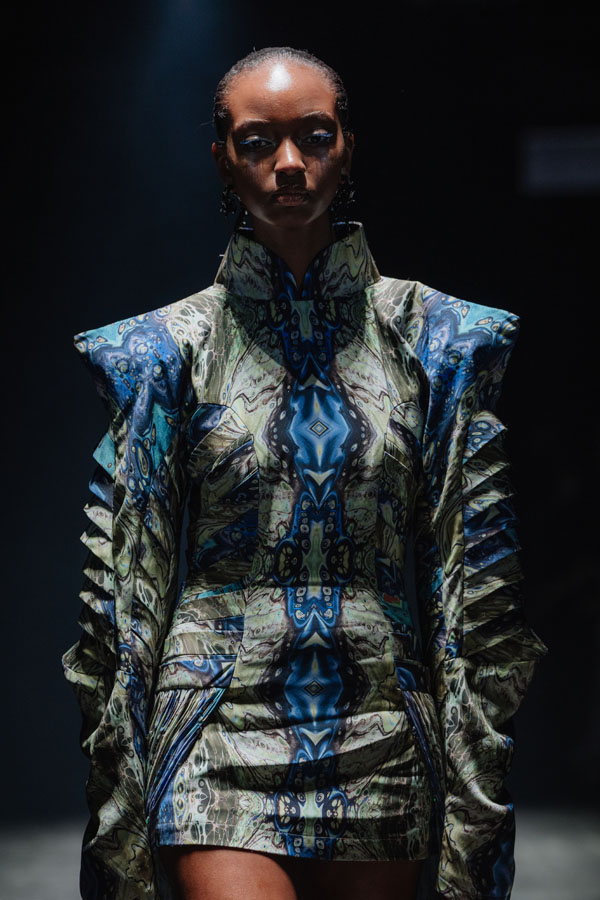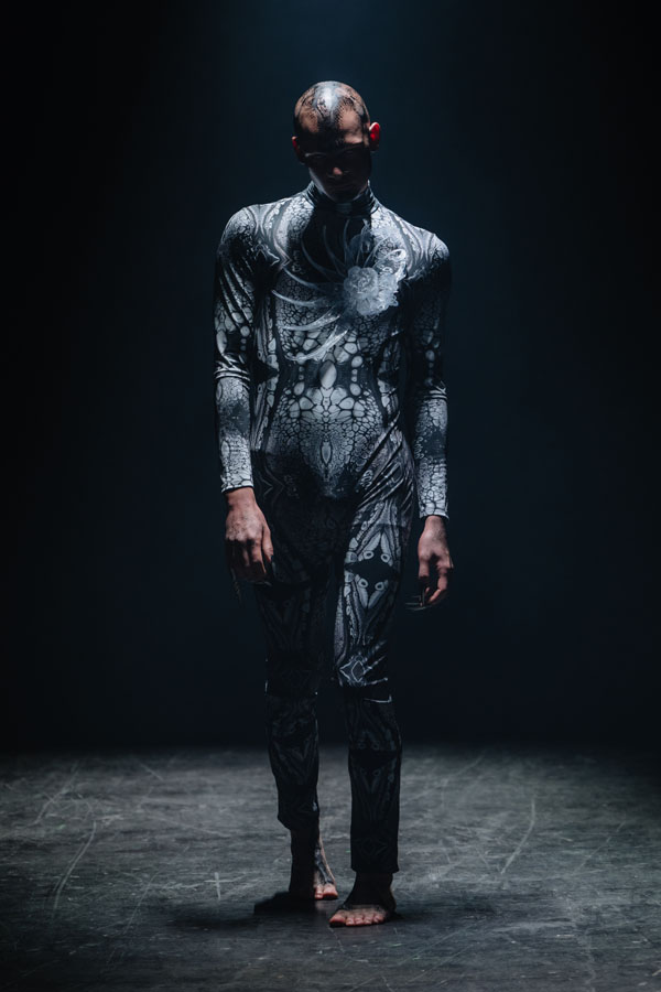 Through 3D-printed textiles and metals inscribed with sacred geometry and nebula imagery, the collection reconstructs bones, scales, and mechanical exoskeletons into new forms that imagine resilience and fragility as one. Traditional embroidery and jacquard are recast as vessels of information, intertwining with digital algorithms, creating an organic aesthetic that lives simultaneously in the past and the future.
