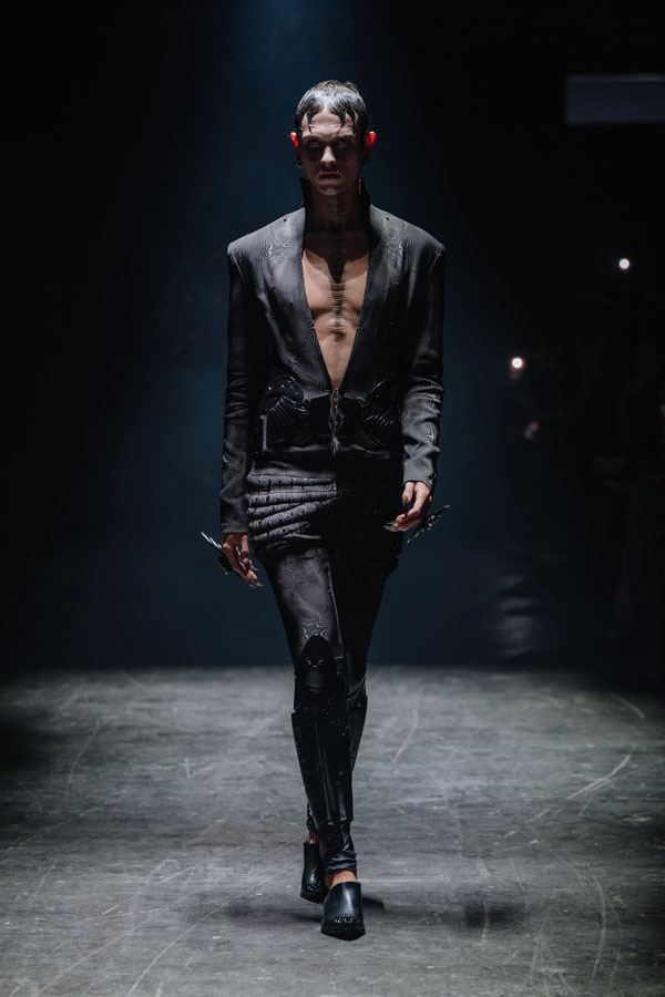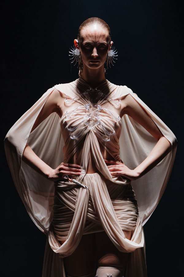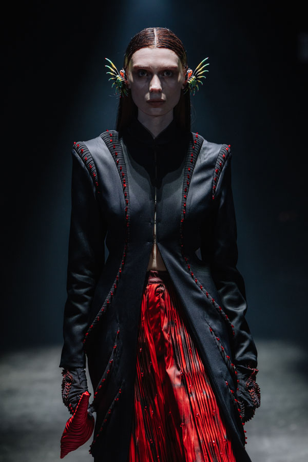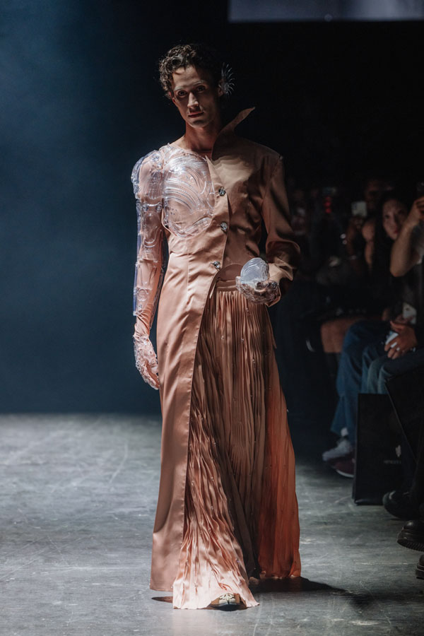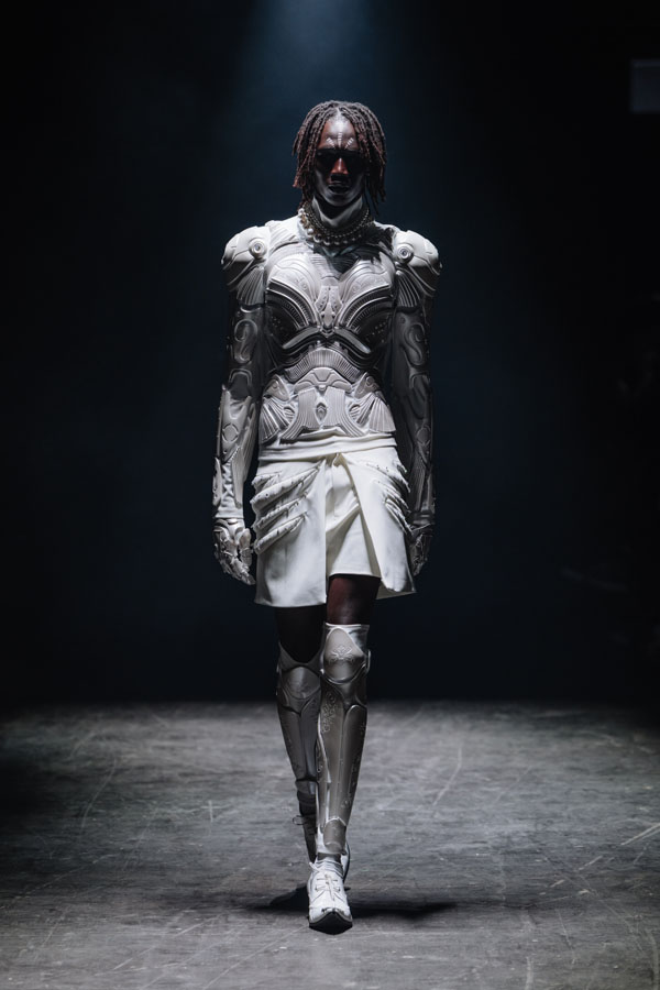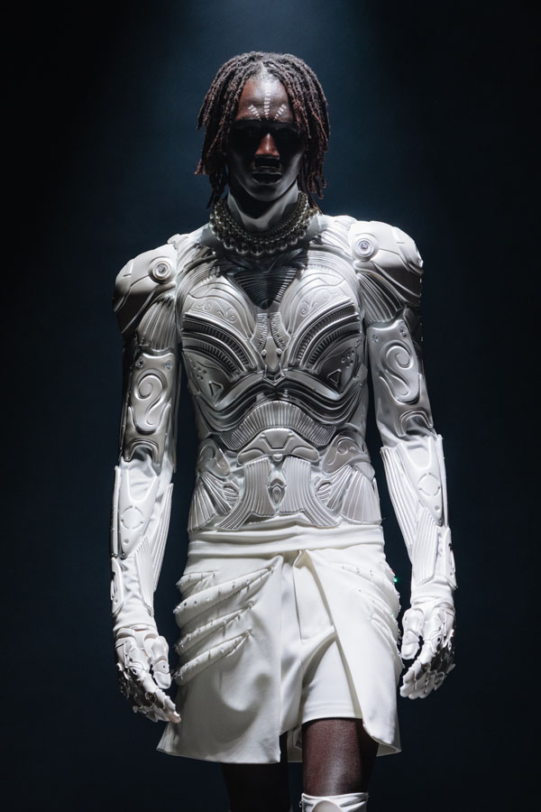 For SS26, HENGDI WANG presents EXOGENESIS. This collection is a meditation on the exogenous origins of life, where Eastern mythology converges with post-human biological constructs, digital craftsmanship, and futuristic materials. EXOGENESIS envisions clothing as more than ornament, more than protection. It is a vessel of memory, a code of survival, and a bridge between the cosmic and the human.