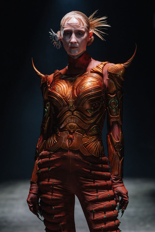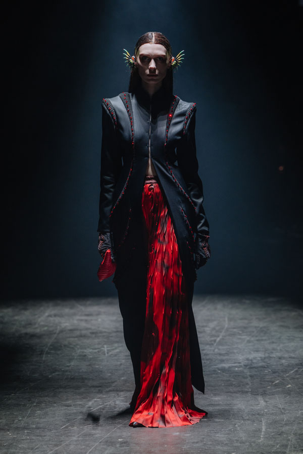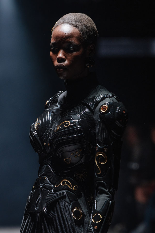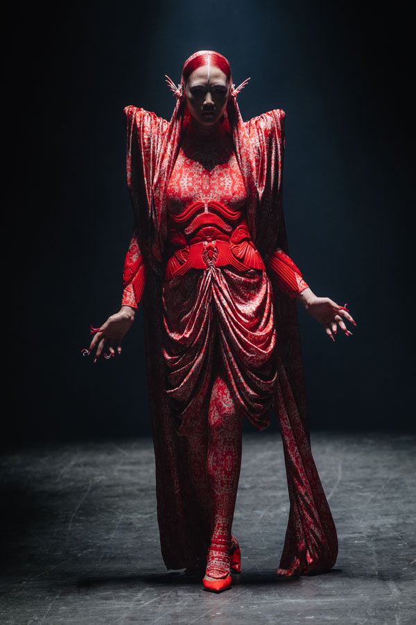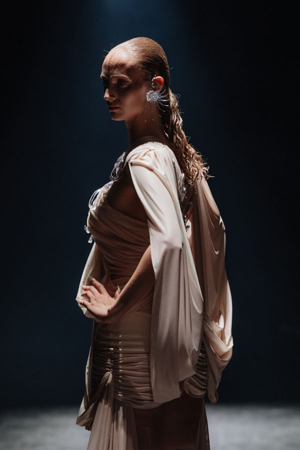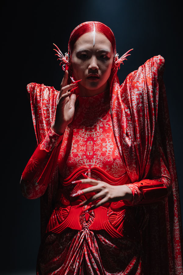 For SS26, HENGDI WANG presents EXOGENESIS. This collection is a meditation on the exogenous origins of life, where Eastern mythology converges with post-human biological constructs, digital craftsmanship, and futuristic materials. EXOGENESIS envisions clothing as more than ornament, more than protection. It is a vessel of memory, a code of survival, and a bridge between the cosmic and the human.