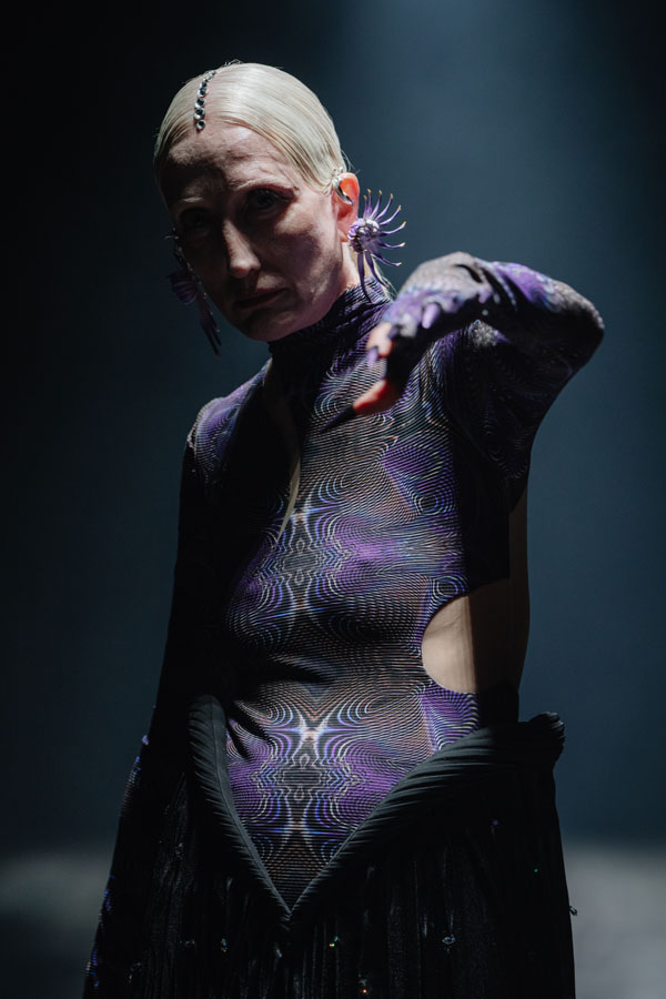- Borrowing from early inscriptions and digital coding, fabrics are laser-etched with “Mechanical Oracle Script,” a hybrid visual language of geometry, ancient scripts, and NASA celestial imagery. These garments glow with bio-luminescent filaments, acting as living codes that speak the narratives of connectedness across cosmic and cellular scales.