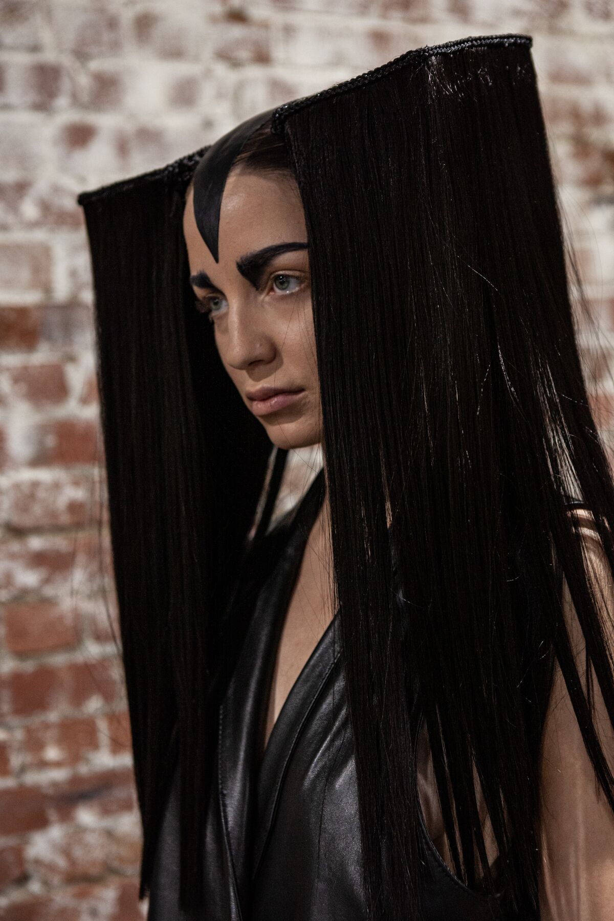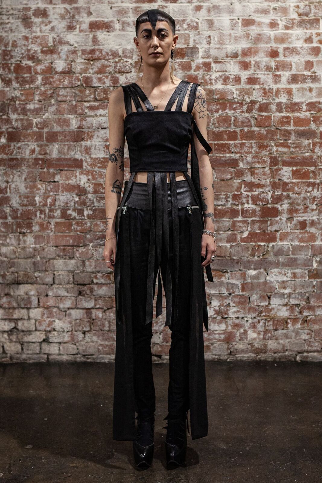 Lepore’s Spring show pays homage to what the designer described as “outsider society” and references an out-gendered theatrical ballroom where the illegal personality is enchained by a dancer during the show.