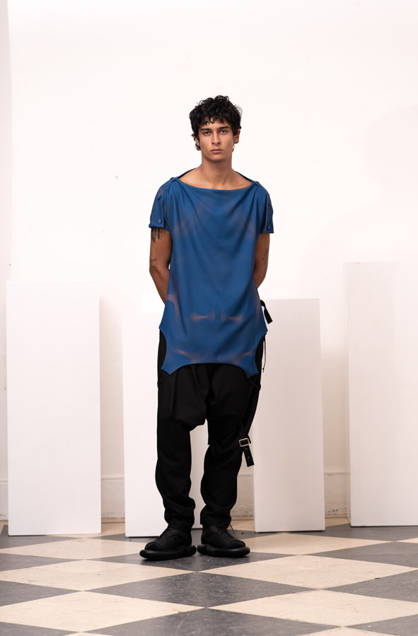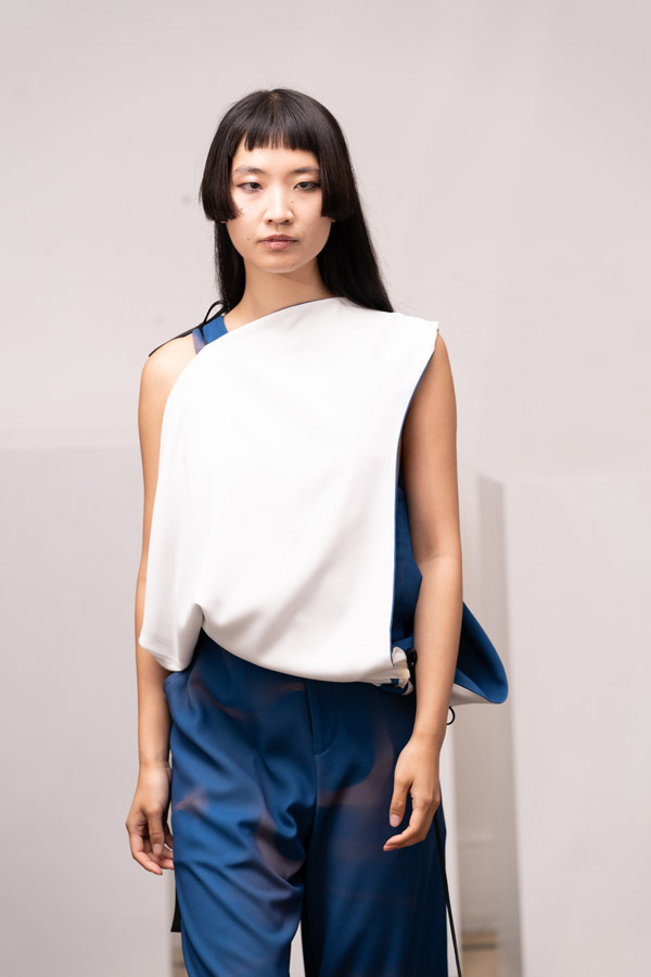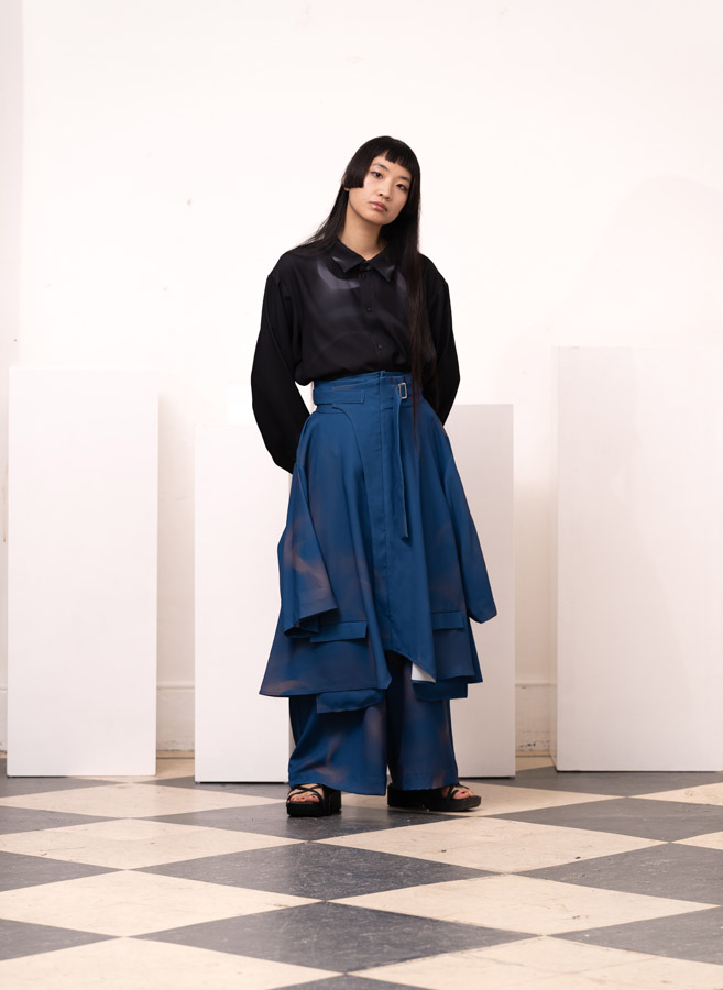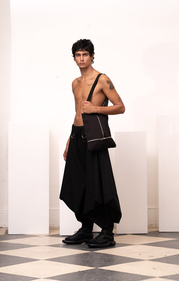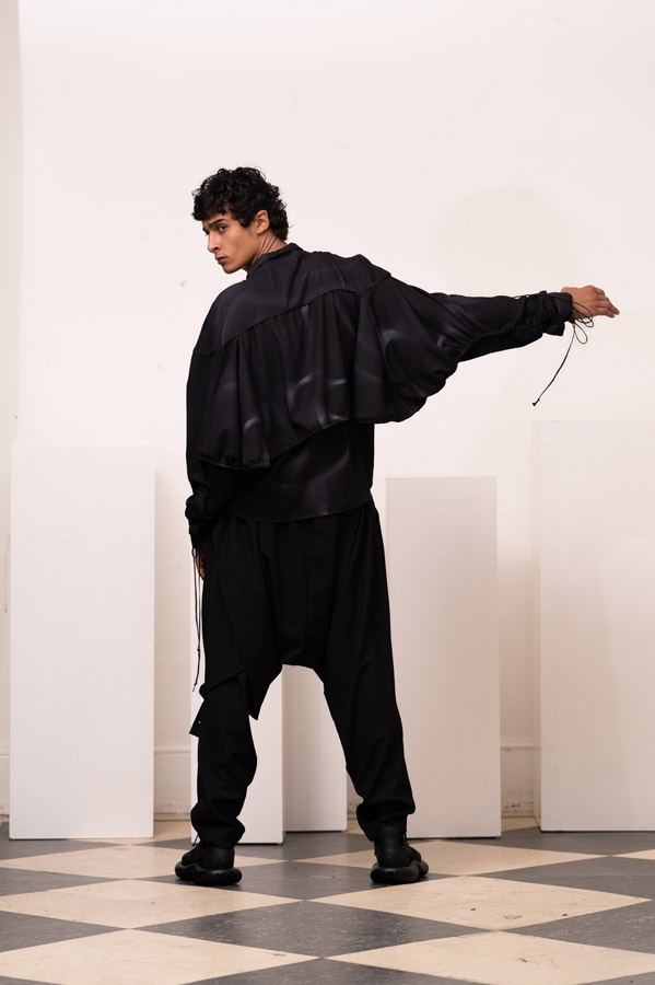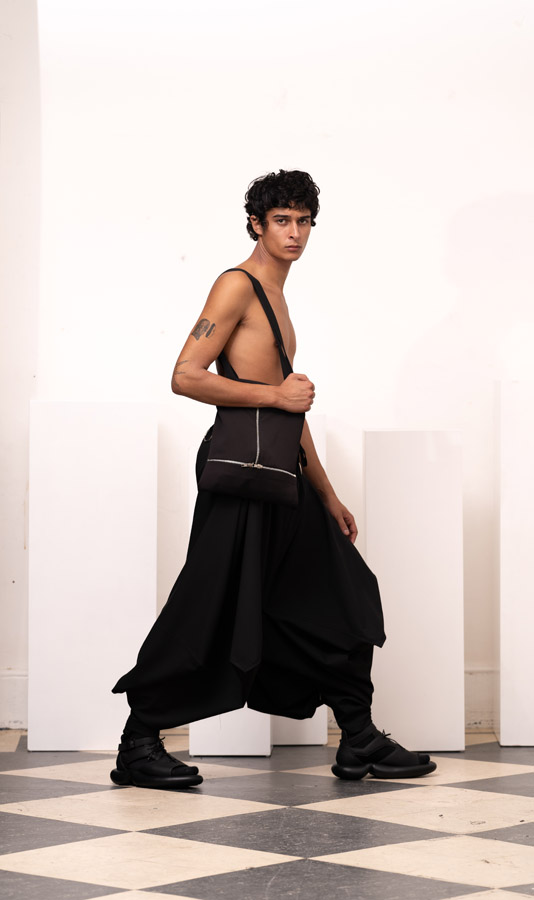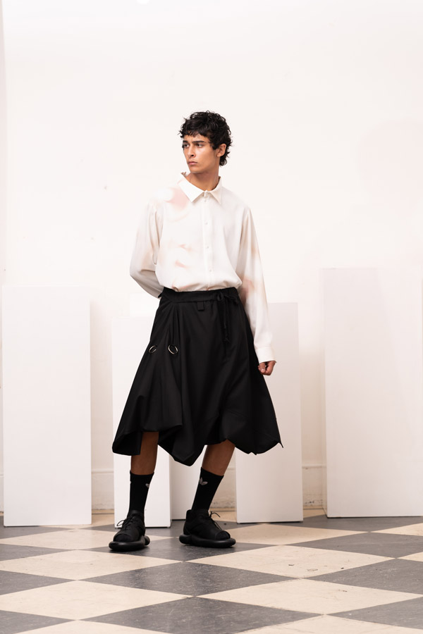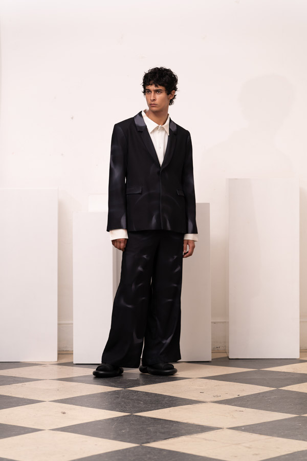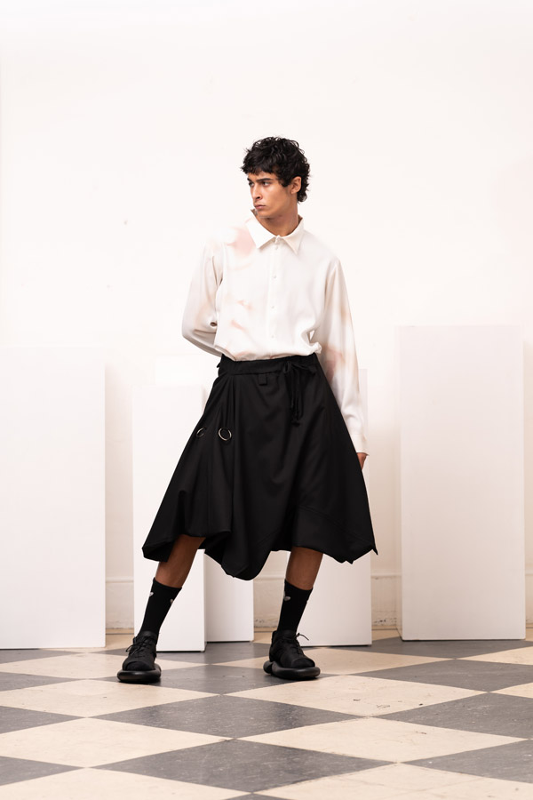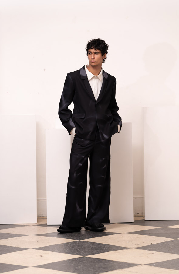 This season, Kuo Wei’s brain MRI images are reimagined and transformed into prints on the garments, creating a surreal yet meaningful vibe that echoes the brand’s abstract deconstruction approach. Beyond the prints, this collection also brings INF’s perspective on sustainable fashion to the forefront. Kuo Wei believes that while recycling old clothes and upcycling are great, he’s more interested in addressing fashion waste before it even happens. That’s why INF’s famous multi-wear series has reached its peak this season. Through innovative design, he gives a single garment multiple ways to be worn, such as turning a bag into a T-shirt or a skirt into pants. “By giving clothes multiple identities, we’re offering more than just a fashion item. Besides being stylish and functional, we hope it can adapt to various occasions and accompany the wearer for a long time, thereby reducing fashion waste.