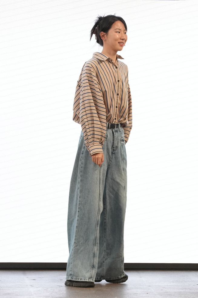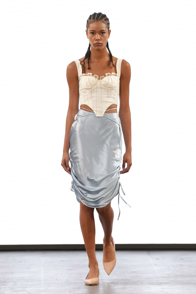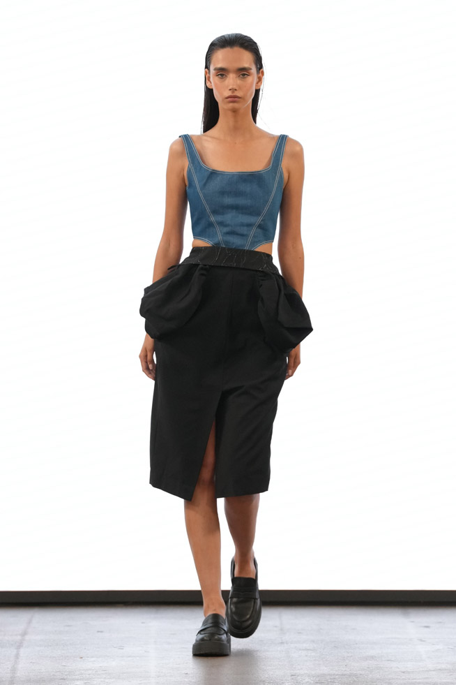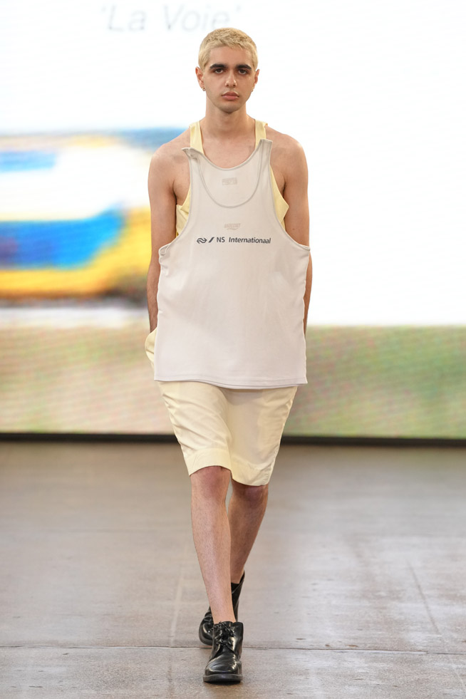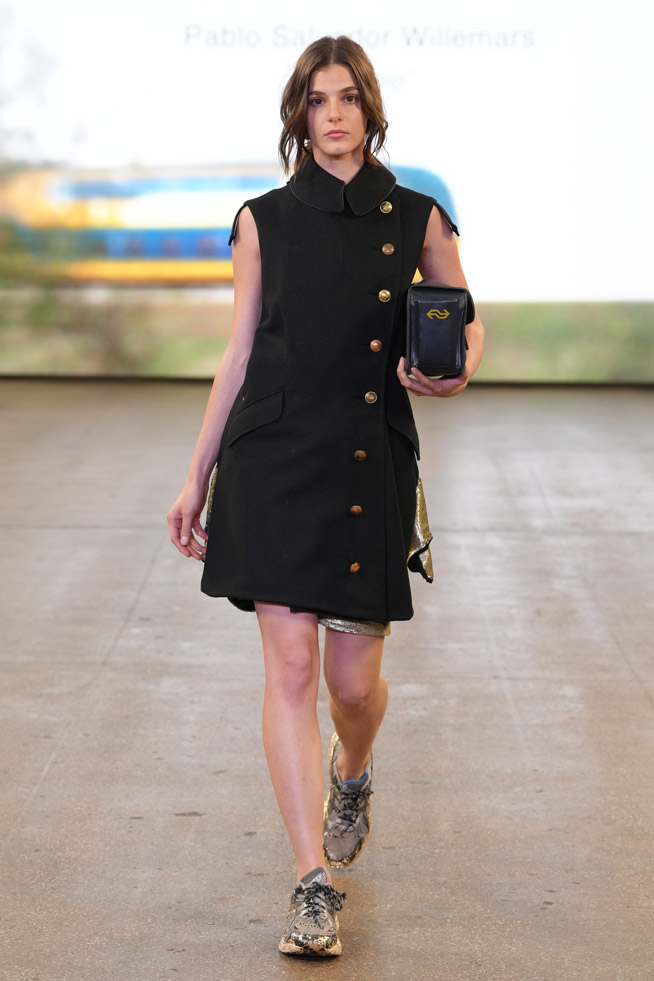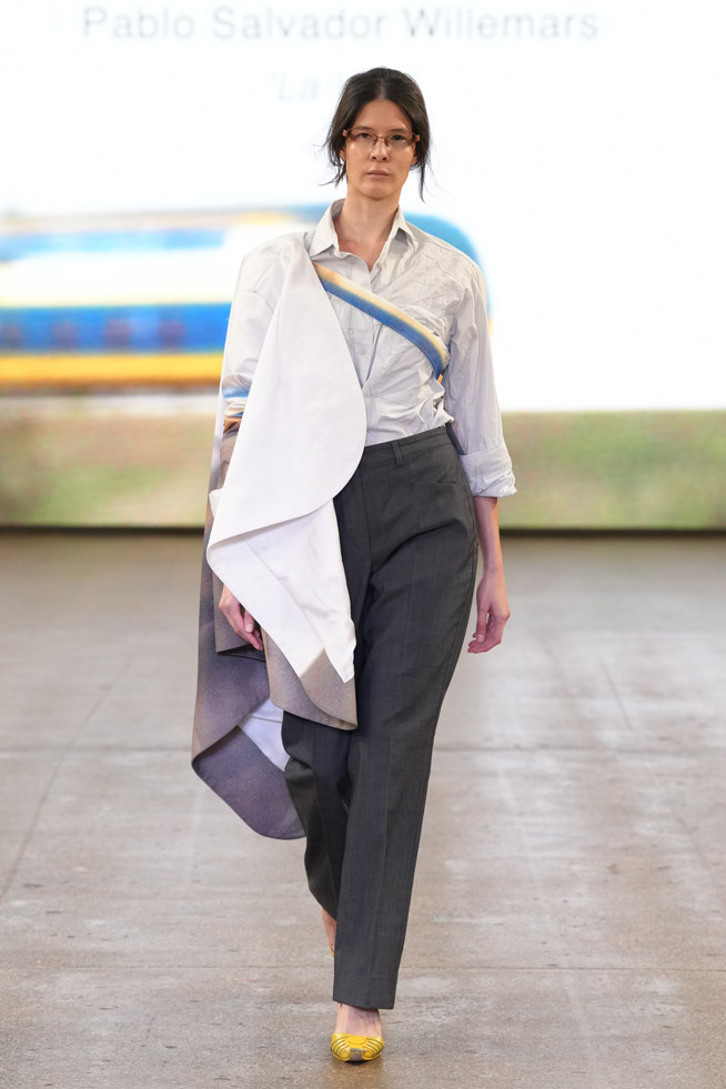 Pablo Salvador Willemars mesmerizes audiences with “La Voie,” a collection inspired by the rich history of Dutch railway operator, Nederlandse Spoorwegen (NS). Building on his 2022 collection, Willemars infuses this line with a lyrical perspective, drawing from the rhythmic cadence of NS trains traversing Dutch landscapes. Soft yellows, off whites, and vibrant pinks pay homage to NS’s legacy. Willemars breathes new life into existing garments and objects, infusing them with layers of history and purpose. By challenging gender norms, Willemars envisions a more inclusive fashion landscape.