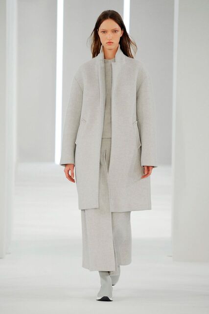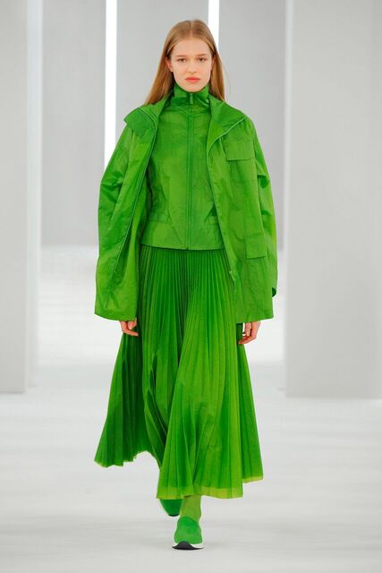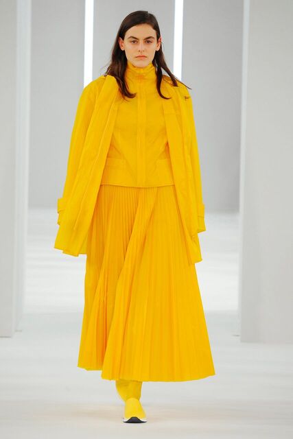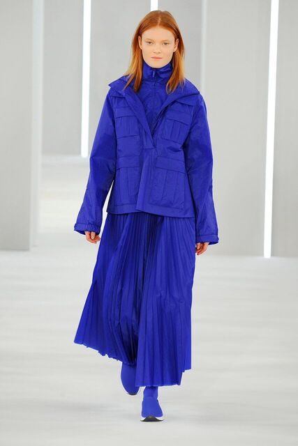 Glacial Grey polar opposite to bursts of Ultra-colour. Weatherproofed technical layers and oceans of pleats.