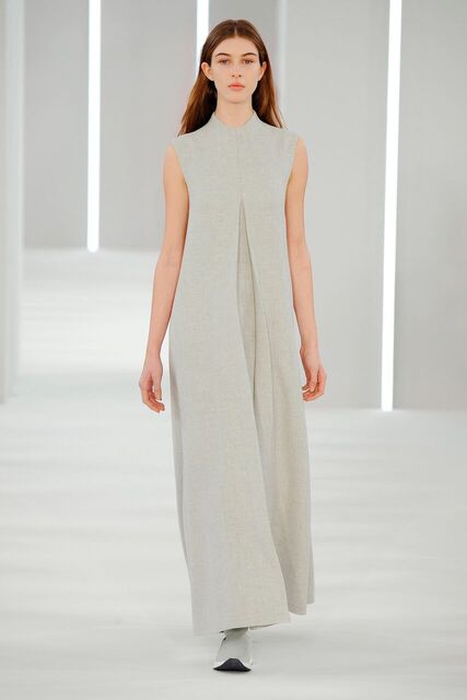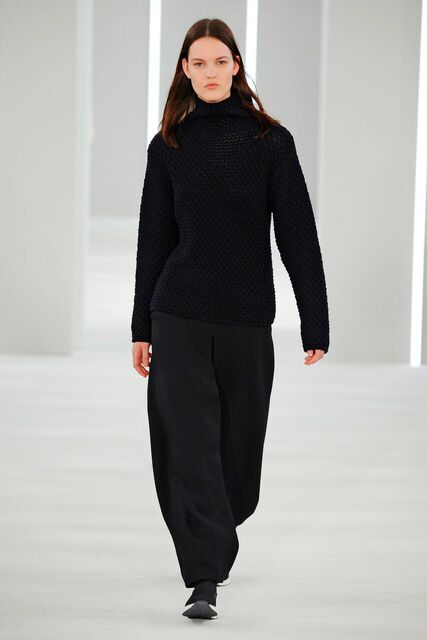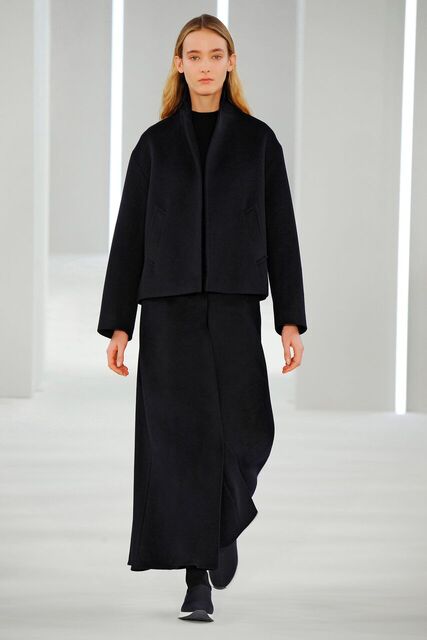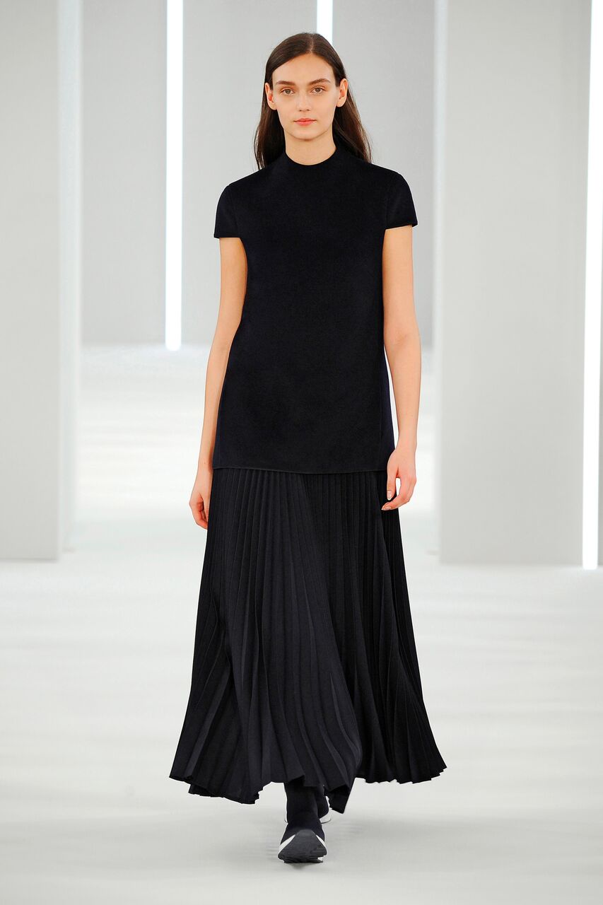 Sporty precision moulded cashmere. Coat, dress, skirt, top, A-line shape. Trousers pleated and divided.