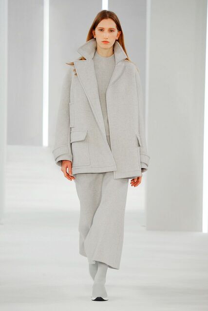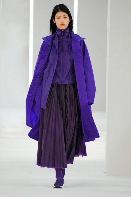 Glacial Grey polar opposite to bursts of Ultra-colour. Weatherproofed technical layers and oceans of pleats.