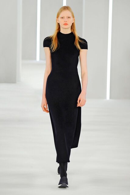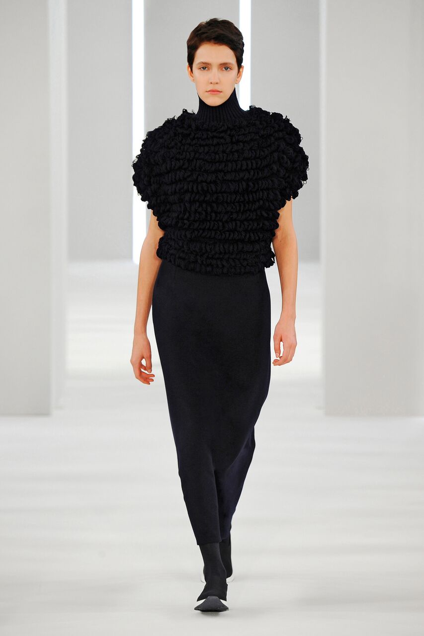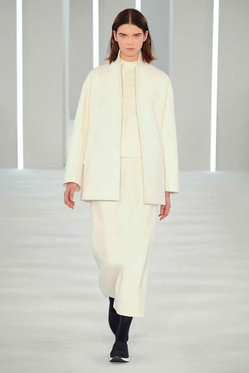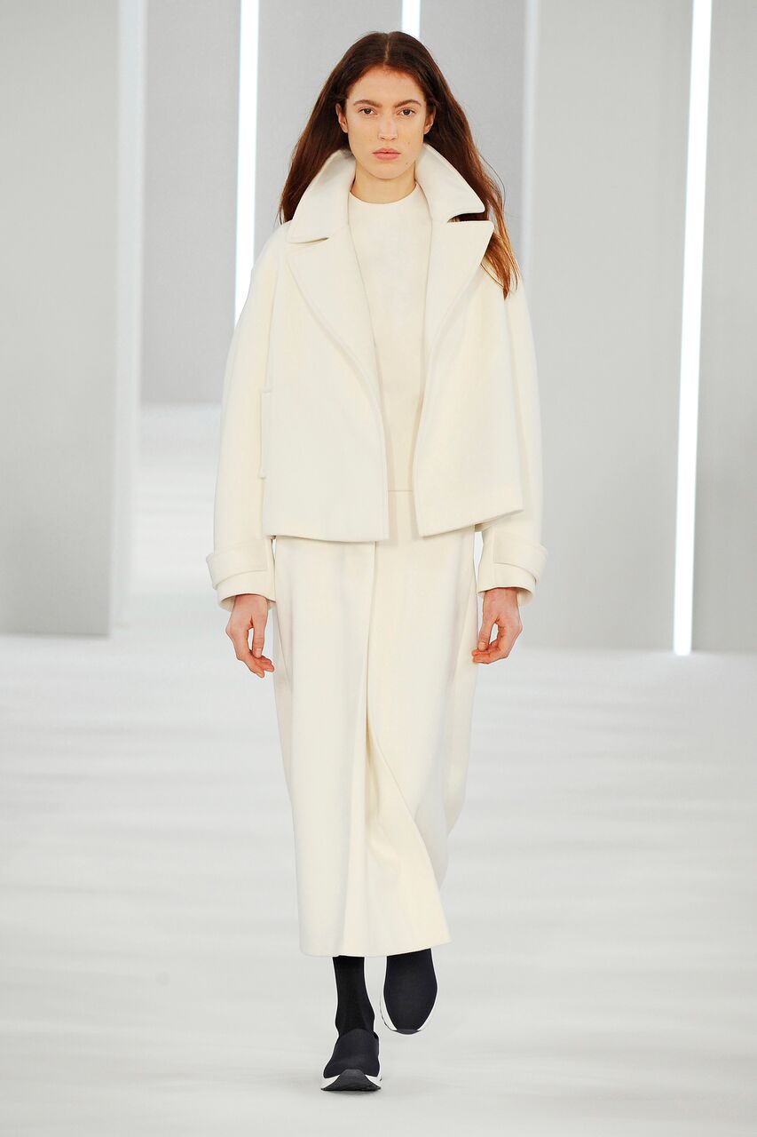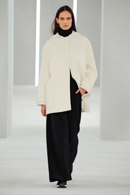Sporty precision moulded cashmere. Coat, dress, skirt, top, A-line shape. Trousers pleated and divided.