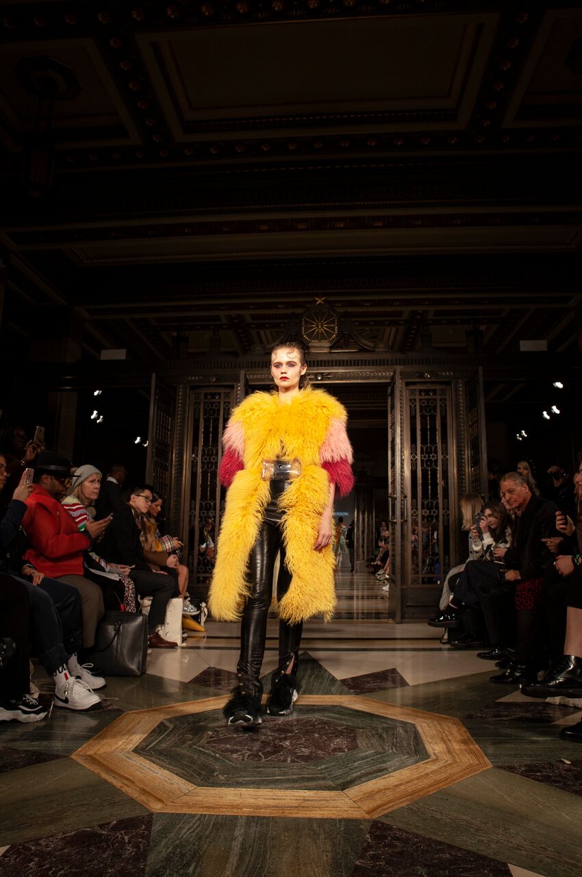 J’ayne AW19 integrates hand-painted leathers with engineered hand-drawn digital prints, luxe woven painted fabrics, silks and draped leathers, with delicate hand embroidered tulle, mesh and lace, silk jersey and lace lingerie which are contrasted with structured architectural silhouettes. The colour pallet is rainbow brights including; shaggy shearling in pink, yellow, orange, red, black and white, lamb nappas and a pop of primary red leathers. This season Pierson also collaborates with leading sports brand, Skechers, who are taking sport shoes in an entirely new and innovative direction.