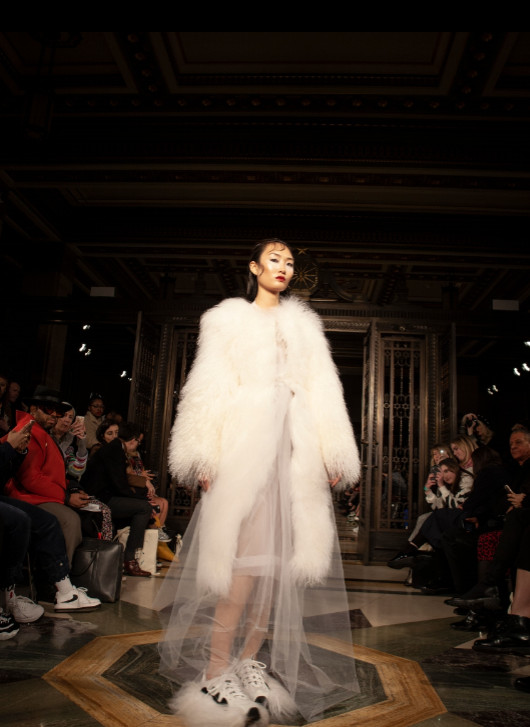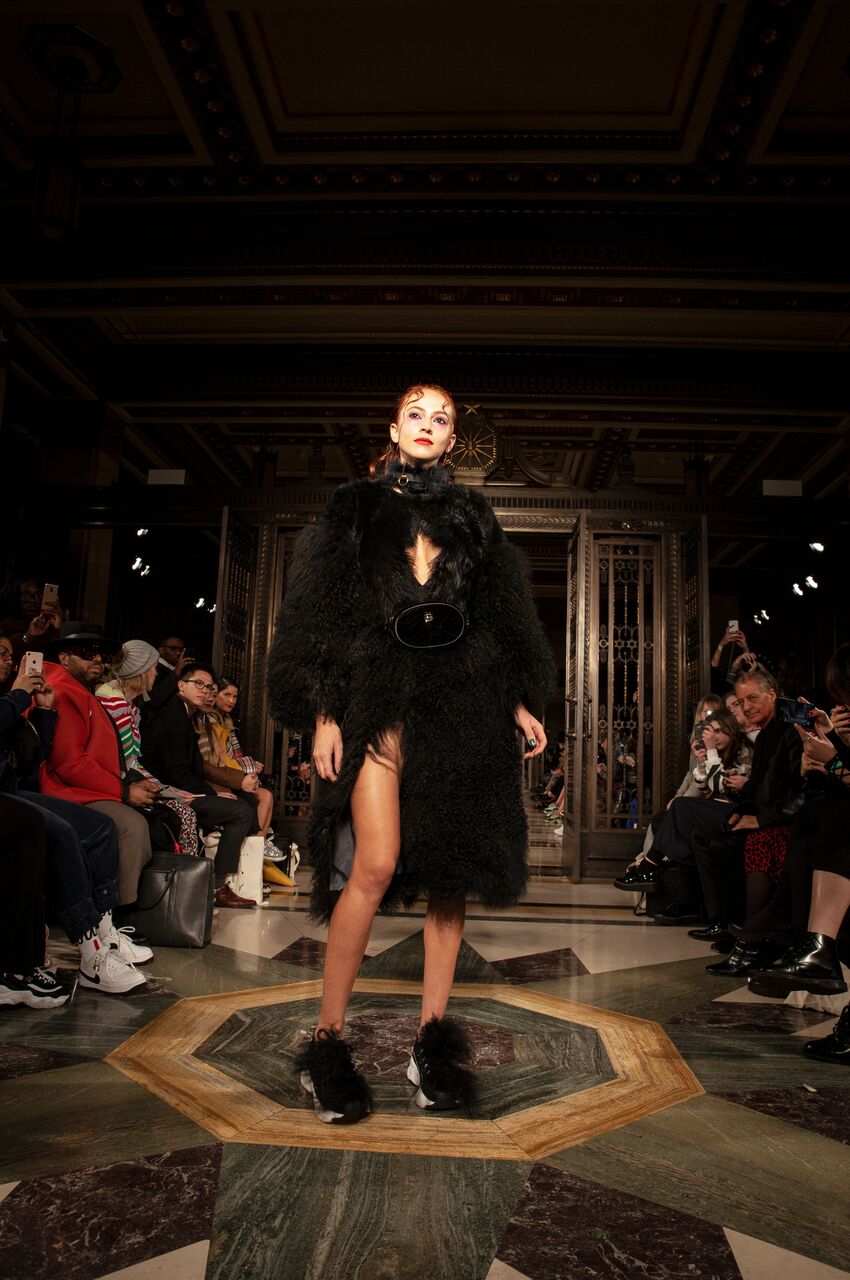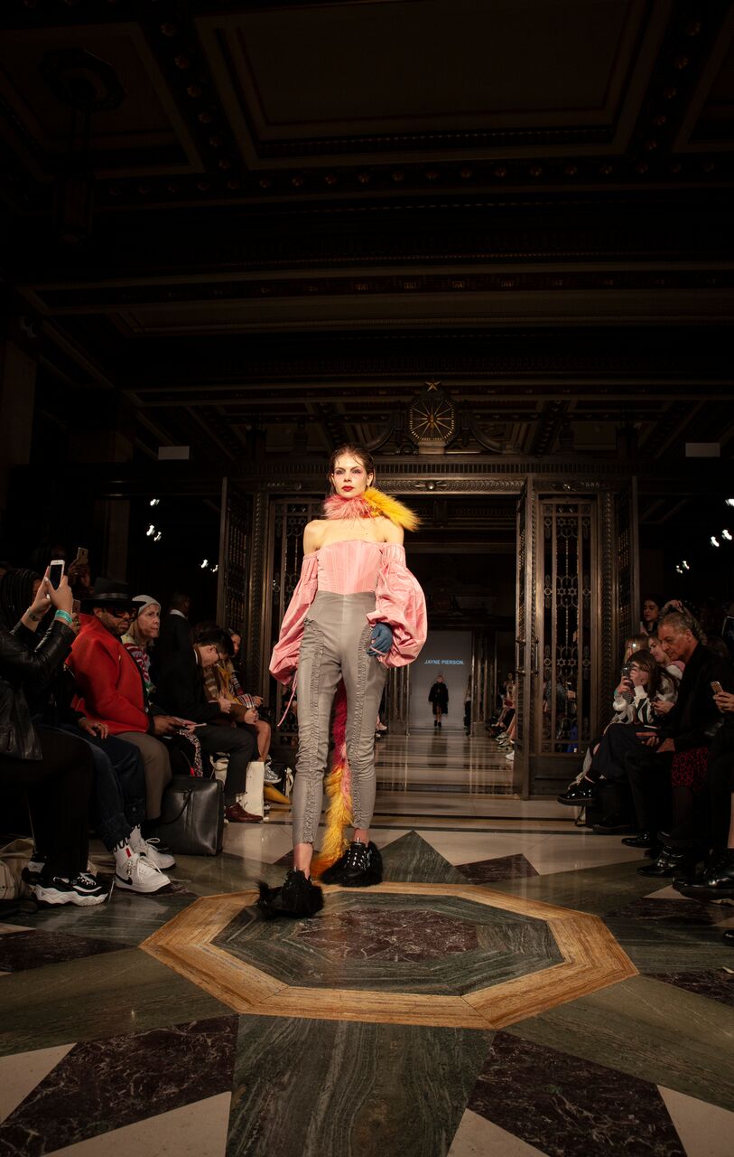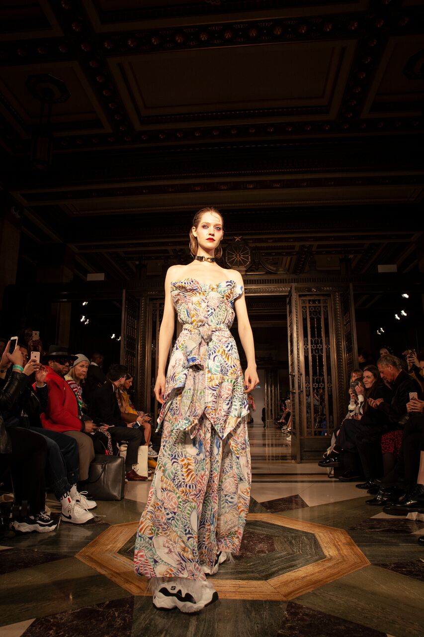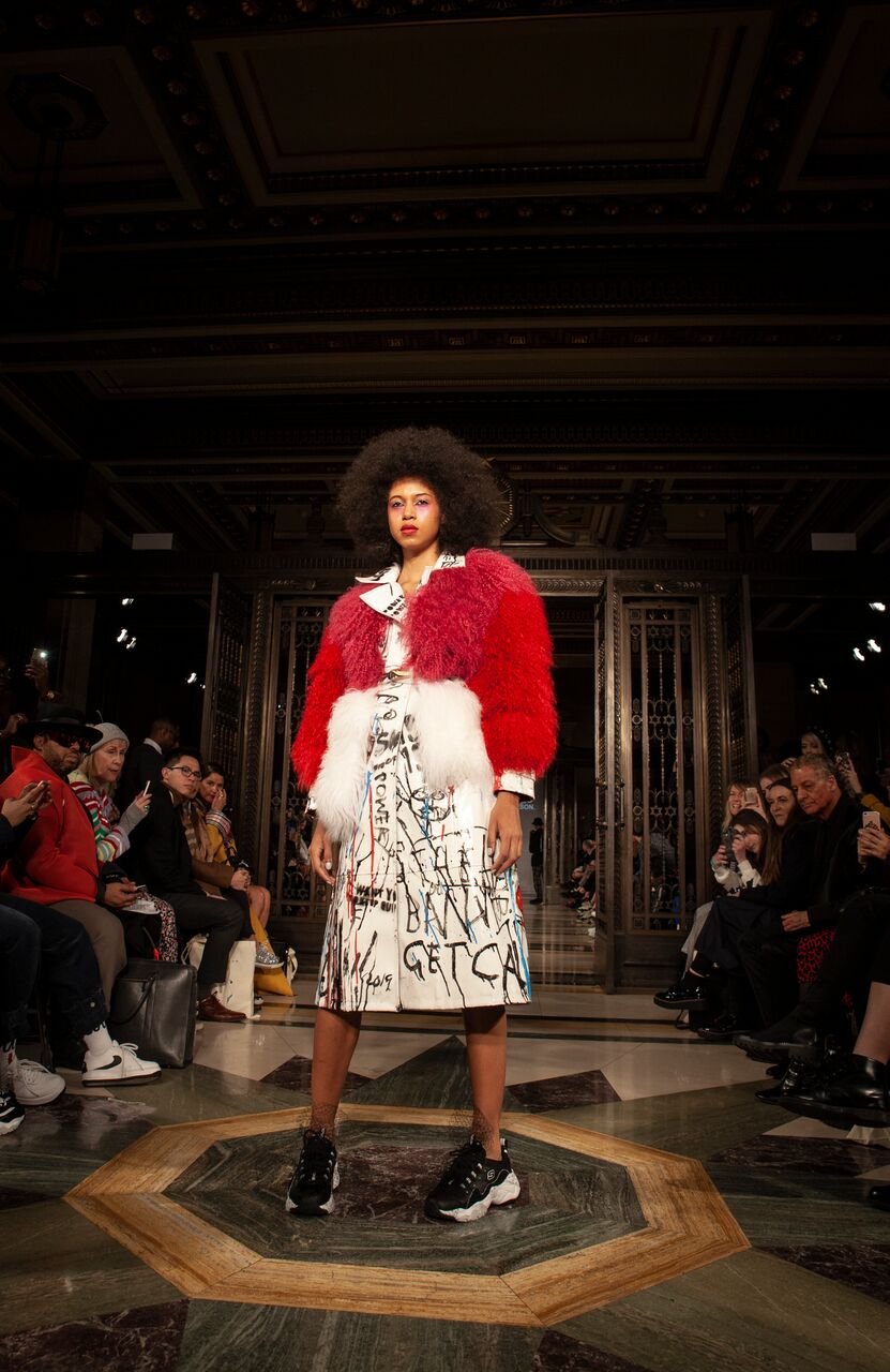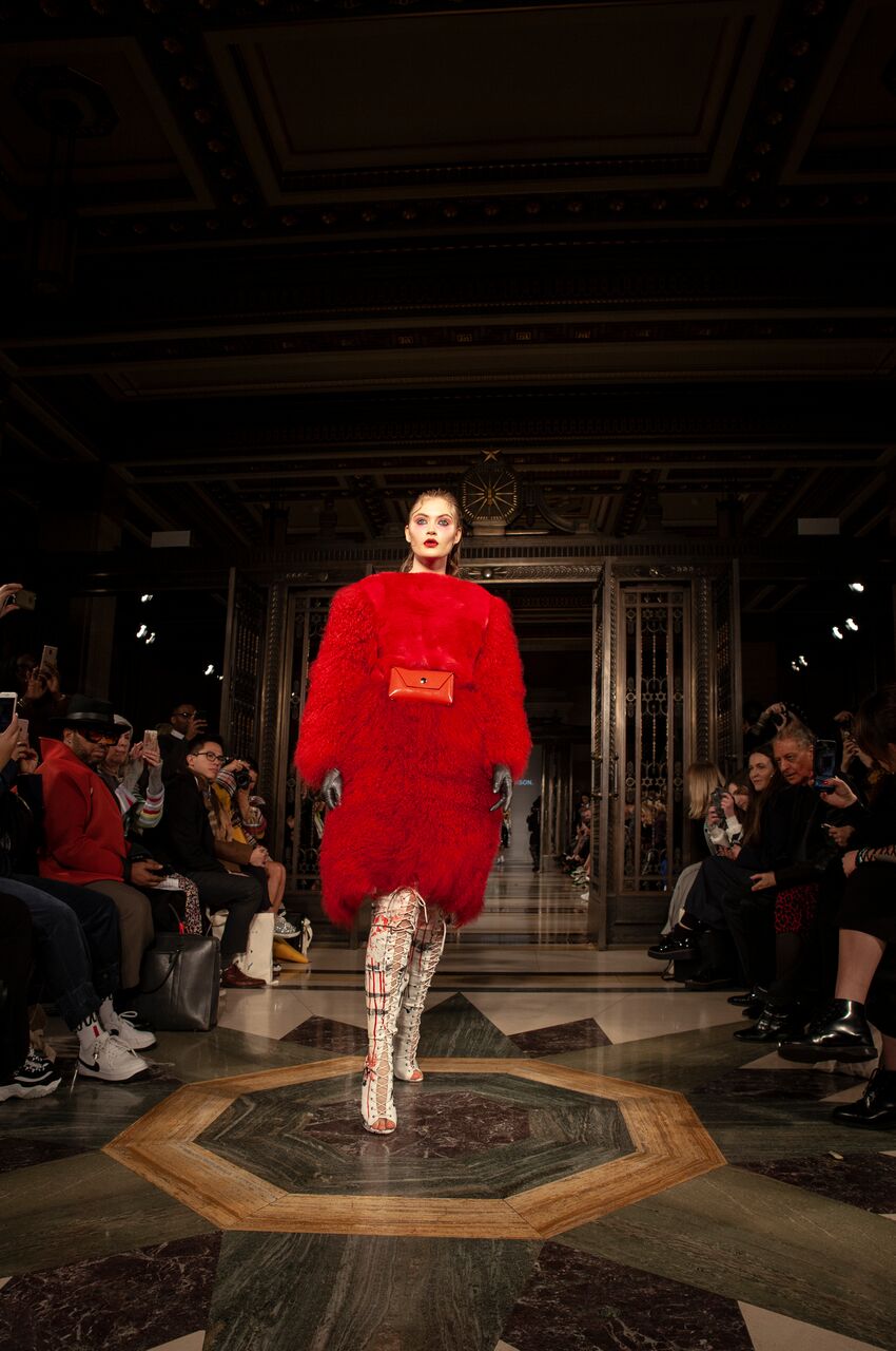 J’ayne AW19 integrates hand-painted leathers with engineered hand-drawn digital prints, luxe woven painted fabrics, silks and draped leathers, with delicate hand embroidered tulle, mesh and lace, silk jersey and lace lingerie which are contrasted with structured architectural silhouettes. The colour pallet is rainbow brights including; shaggy shearling in pink, yellow, orange, red, black and white, lamb nappas and a pop of primary red leathers. This season Pierson also collaborates with leading sports brand, Skechers, who are taking sport shoes in an entirely new and innovative direction.