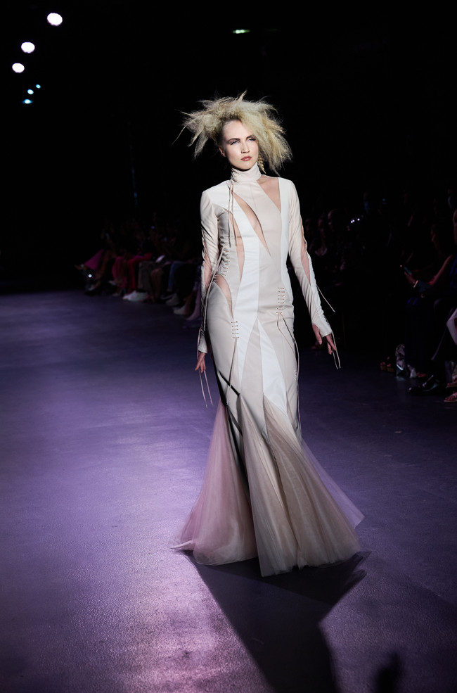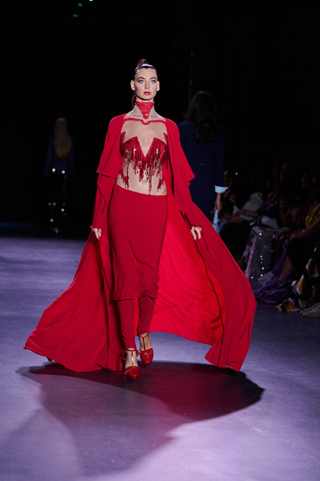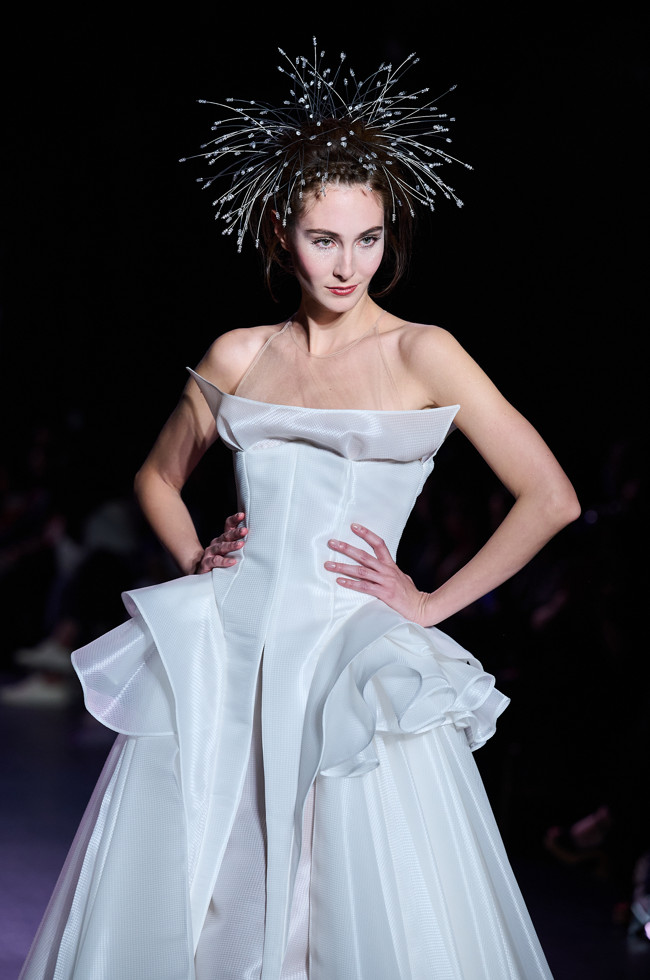 Julien Fournié is happy show his collection on the runway again. Without forgetting the past and recent crises, he presents today his vision for the future. Faced with the foolishness of fashion trends, the French couturier pretends that cut, refinement and beauty still make it possible to transform our vulnerability into weapons and change our perspective to approach the world.