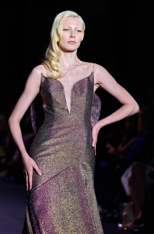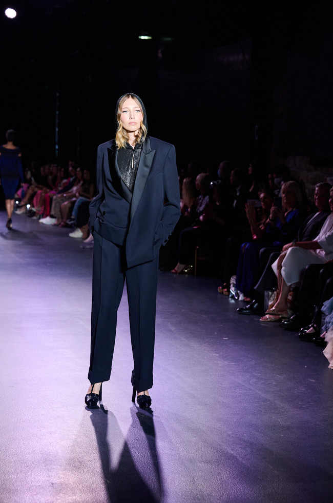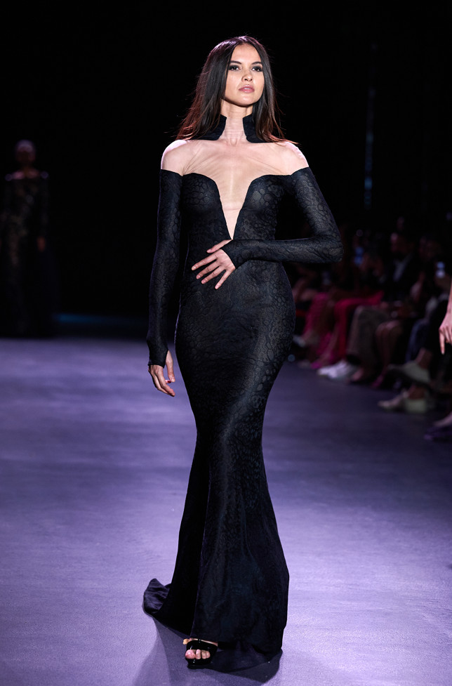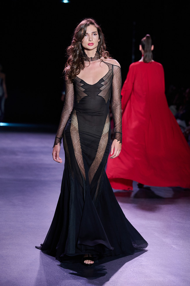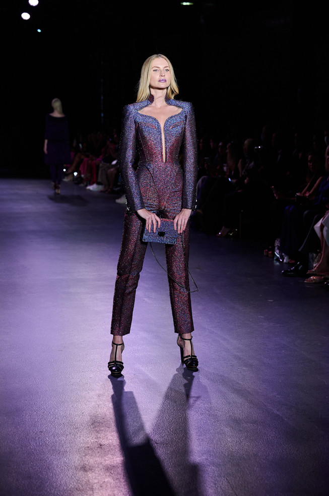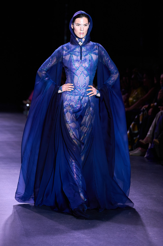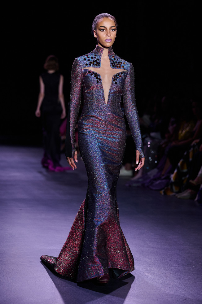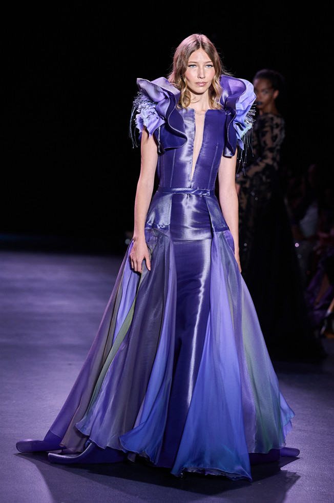 In his color palette for the season, Julien Fournié makes shades of black and midnight blue sing. He also chooses to weave metallic coloured threads together, moulds bodies into 3D silk jersey, translates the skin of the oceanic creatures he cherishes here into the pattern forming the mesh of a fine jersey, and emphasizes the skin with a sheer fish scale embroidery on a “nude” tulle sheath, uses organza to depict the iridescence of light when it is reflected in the pelagic space.